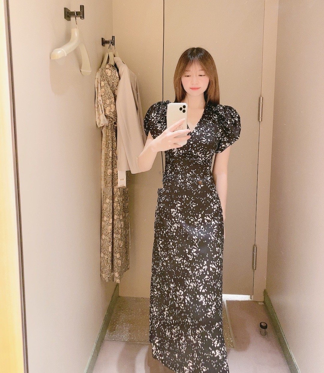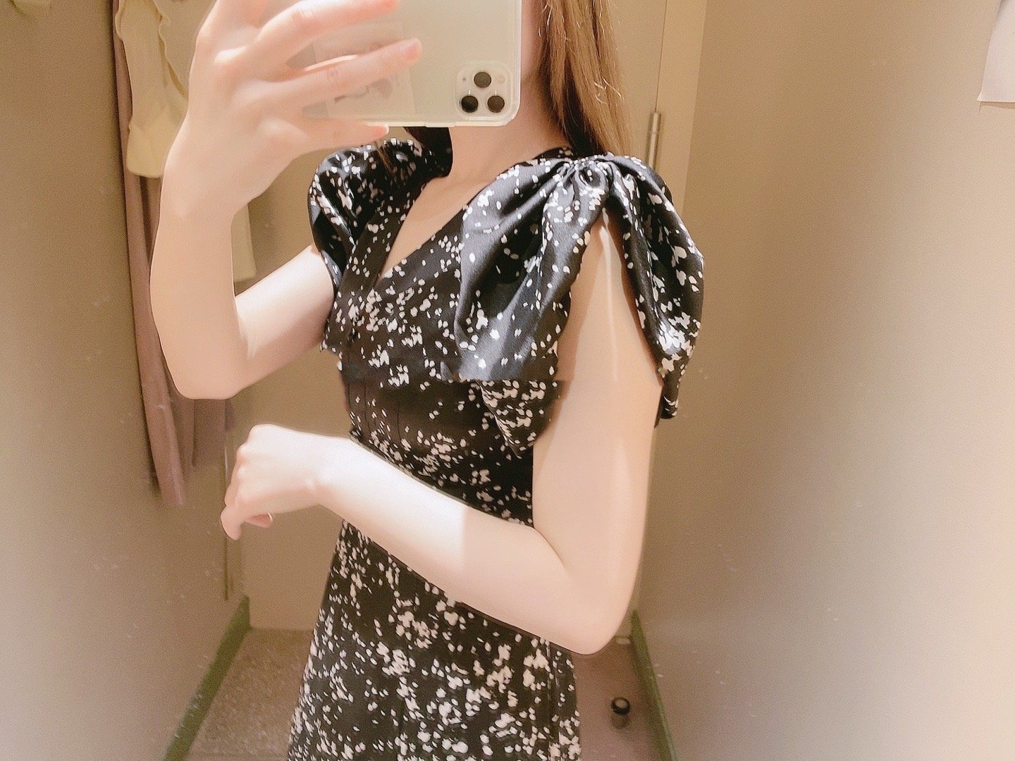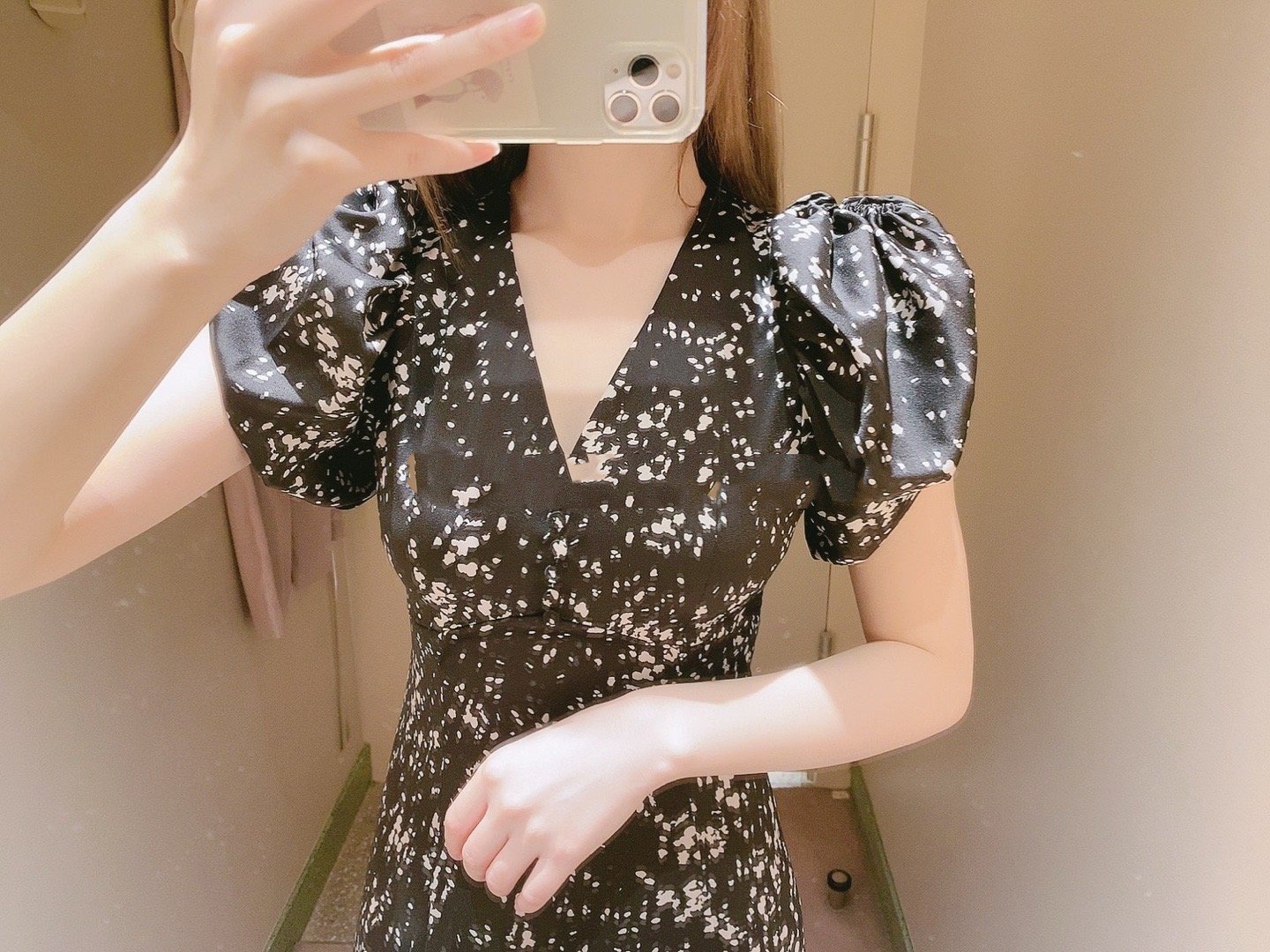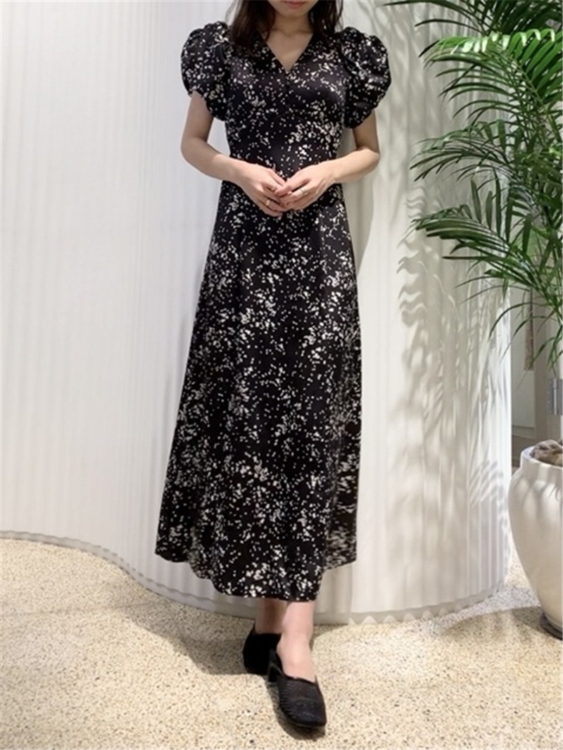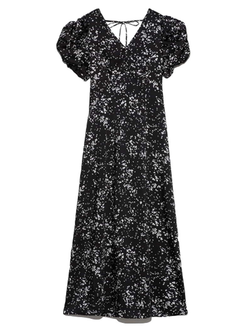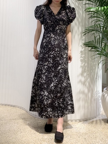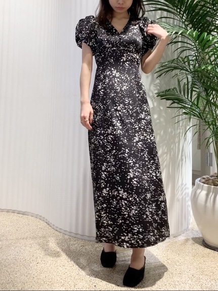 【美しいナローシルエットと構築的なパフスリーブが魅力のプリントワンピース】