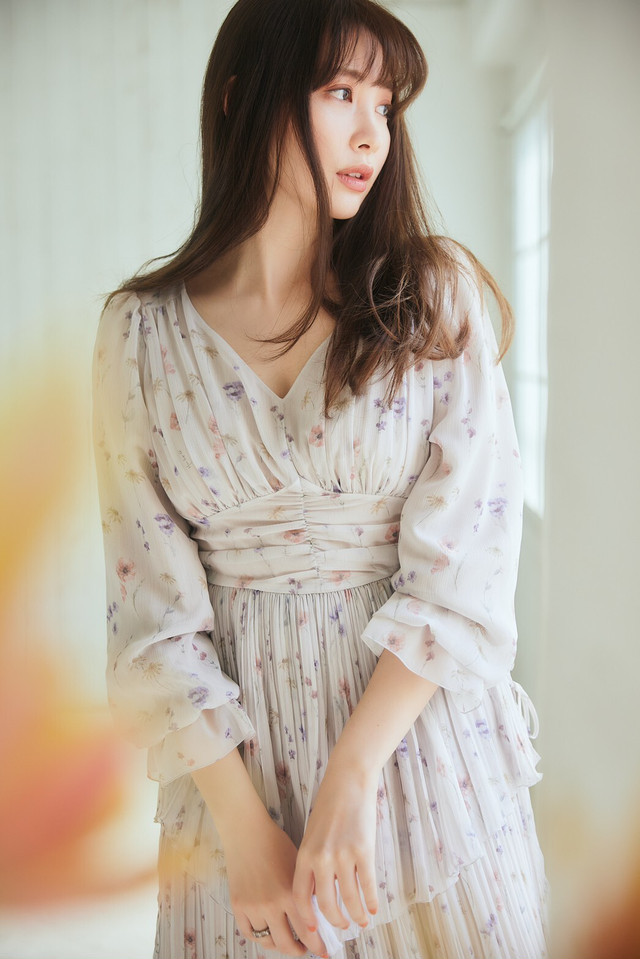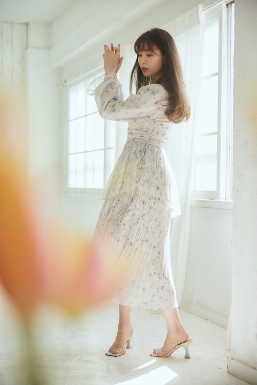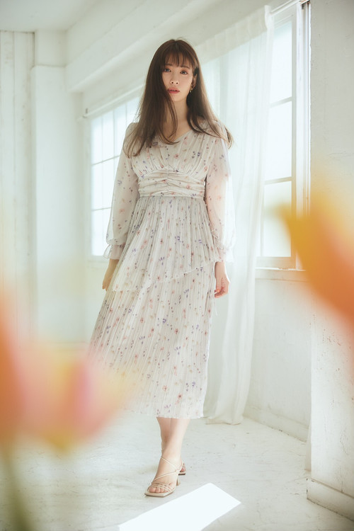 スカート部分にはランダムプリーツを配し、胸下の切り替えがスタイルアップに魅せてくれるアイテムです。