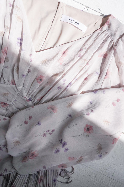 ソフトな水彩画タッチのフローラルとブランドロゴを織り交ぜたHer lip toオリジナルプリントのドレス。