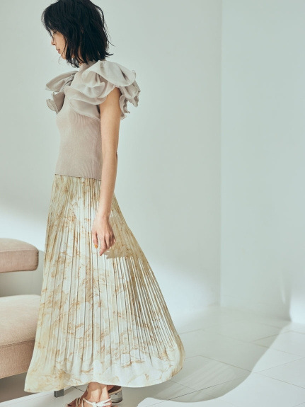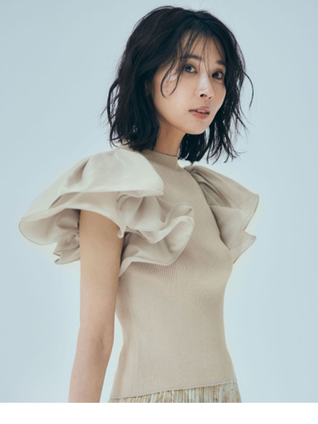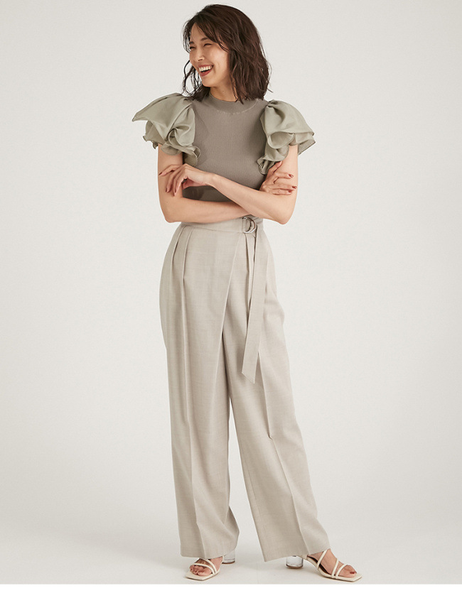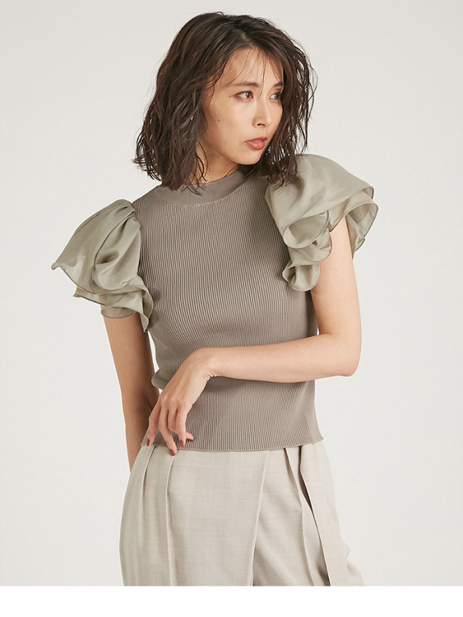 袖にタック、ギャザーでたっぷりとフリルを施し、ブラウスのような感覚で着られるドレッシーなニットプルオーバーです。
