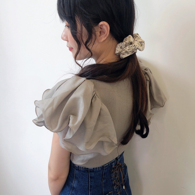 コンパクトな身頃に対して、袖はシアーな素材を二枚重ねており、縁にワイヤーを仕込むことでボリュームをだしながらも軽さを持たせています。