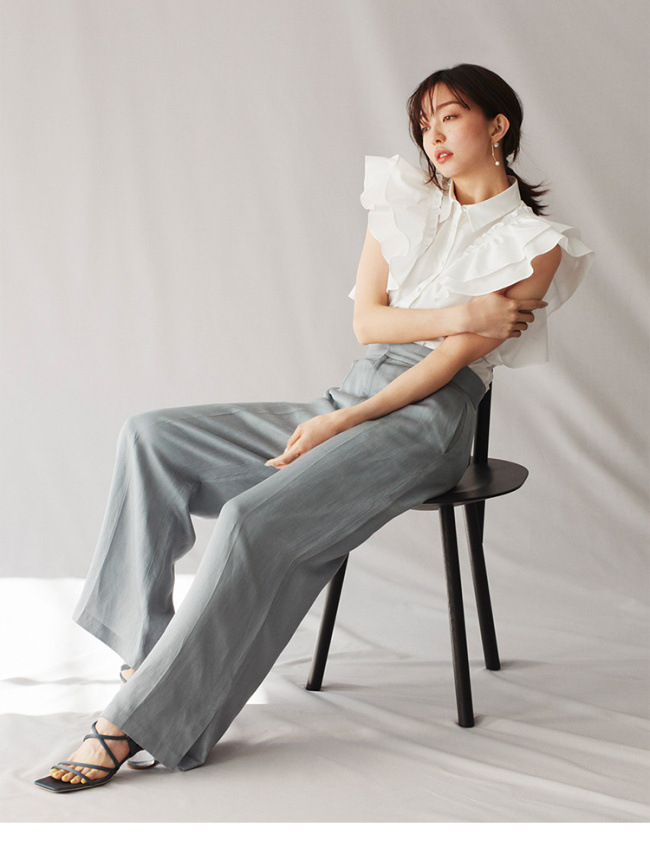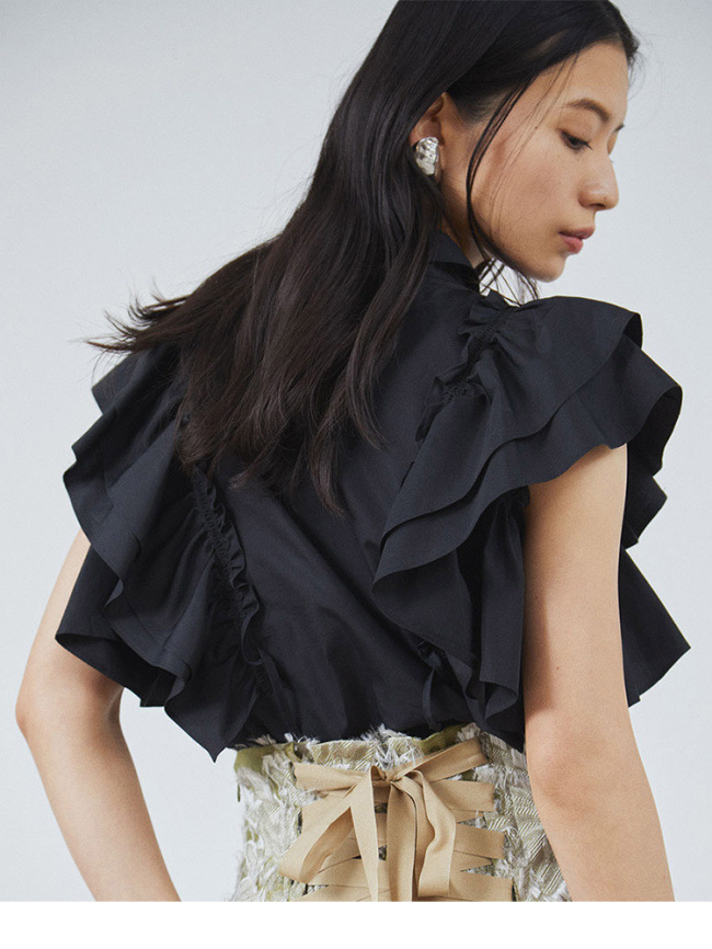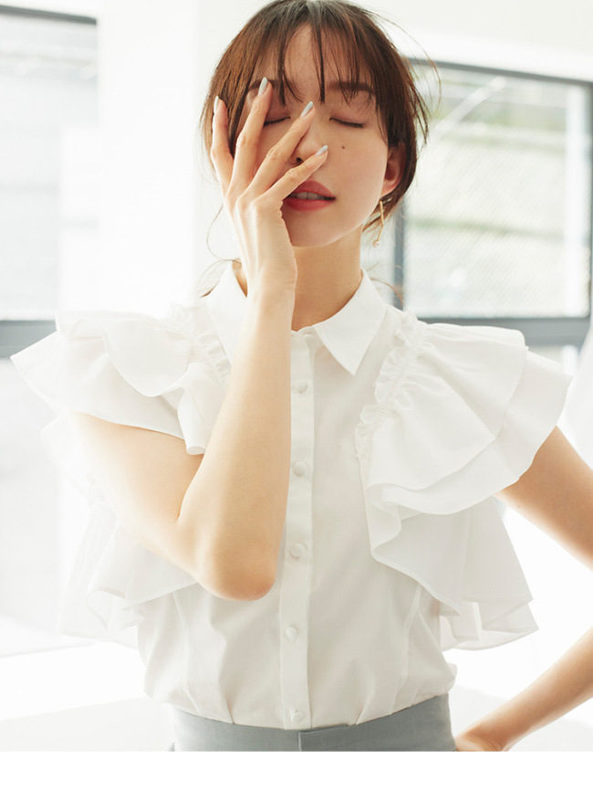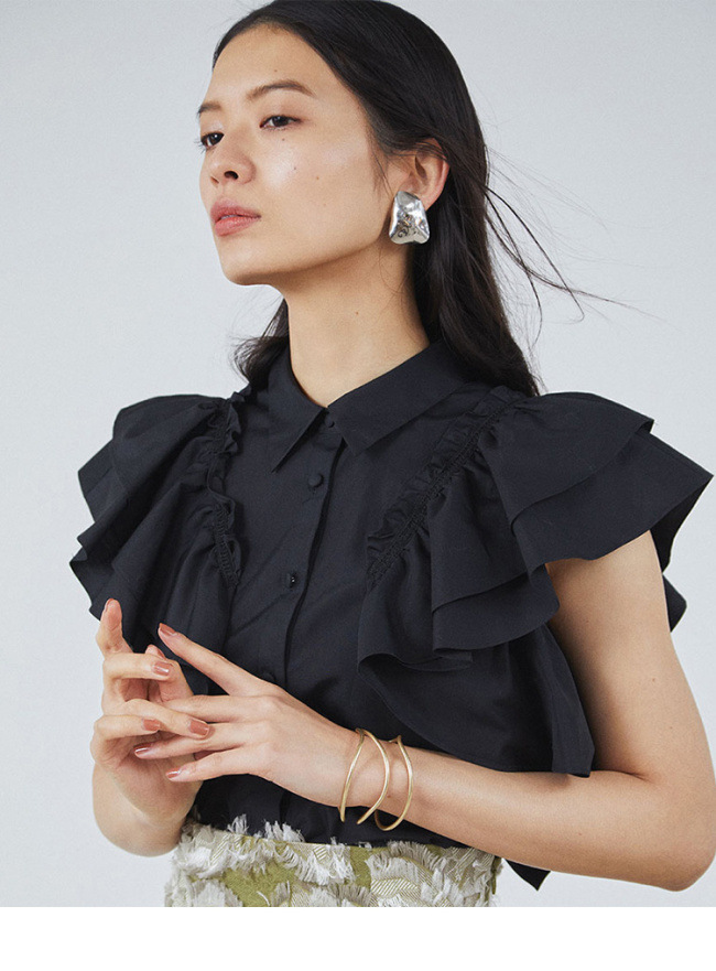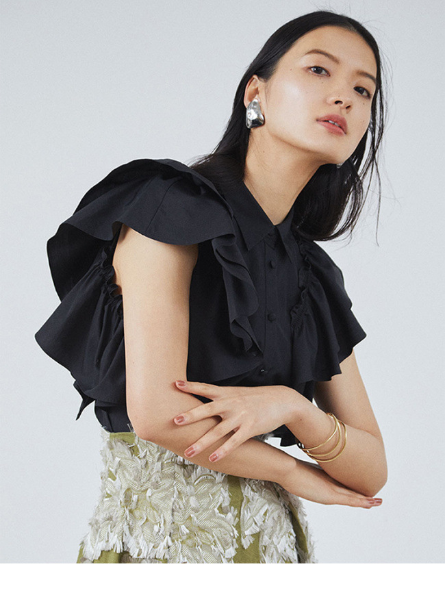 【やわらかで上品な光沢感と程よいハリ感のある上質なコットン素材を使用した華やかなラッフルスリーブブラウス】
