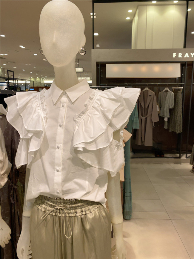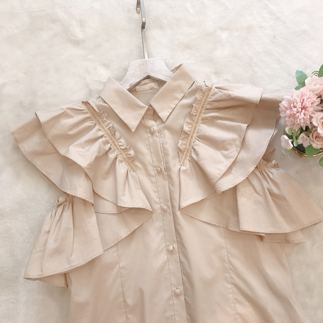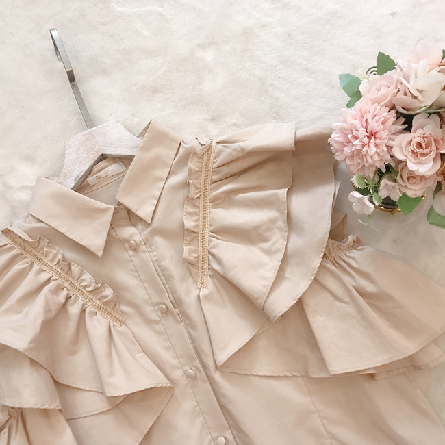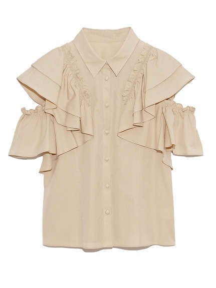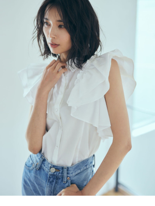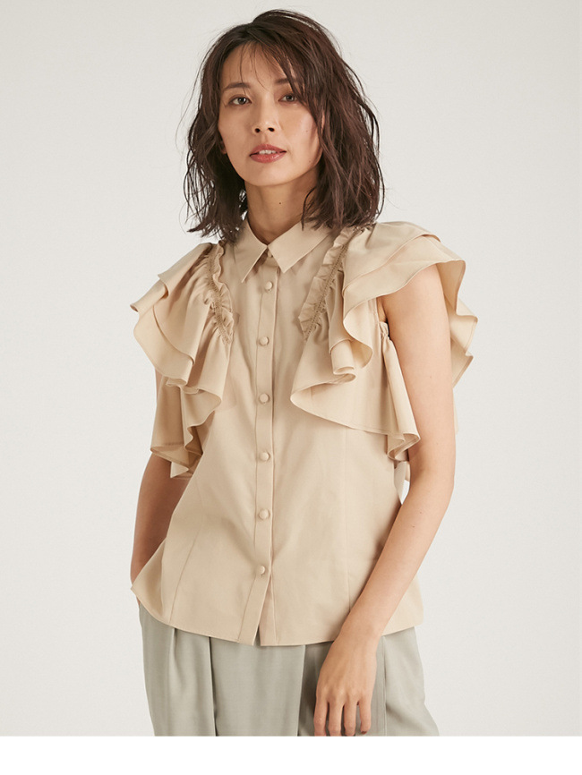 きちんと感のある襟付デザイン、フロントのくるみ釦、ギャザーたっぷりのフリルには同色のハシゴレースで奥行きのある表情を作り出し、立体的で女性らしいシルエットを1枚で表現。