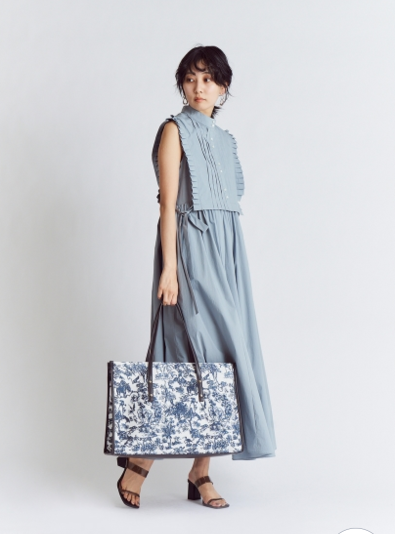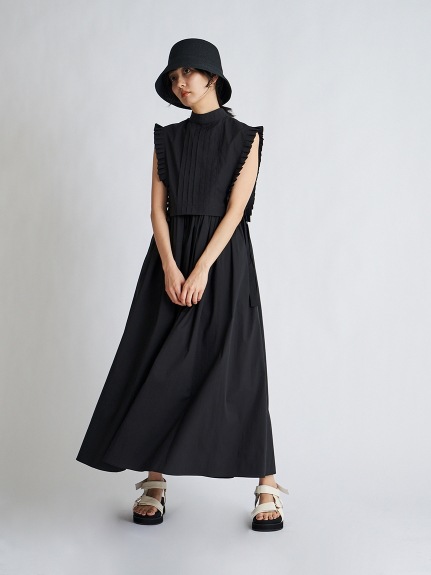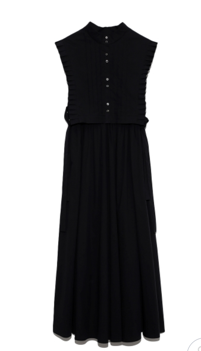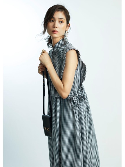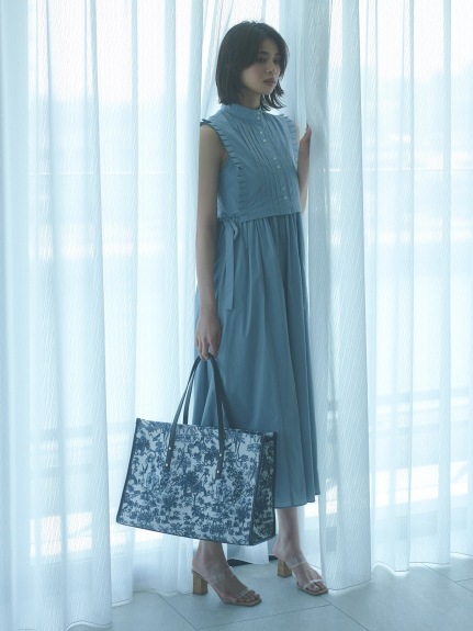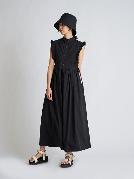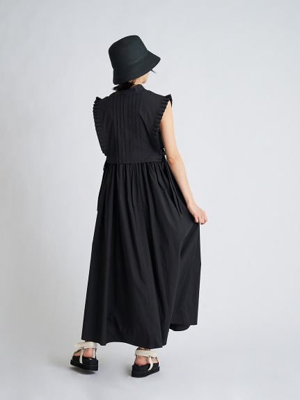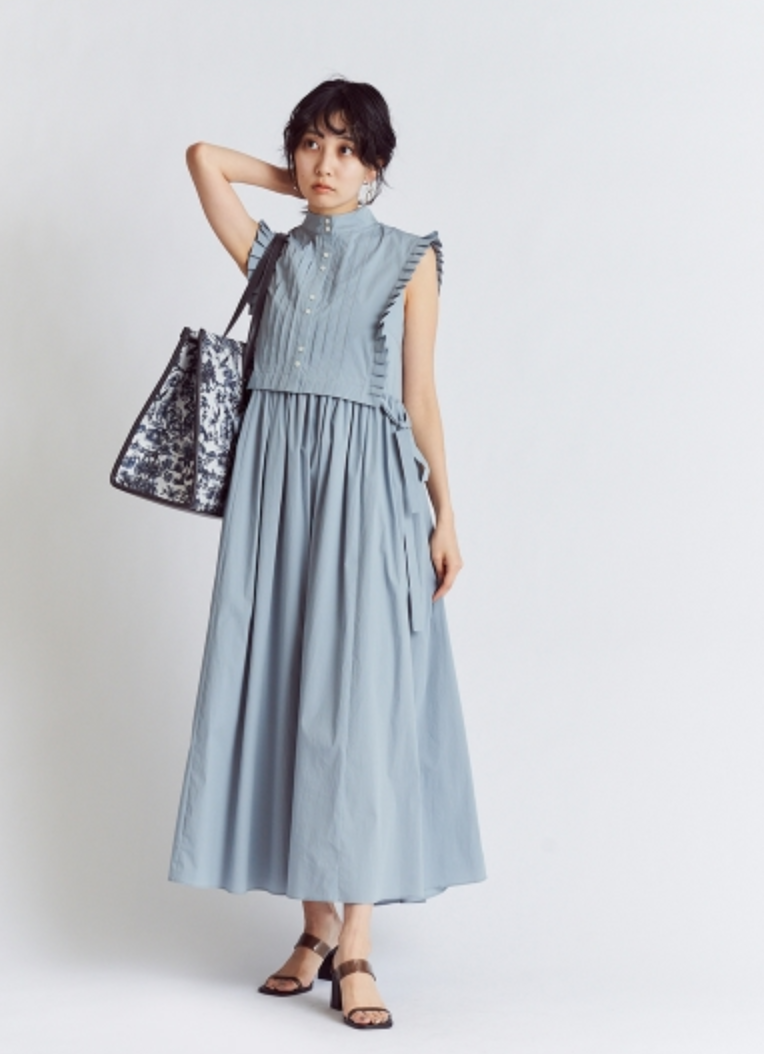 バスト下切り替えのシンプルなノースリーブドレスに、シャツ型ベストをセットにしたレイヤードアイテム。ドレスとベストは取り外しができるので、シーンに合わせて2WAYでお楽しみいただけます。スタンドカラーや袖口のプリーツ、ピンタックで品の良さを表現し、サイドに垂れるロングリボンが程良い大人の甘さを演出。ベストは前後着用も可能です。