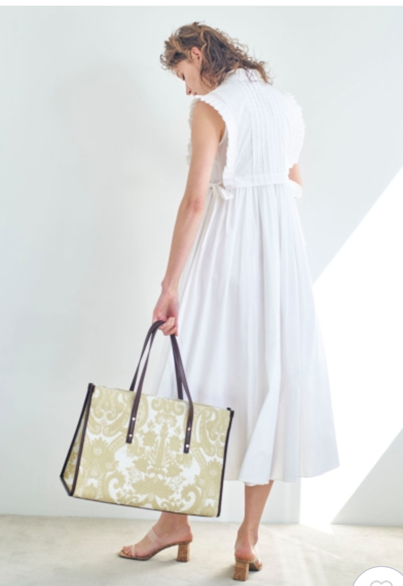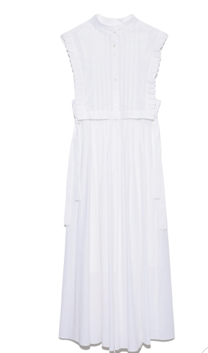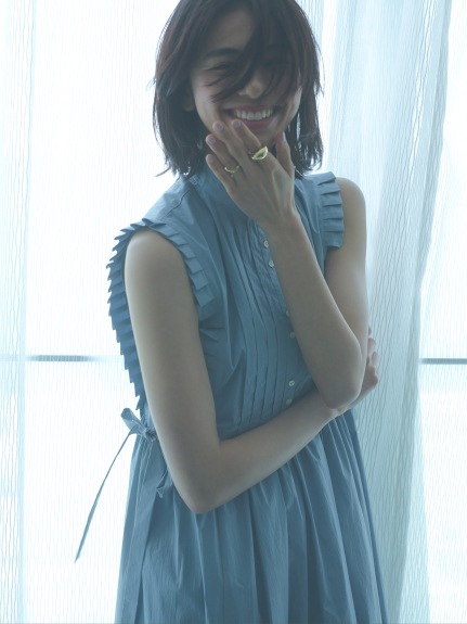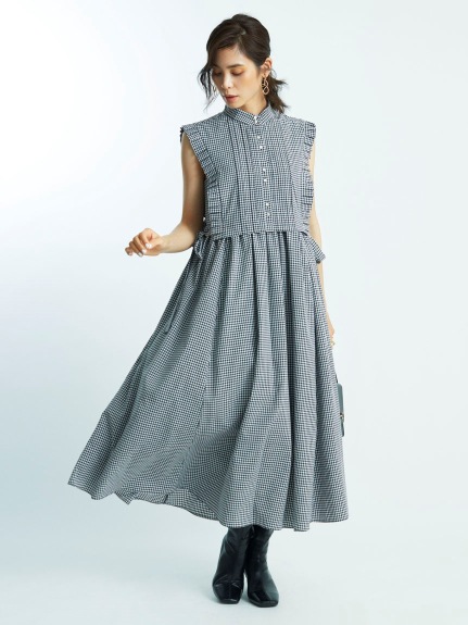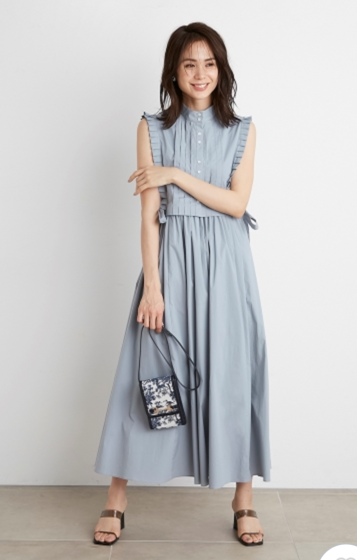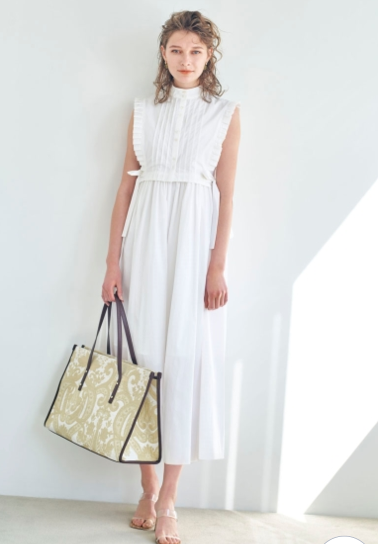 バスト下切り替えのシンプルなノースリーブドレスに、シャツ型ベストをセットにしたレイヤードアイテム。ドレスとベストは取り外しができるので、シーンに合わせて2WAYでお楽しみいただけます。スタンドカラーや袖口のプリーツ、ピンタックで品の良さを表現し、サイドに垂れるロングリボンが程良い大人の甘さを演出。ベストは前後着用も可能です。