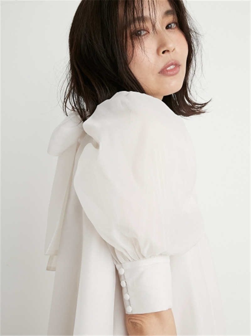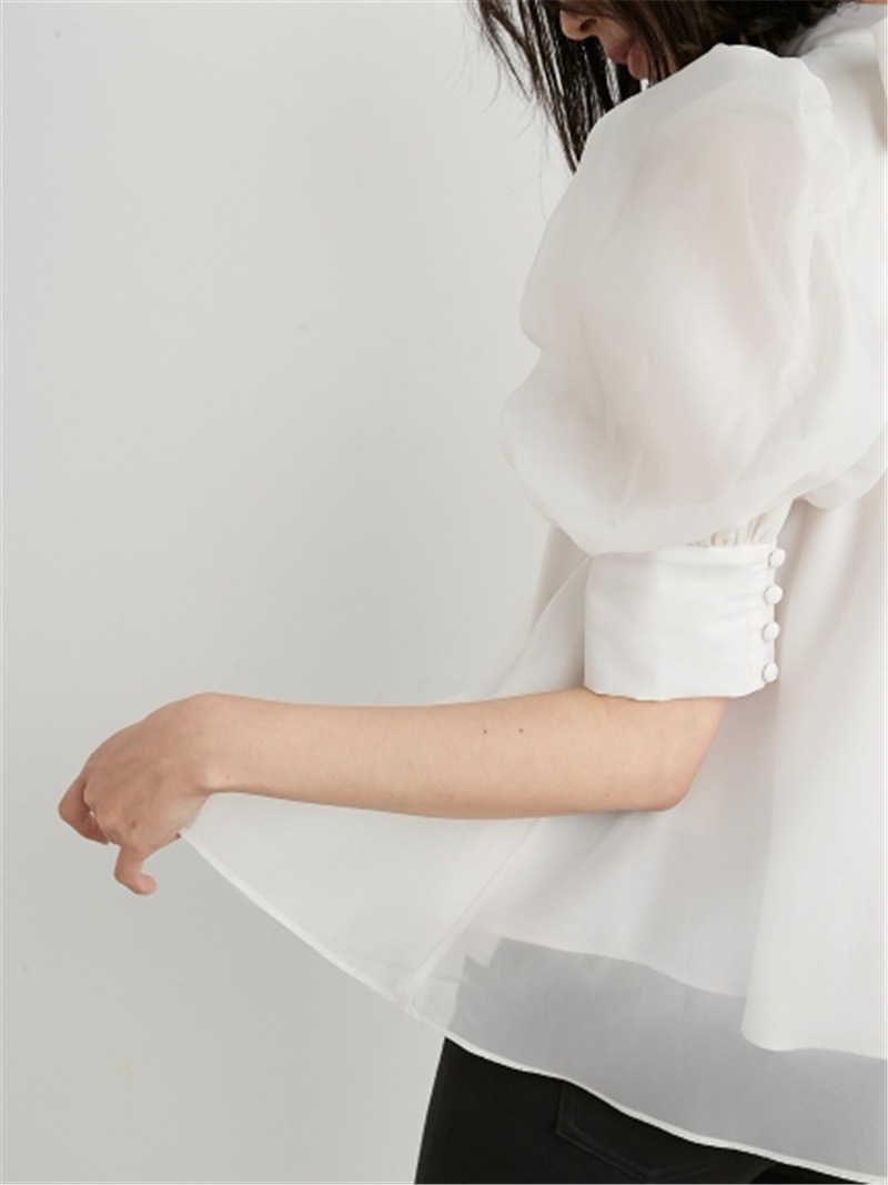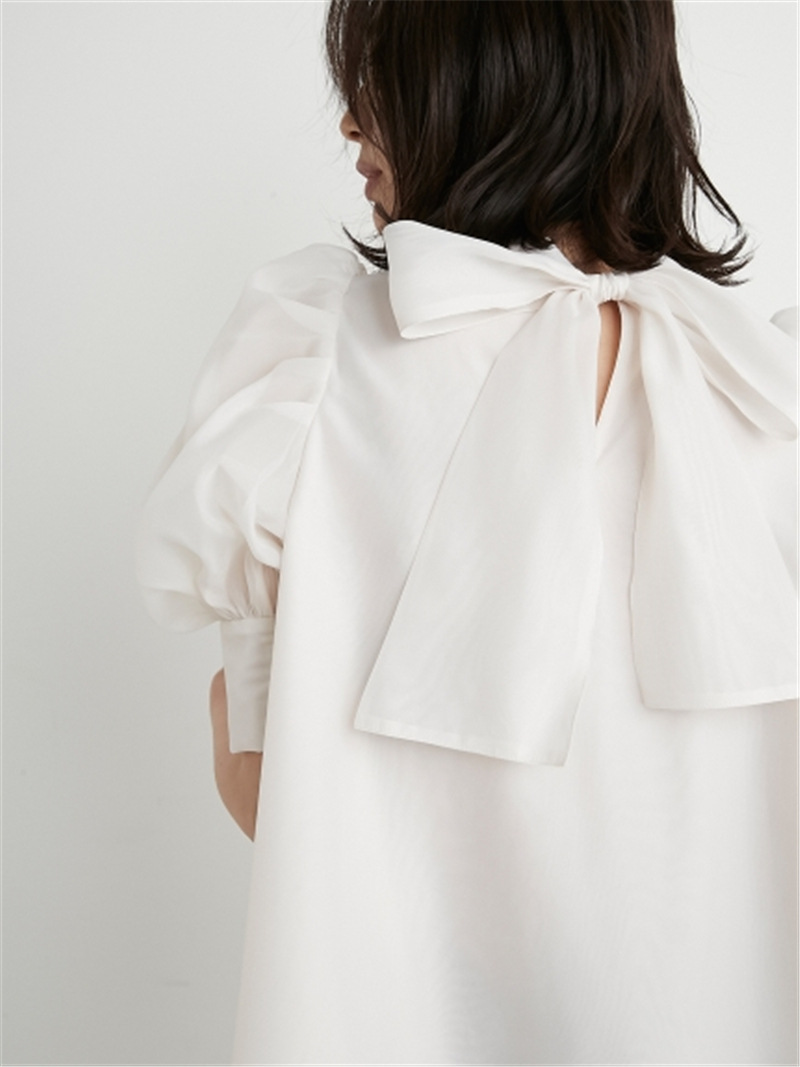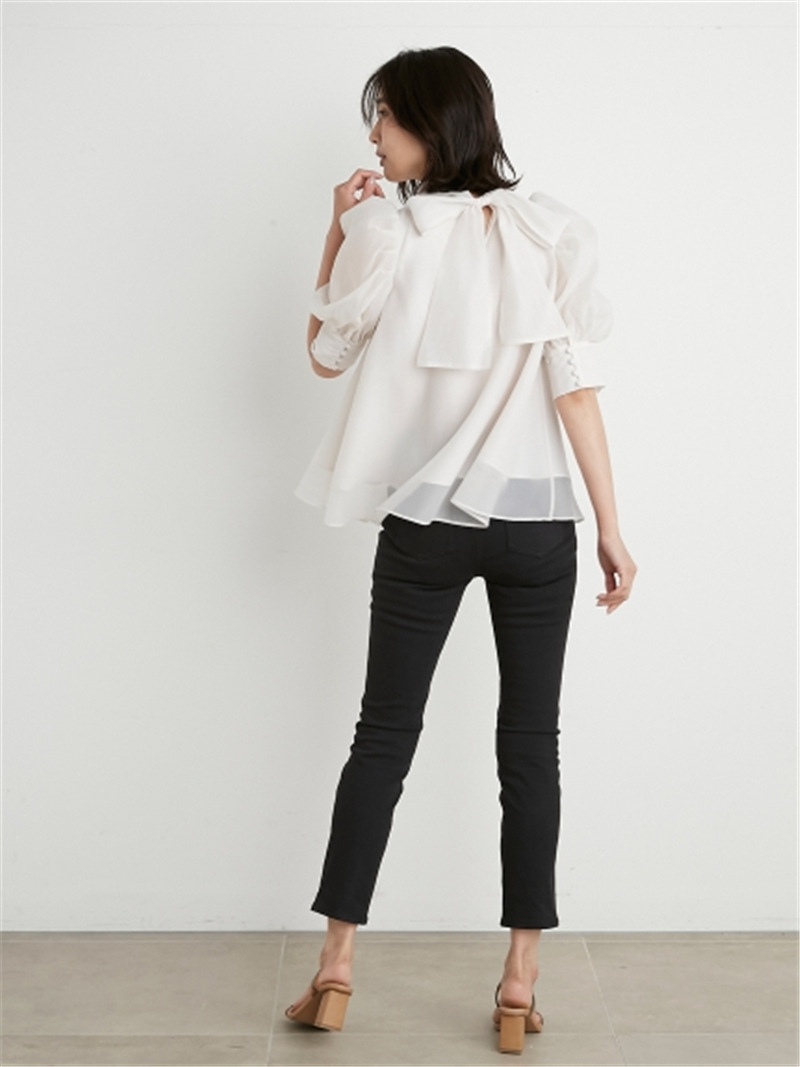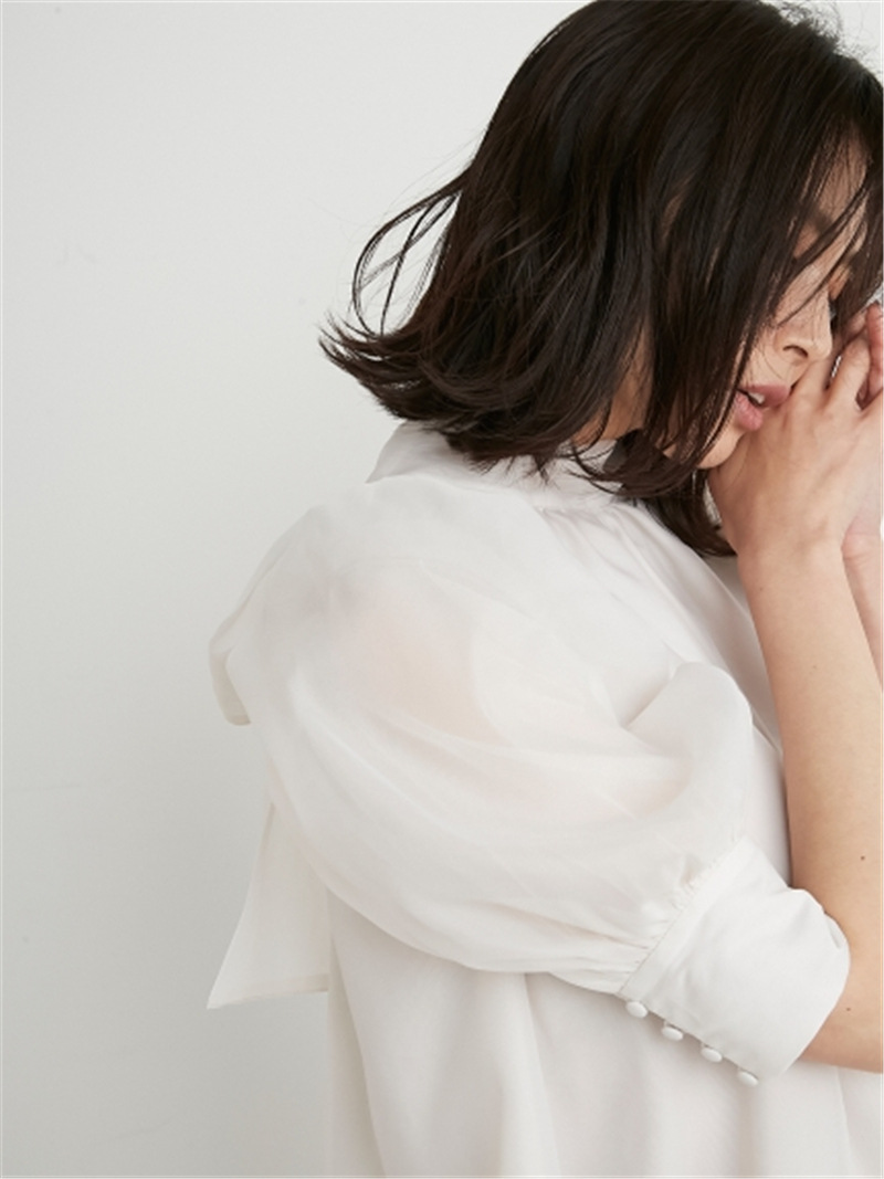 前回大人気だったオーガンジーシースルーブラウスが、半袖になって再登場。品の良いスタンドカラーとバックリボンのギャップが美しく、Aラインに広がるフレアシルエットで柔らかな印象に仕上げています。一際目を惹くボリュームスリーブは、内側にチュールを施すことでシアー感と立体感をどちらも実現。IN/OUTどちらにも対応できる、ジャスト丈でデザインしました。