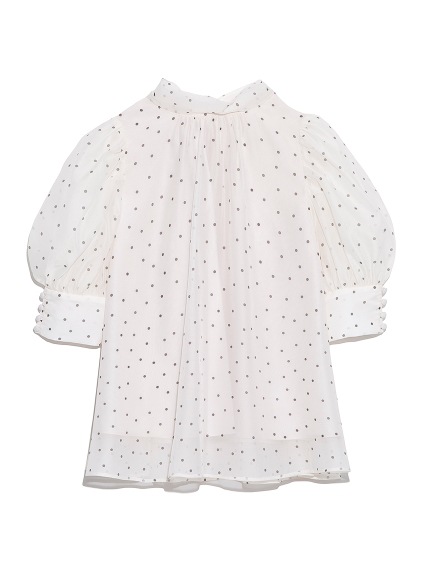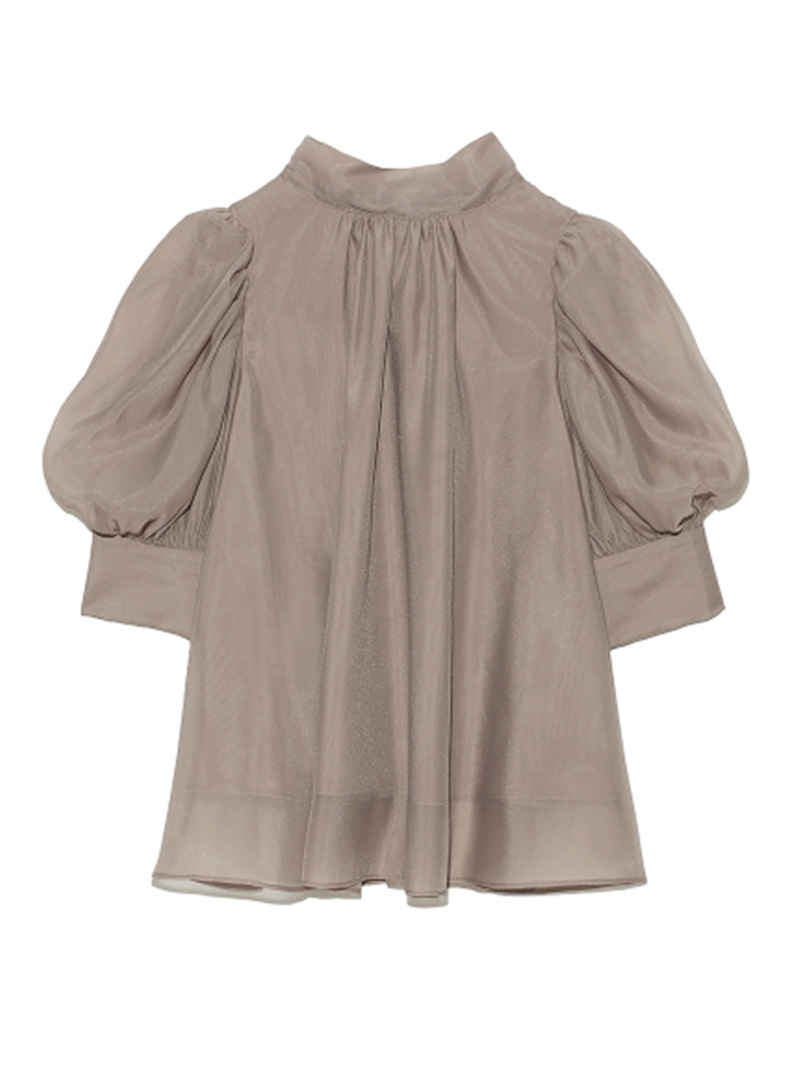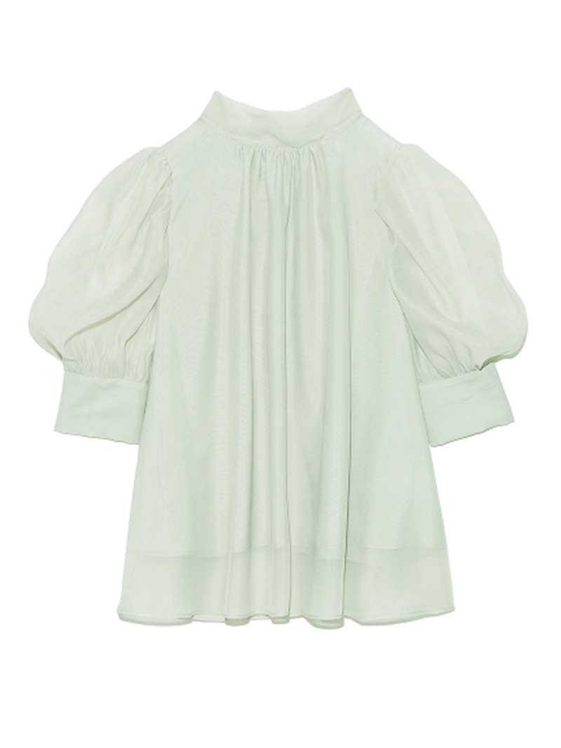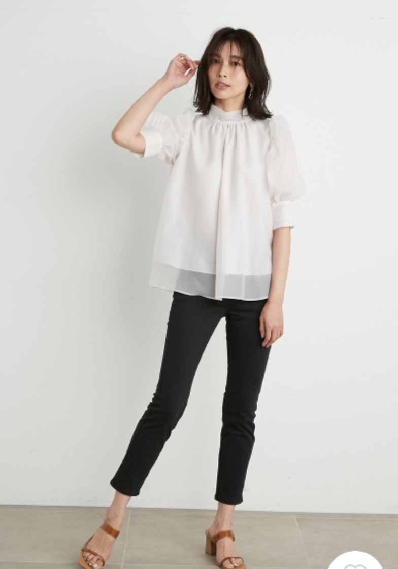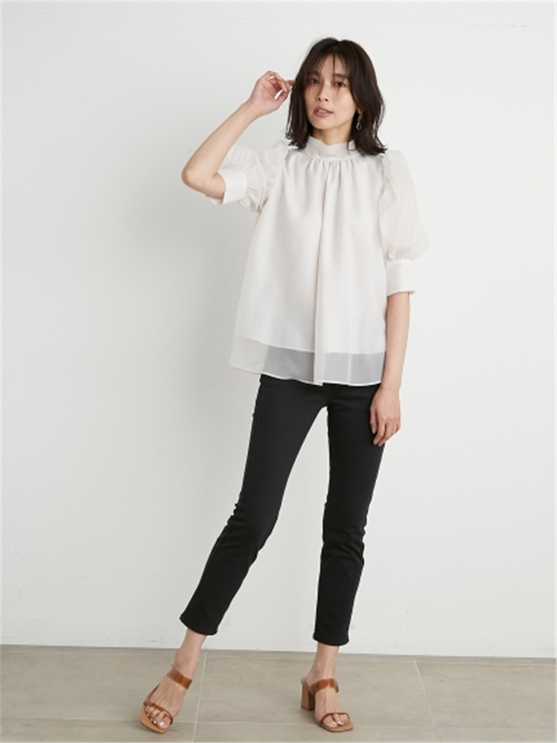 前回大人気だったオーガンジーシースルーブラウスが、半袖になって再登場。品の良いスタンドカラーとバックリボンのギャップが美しく、Aラインに広がるフレアシルエットで柔らかな印象に仕上げています。一際目を惹くボリュームスリーブは、内側にチュールを施すことでシアー感と立体感をどちらも実現。IN/OUTどちらにも対応できる、ジャスト丈でデザインしました。
