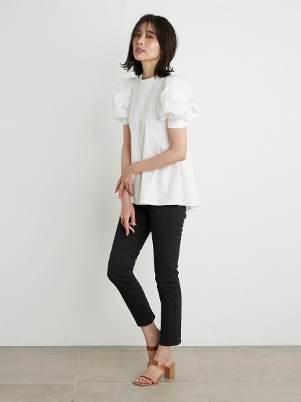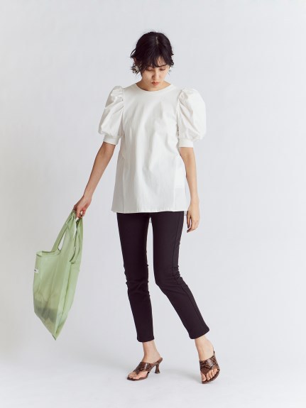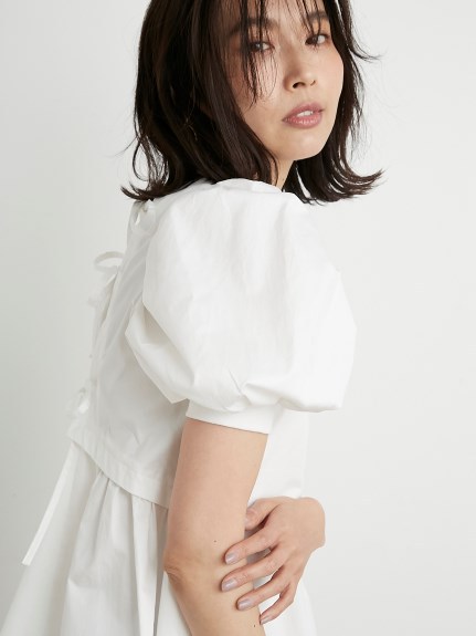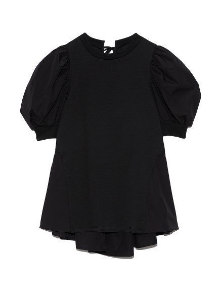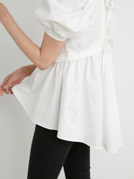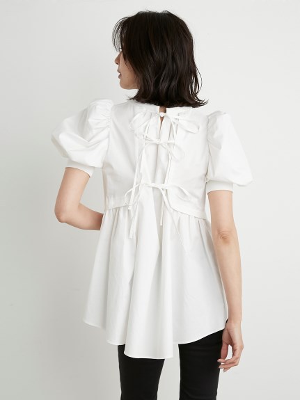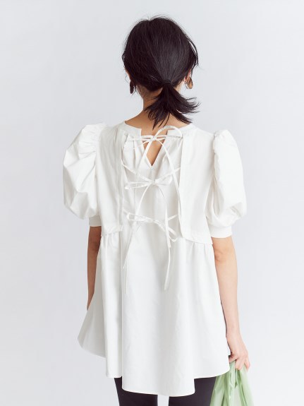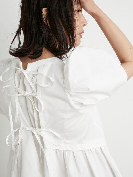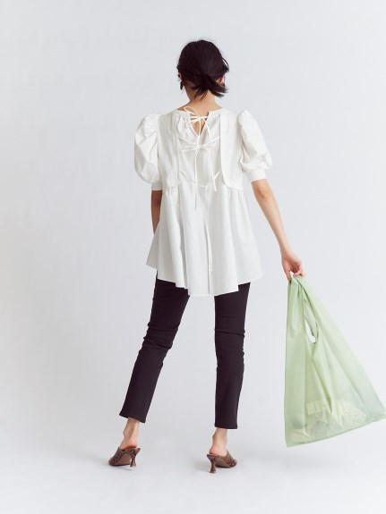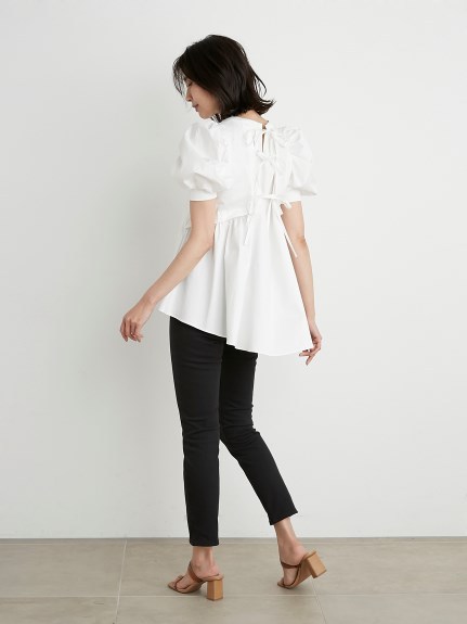 凛と華やかな印象のパワーショルダーに心惹かれるチュニックトップス。バックはやや張りのあるコットン素材で切り替え、ギャザーやフレアをたっぷりと加えてボリュームを出し、モードな印象に仕上げました。フロントとのギャップも魅力的に、バックリボンを細くすることで甘くなりすぎないよう引き算しています。細身のパンツに合わせ、大人カジュアルな着こなしをお楽しみください。