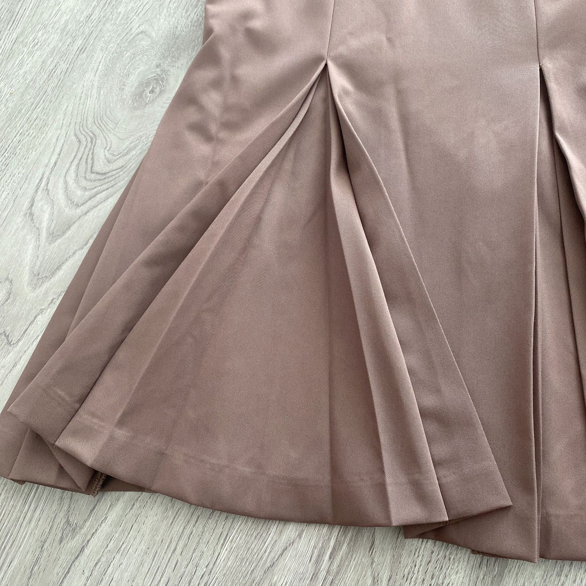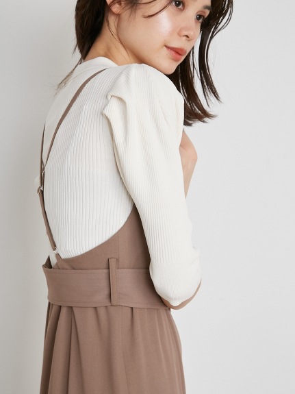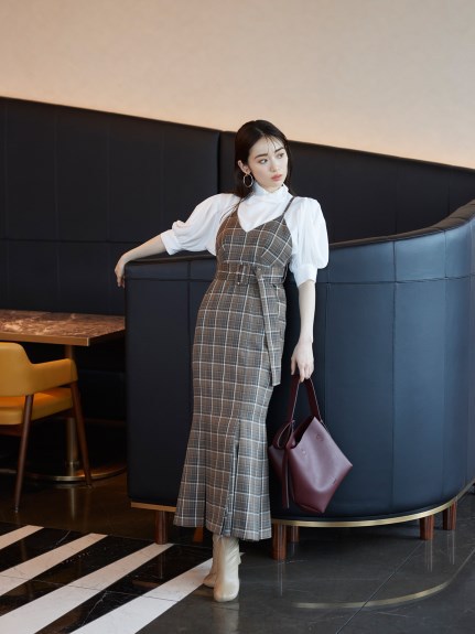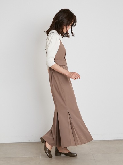 マーメイドシルエットのスカートが、レディライクに魅了するキャミソールワンピース。華奢なストラップや大胆なVネック、大きく開いたバックスタイルなど、女性らしいディティールを各パーツに表現しました、アクセントになる太ベルトは、きゅっと締めてウエストマークすればスタイルアップに貢献。膝下切替えのプリーツが歩く度に広がり、華やかな印象です。肩紐は長さ調節することができ、合わせるトップスの邪魔をしない細さでコーディネートしやすく仕上げました。