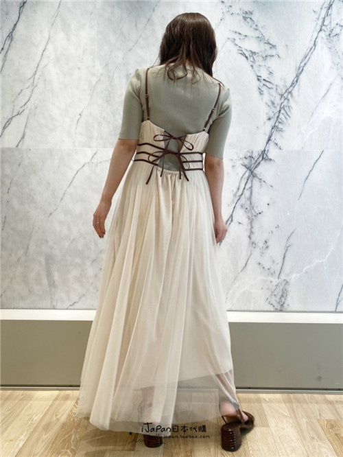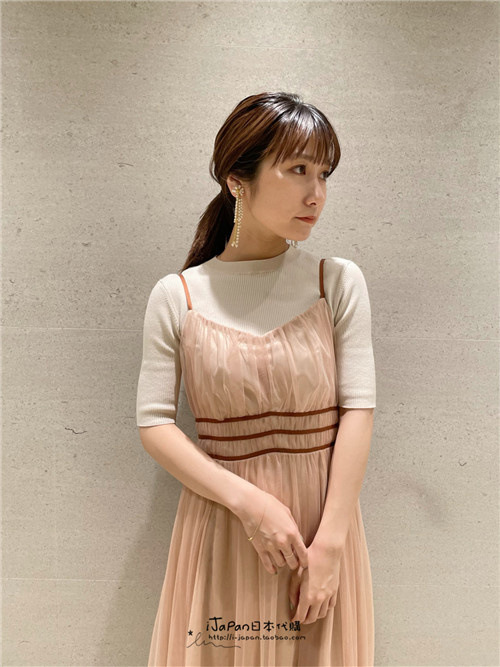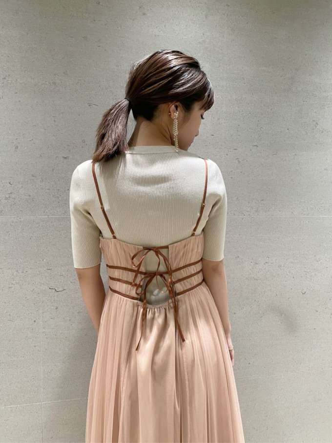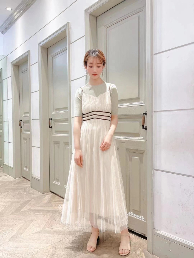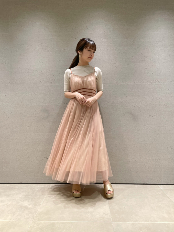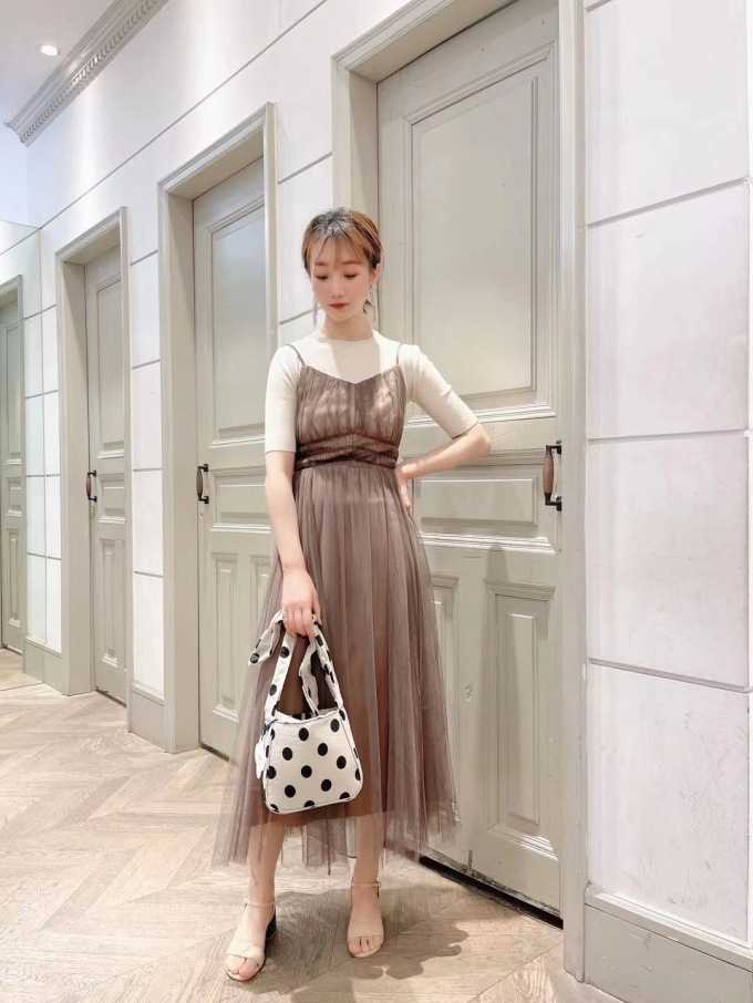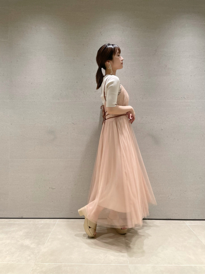 ワンピースは、空気を含むようなエアリーなチュール素材でお作りしました。ニットトップスはサラリとした春夏にぴったりな質感です。オフホワイト、ピンク、ブラウンの3色をご用意しました。