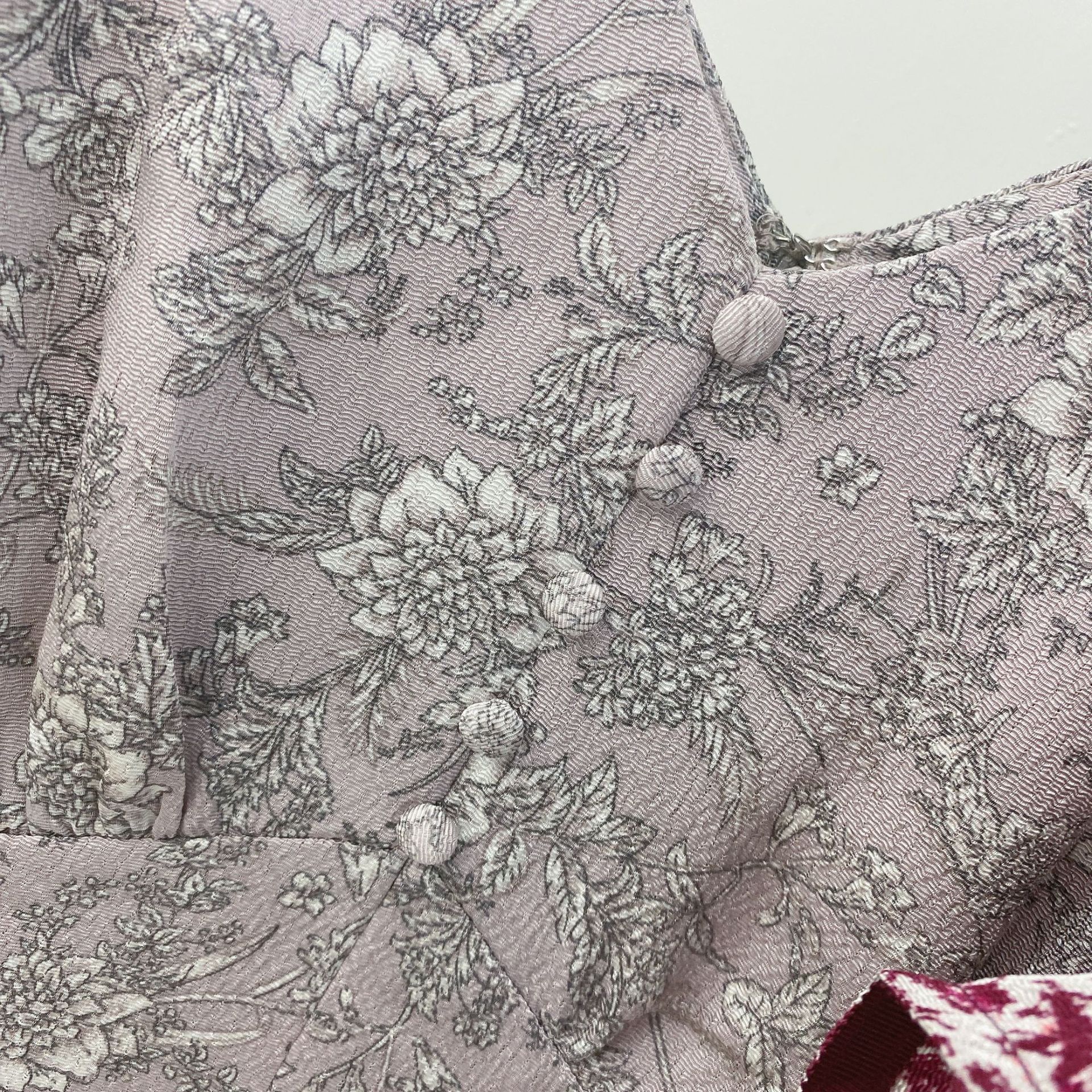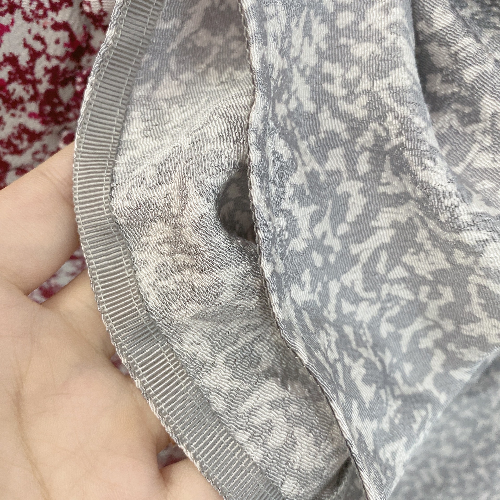 しなやかな落ち感と艶感のある縮緬生地は、シワになりにくいポリエステル素材を使用。バラエティ豊かにそろえた、変形ドットのようなライトグレー、王道な花柄のブラック、ボタニカル調のピンクベージュ、幾何柄のワインの4色展開です。