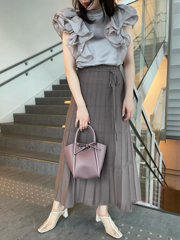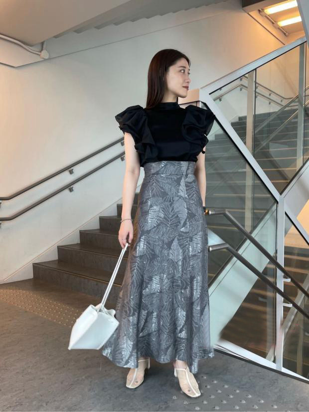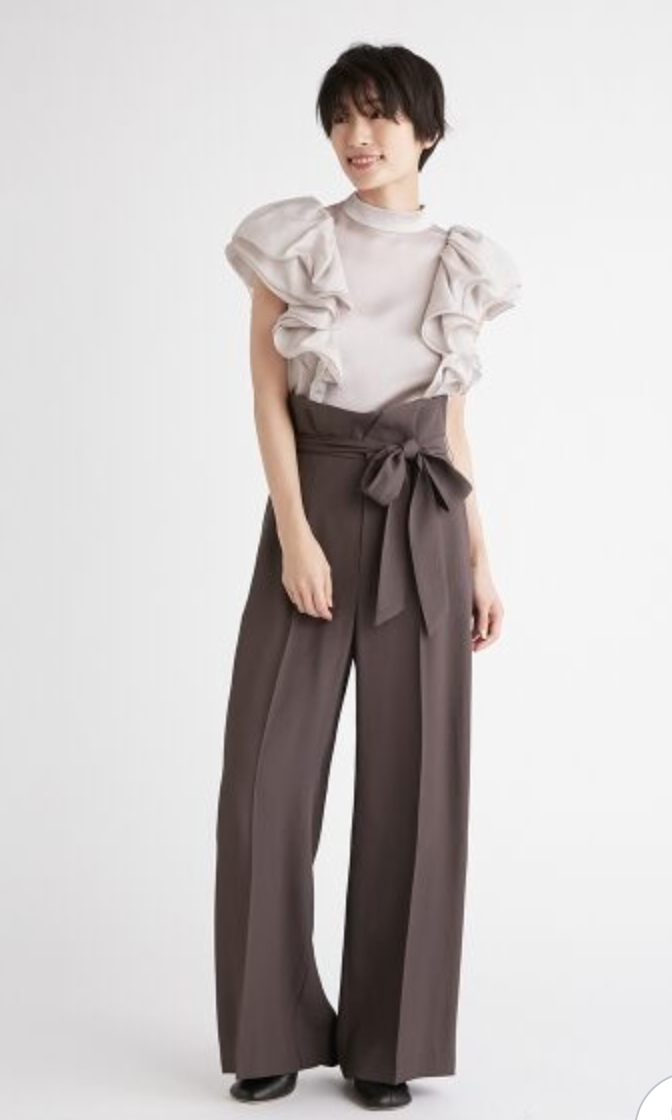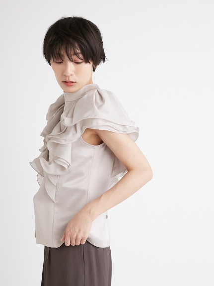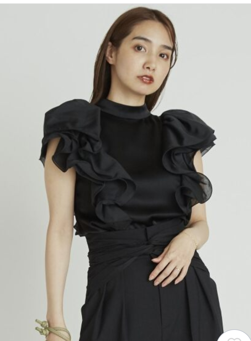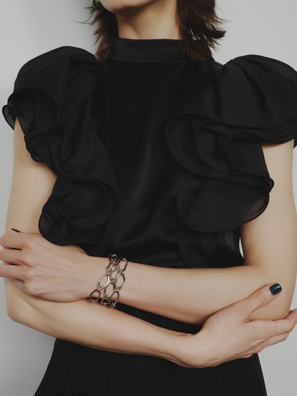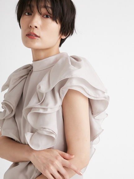 肩先が隠れるほどのボリューム感でラッフルをあしらい二の腕をほっそりと、袖の端にテグスを通す仕様で、大胆で動きのあるラッフルスリーブに仕上げました。