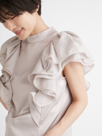 ボディラインを華奢に見えるよう肩の内側からラッフルを施し、どの角度から見てもキレイなシルエットを実現。バックスタイルは釦で着脱できる仕様です。