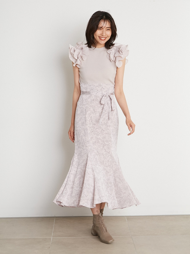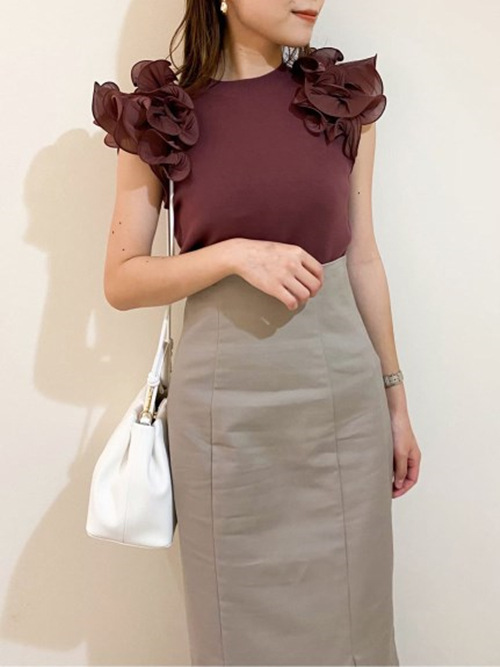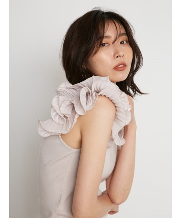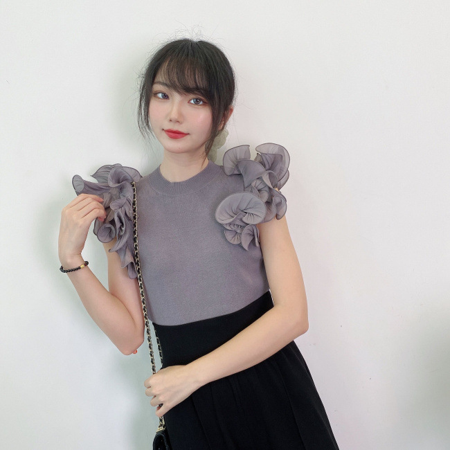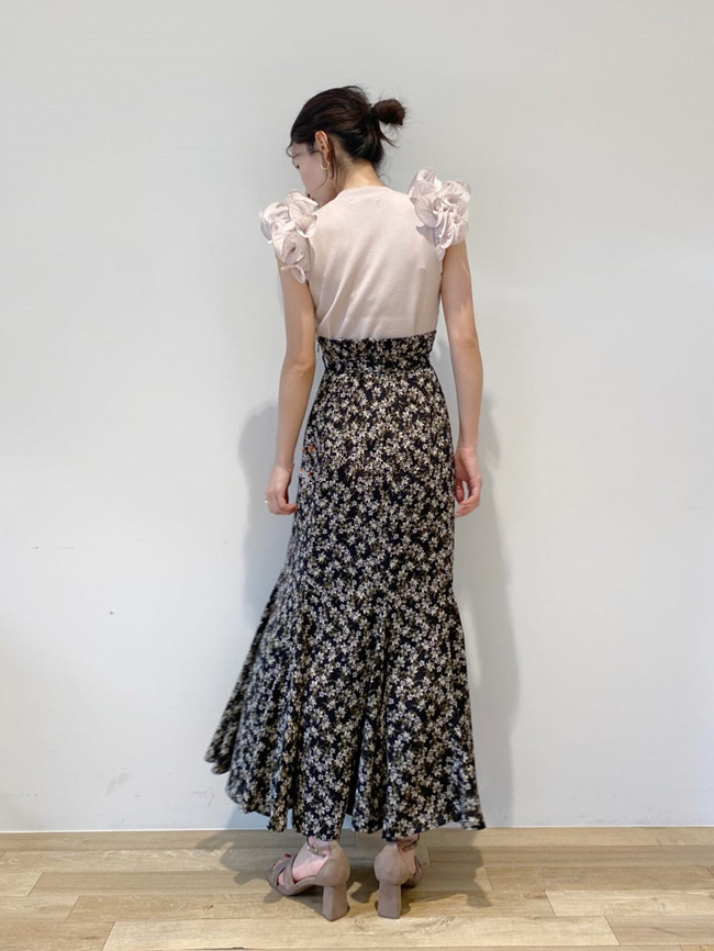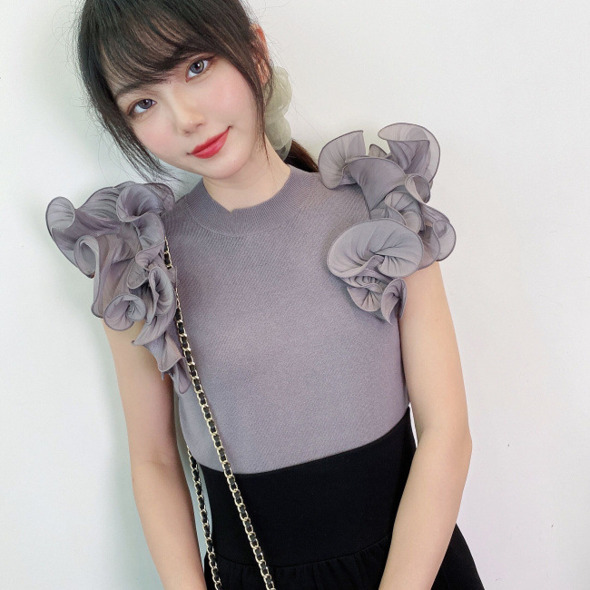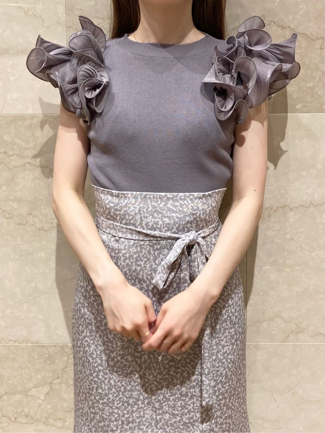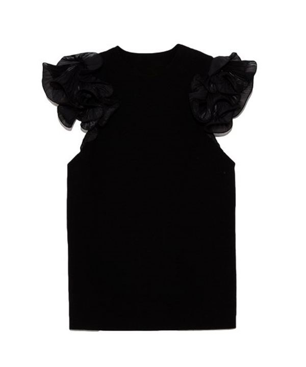 羽のように愛らしいラッフルスリーブがキャッチーなニットトップス。光沢のあるオーガンジーのラッフルとハイゲージニットを組み合わせ、ワントーンでシックにデザインしました。キーポイントとなるラッフルには、計算された様々なディティールを表現。分量たっぷりのオーガンジーのフリル先にテグスを入れることで華やかなシルエットをメイクしました。身頃をシンプルにすることで大人な印象に仕上げ、フェミニンとモードのバランスが絶妙な1枚です。