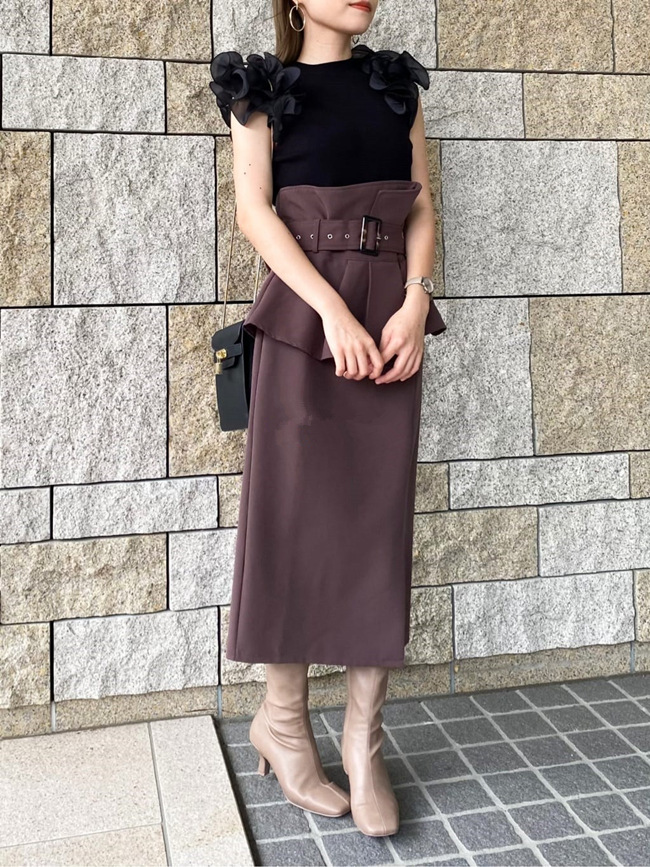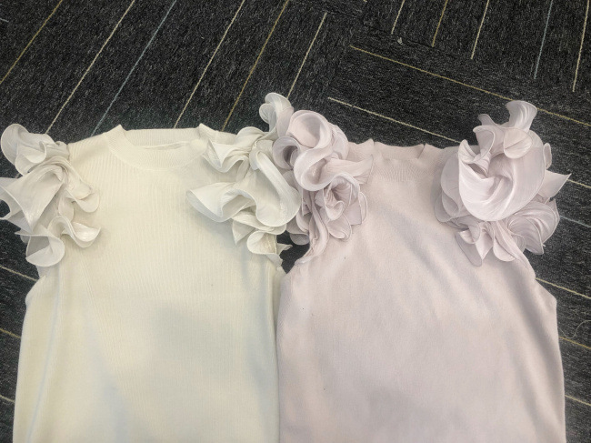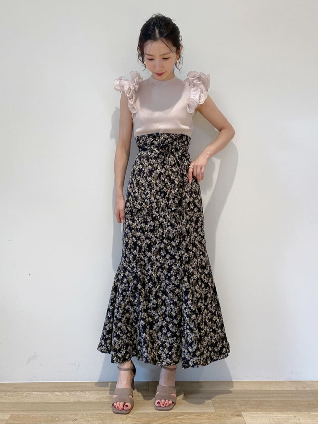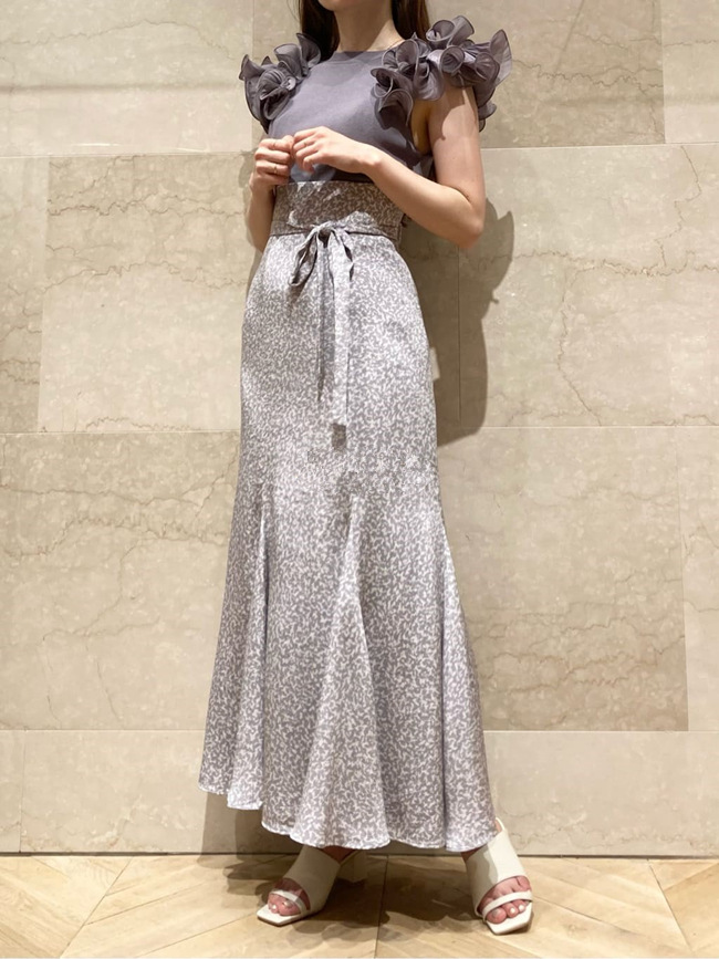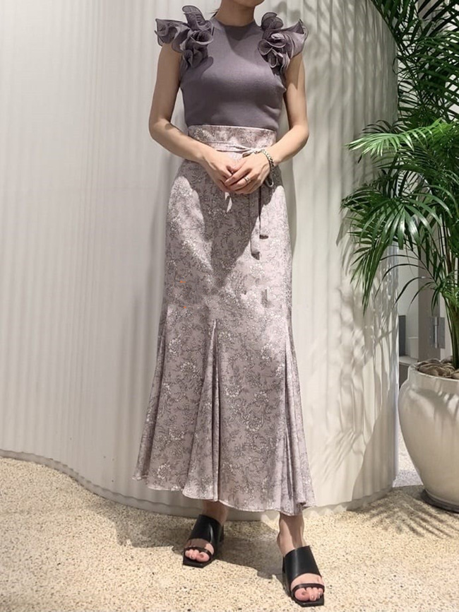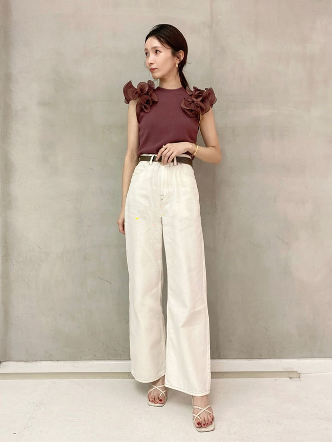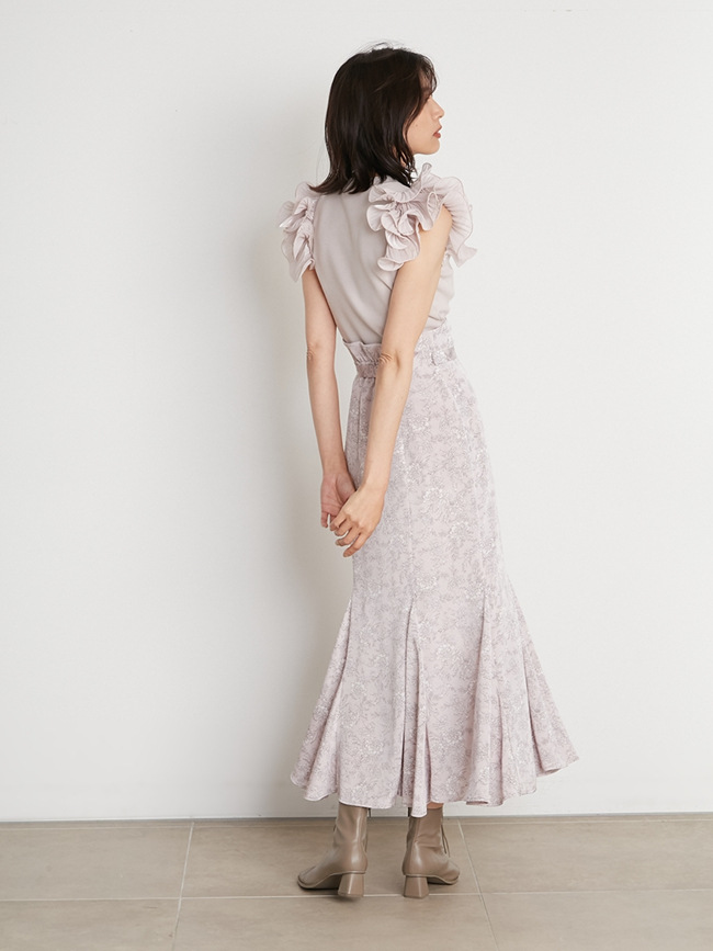 羽のように愛らしいラッフルスリーブがキャッチーなニットトップス。光沢のあるオーガンジーのラッフルとハイゲージニットを組み合わせ、ワントーンでシックにデザインしました。キーポイントとなるラッフルには、計算された様々なディティールを表現。分量たっぷりのオーガンジーのフリル先にテグスを入れることで華やかなシルエットをメイクしました。身頃をシンプルにすることで大人な印象に仕上げ、フェミニンとモードのバランスが絶妙な1枚です。