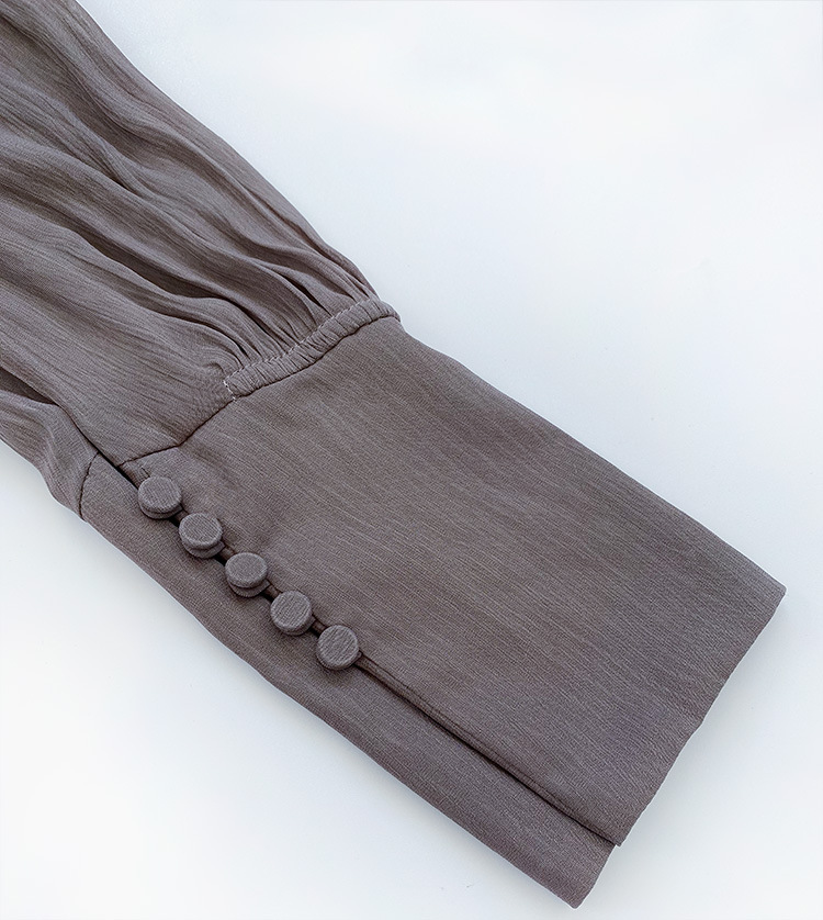 襟元の開きとリボンがポイント。バックウエストとスリーブの細めのゴムシャーリングや長めのカフスが女性らしさを際立たせてくれます。
