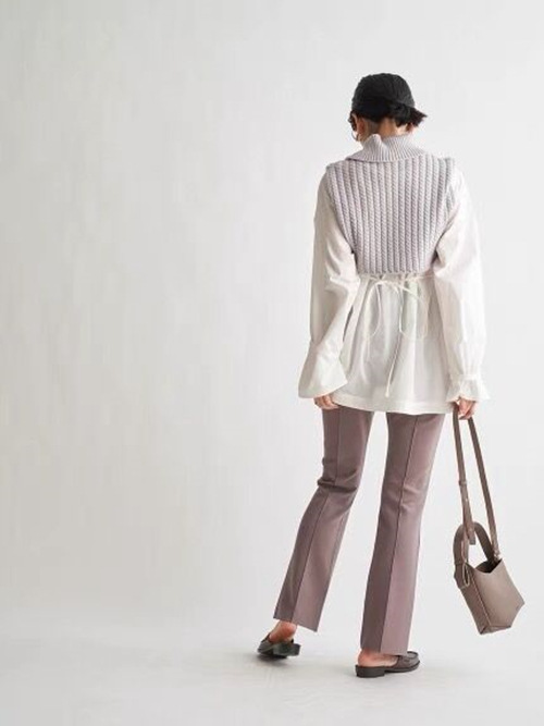 シャツチュニックとニットベストのセットアイテム。シャツチュニックは1枚で着用できるのはもちろんのこと、ベストと合うよう、緩急をつけたふんわりシルエットでデザインしました。フロントの深いタックや、生地をたっぷりと使用したバックスタイルのギャザーなど、こだわりのディティールで今季らしいモード感をプラス。バックスタイルの紐リボンで、ご自身の体形に合わせたシルエットの調整が可能です。ニットベストは、折り返したカシュクールネックと胸下までのショート丈で感度高い装いに。ケーブル編みで柔らかさをプラスし、セパレートでも着回しやすい万能さも実現しました。
