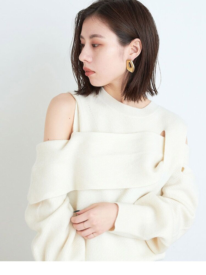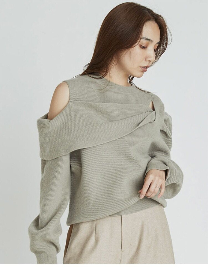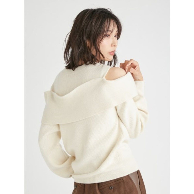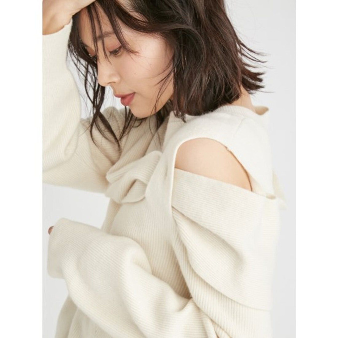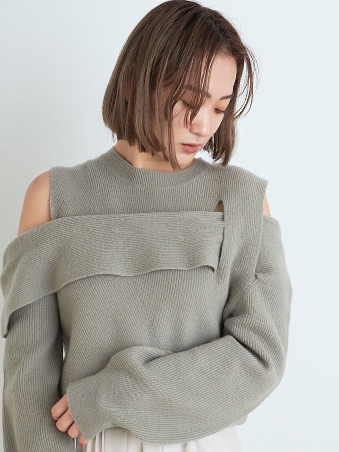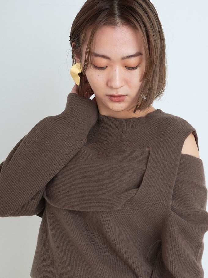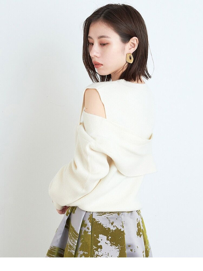 【レイヤード風デザインで絶妙な大人の肌見せを叶えるショルダースリットニットプルオーバー】