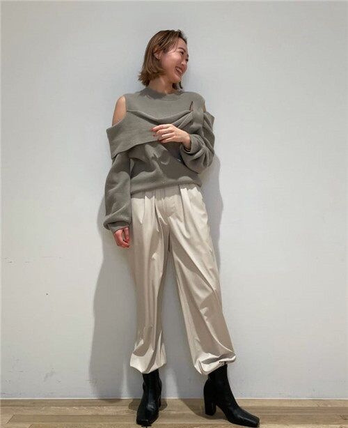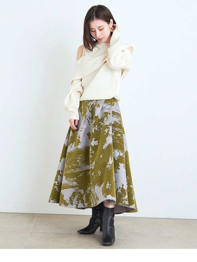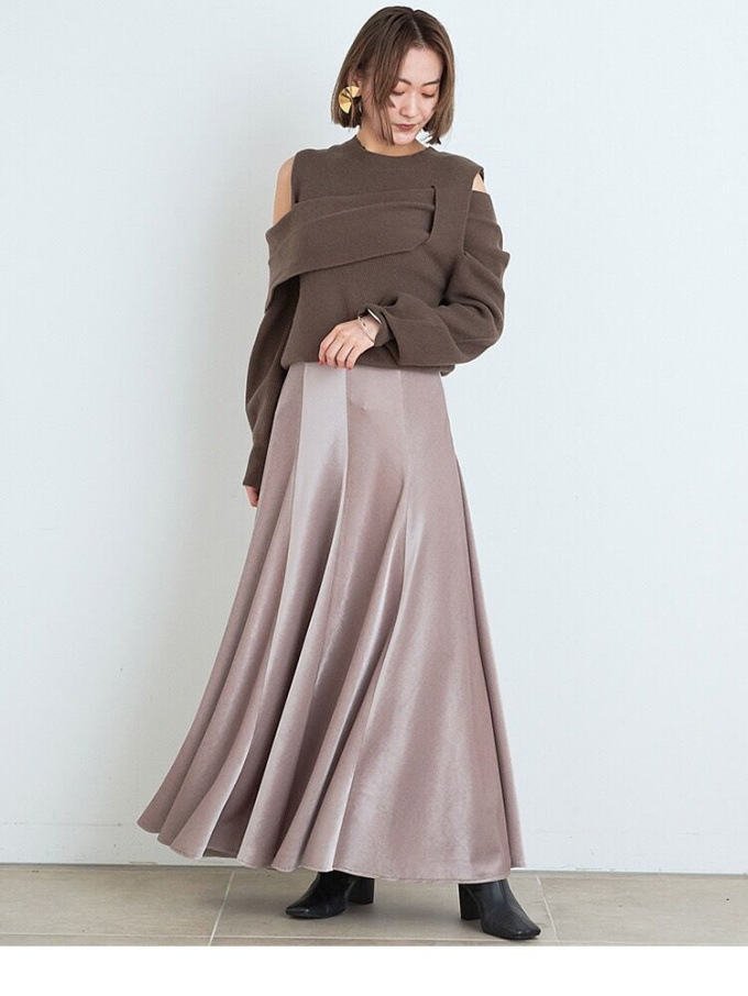 スカートにもパンツにも合わせやすく、ボトムスによって雰囲気の違うスタイリングが完成します。