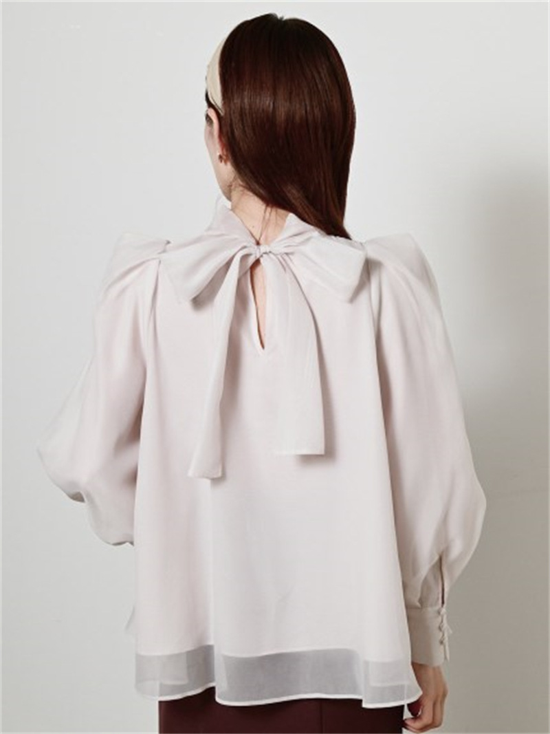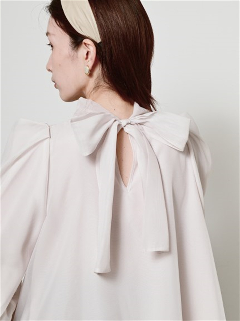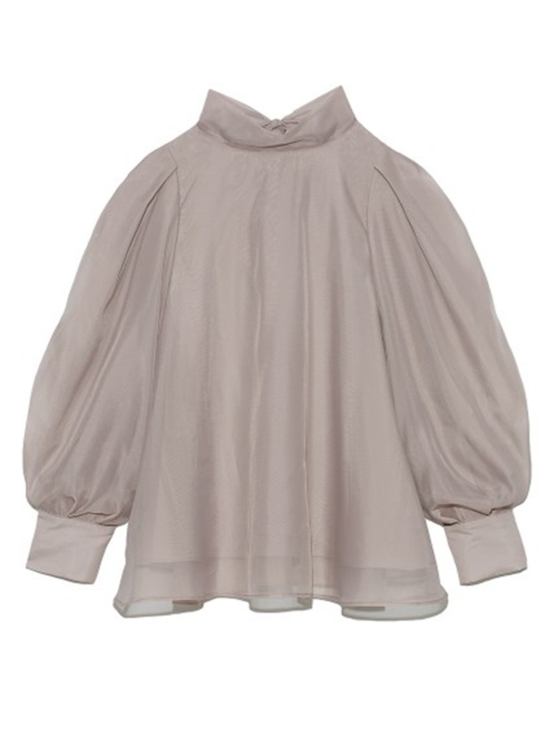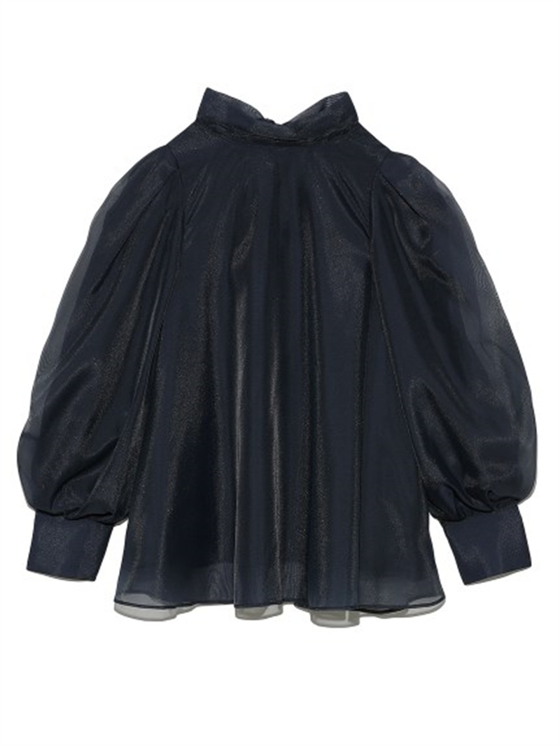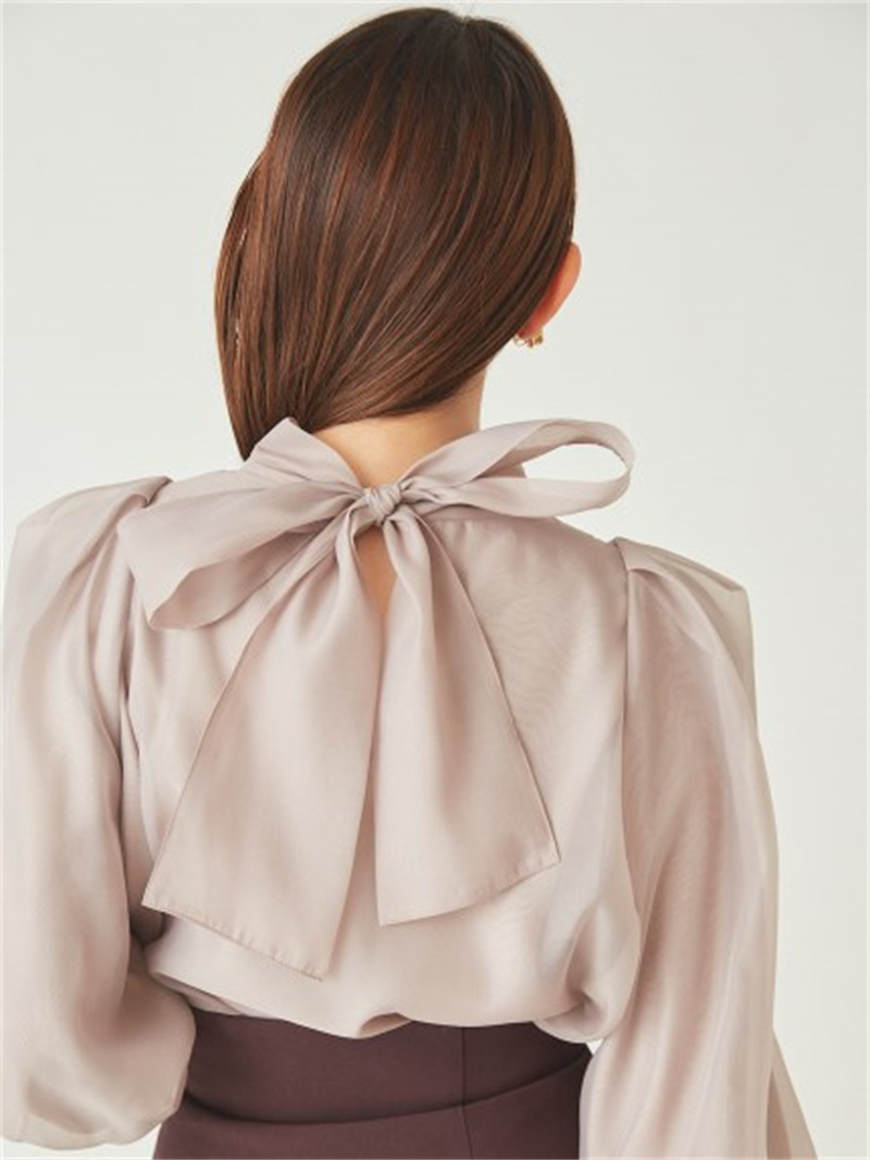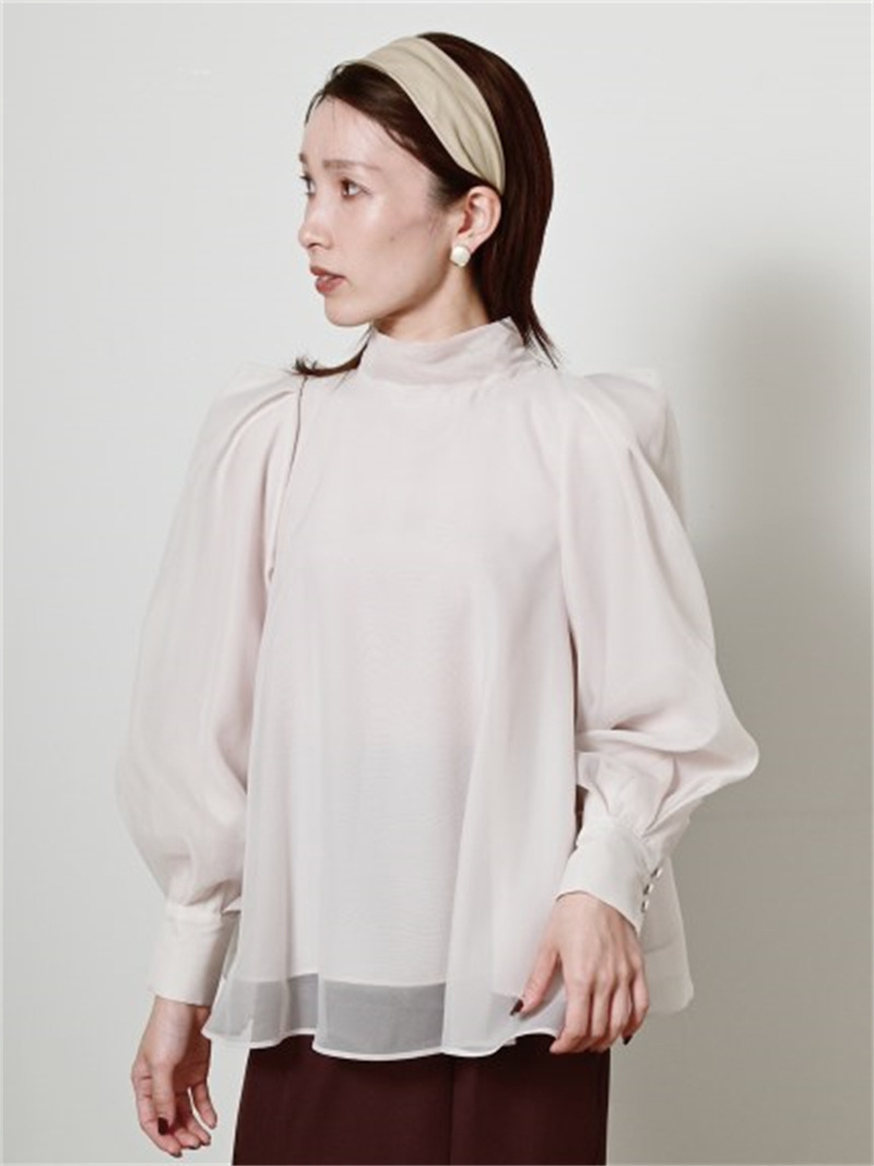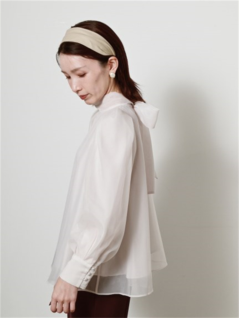 定番人気のオーガンジーシースルーブラウスからこの冬の新作が登場。タックディティールで立体的なパフスリーブを表現し、甘さの中にややモードなエッセンスを加えました。品の良いスタンドカラーと大きなバックリボンのバランスが美しく、前後どこから見てもレディな印象でスタイリングの主役を担う1枚。マーメイドスカートでフェミニンに、パンツスタイルでハンサムにと、纏うだけで旬なスタイリングが完成します。