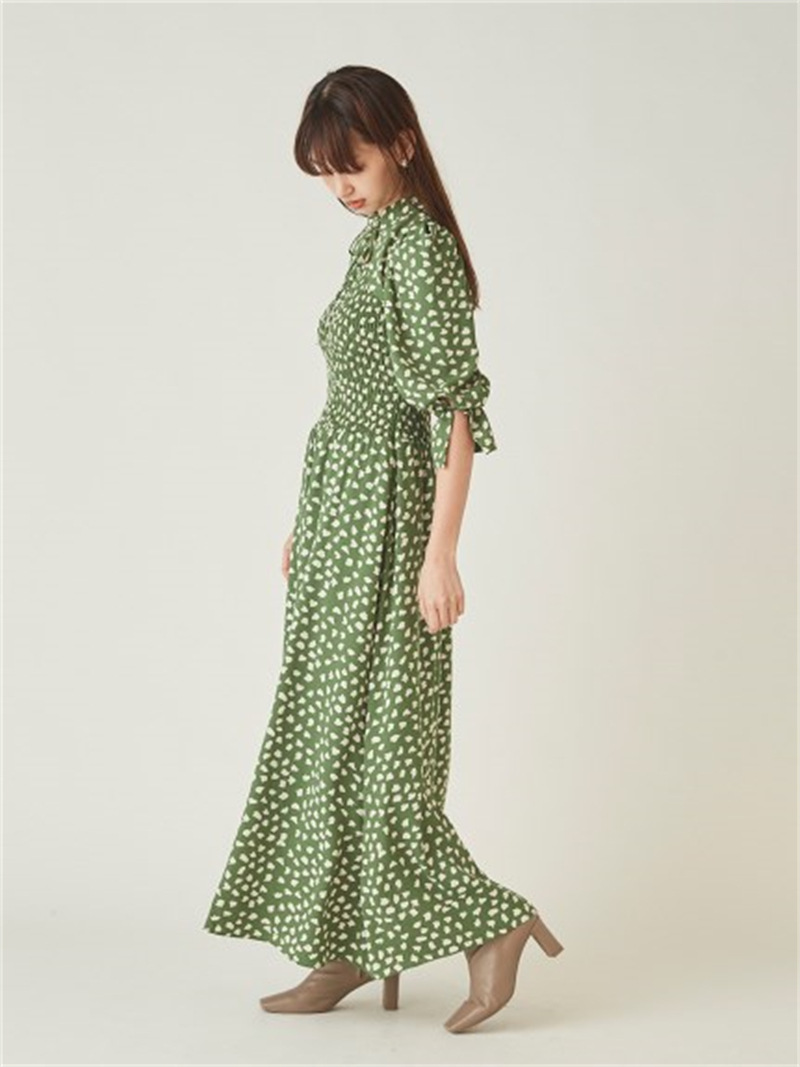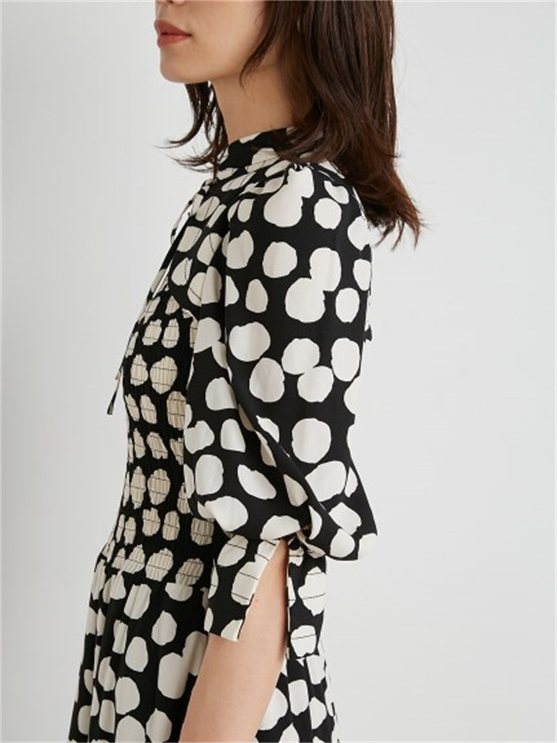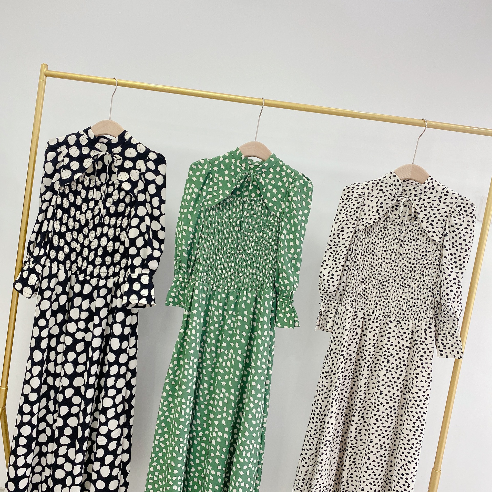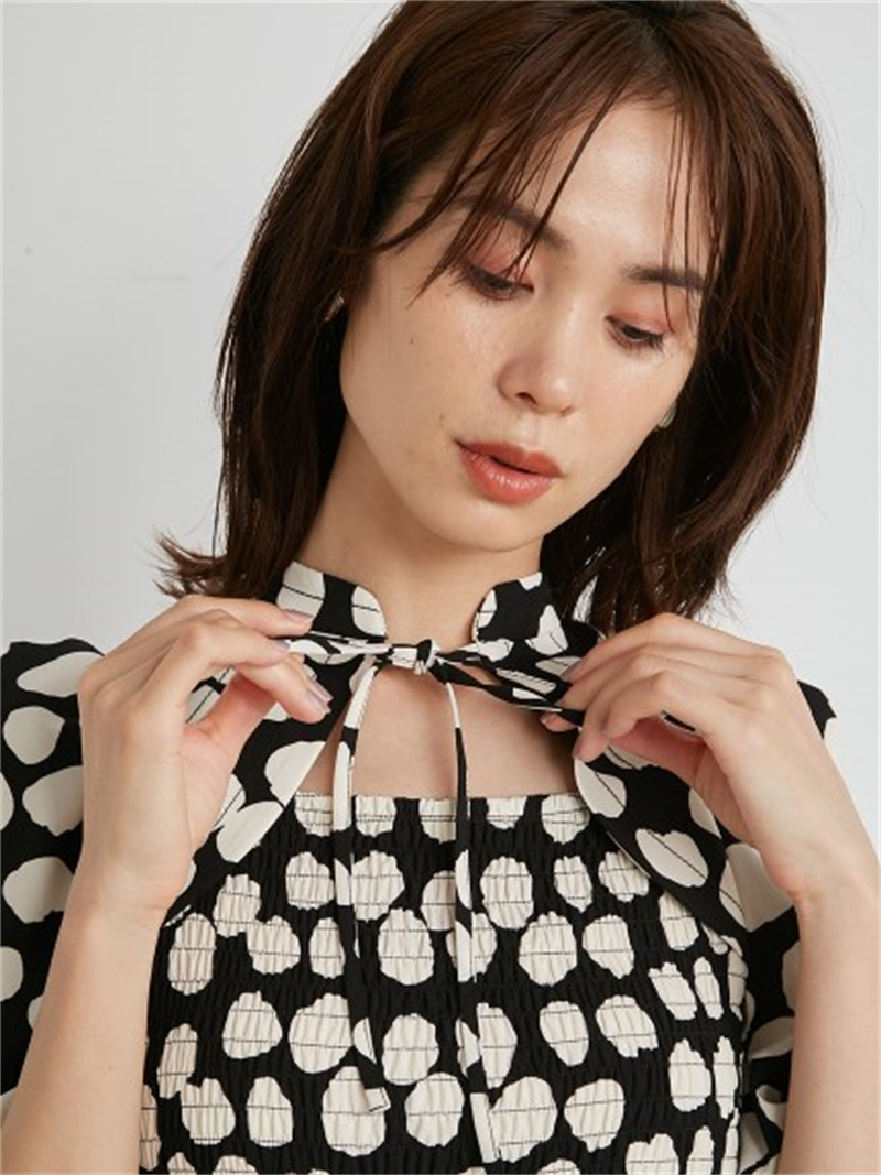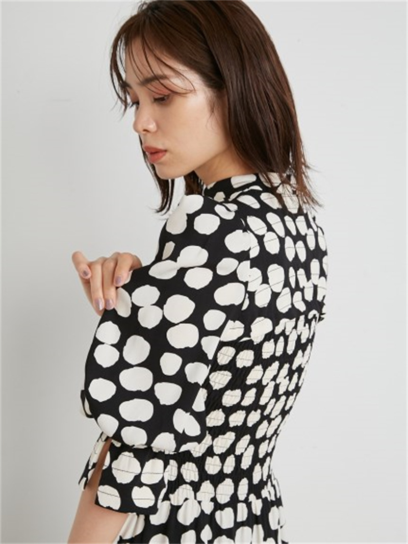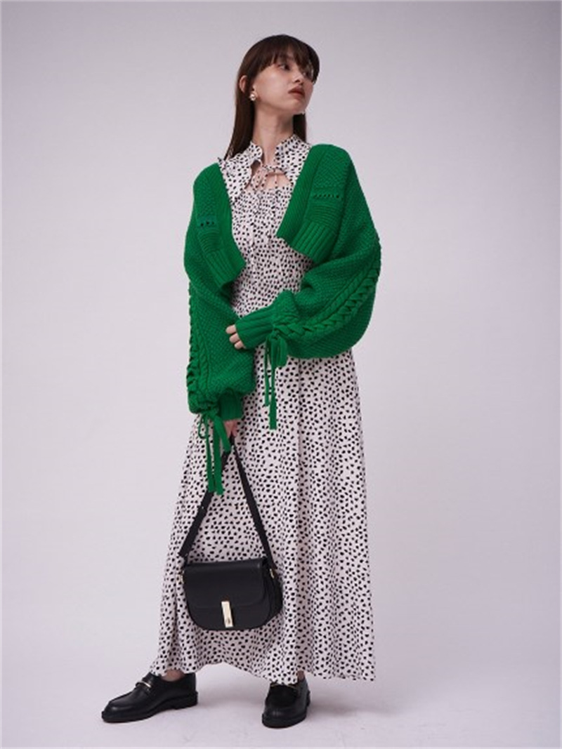 軽やかなジョーゼット生地を使用しました。印象の違いが楽しめるランダムドットはアイボリー、グリーンが同じ柄でサイズ違い、ブラックはアーティーな大きめドットの3色展開です。