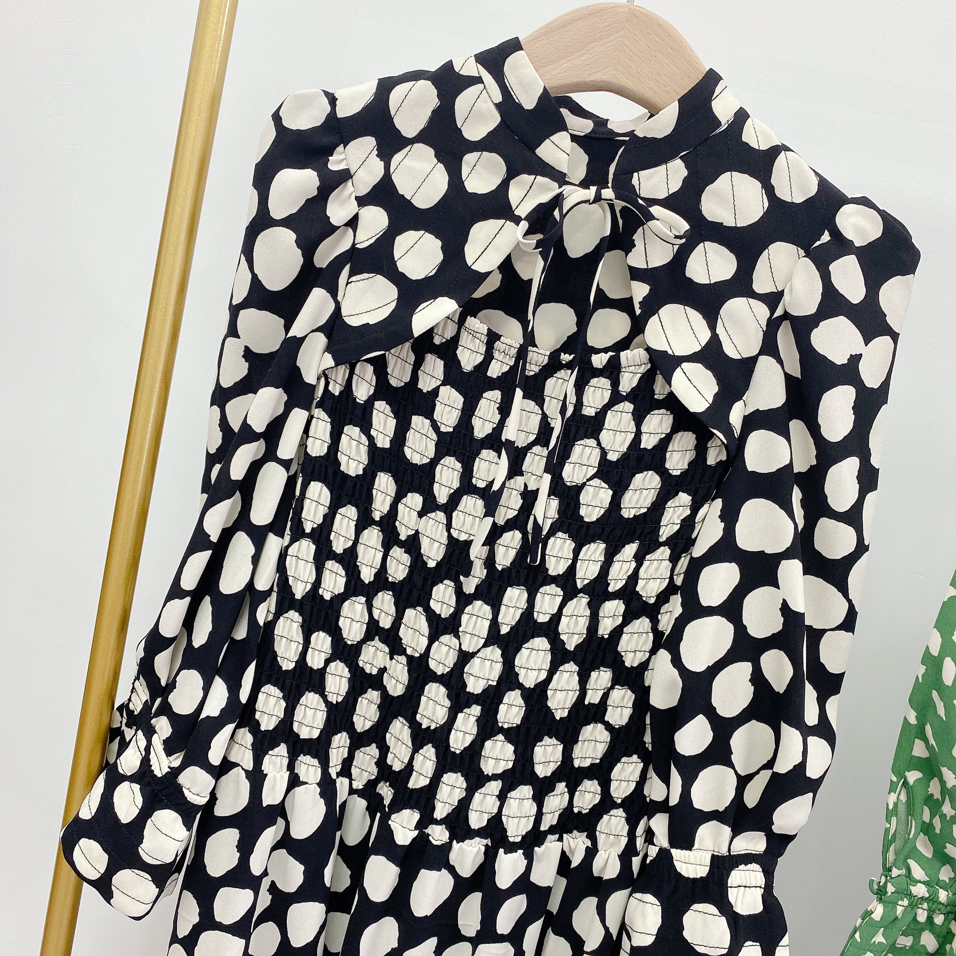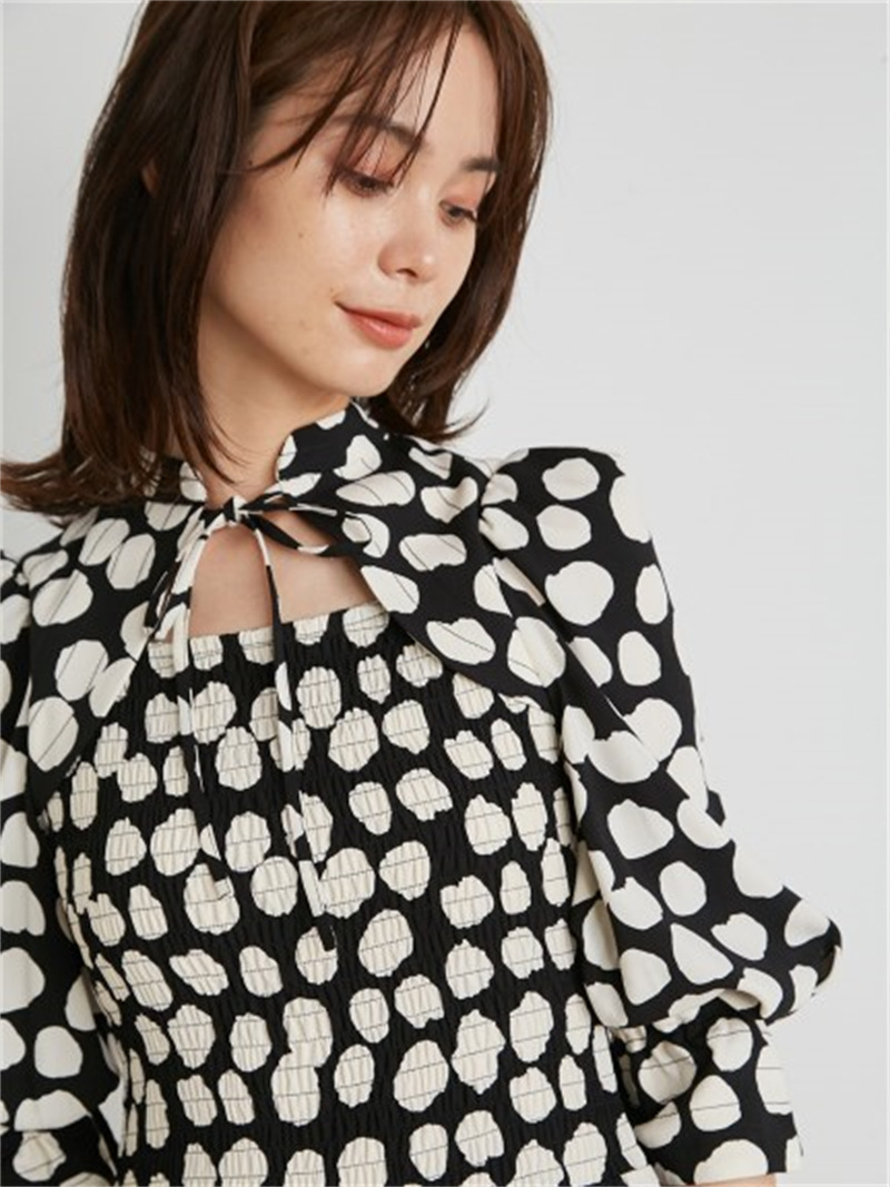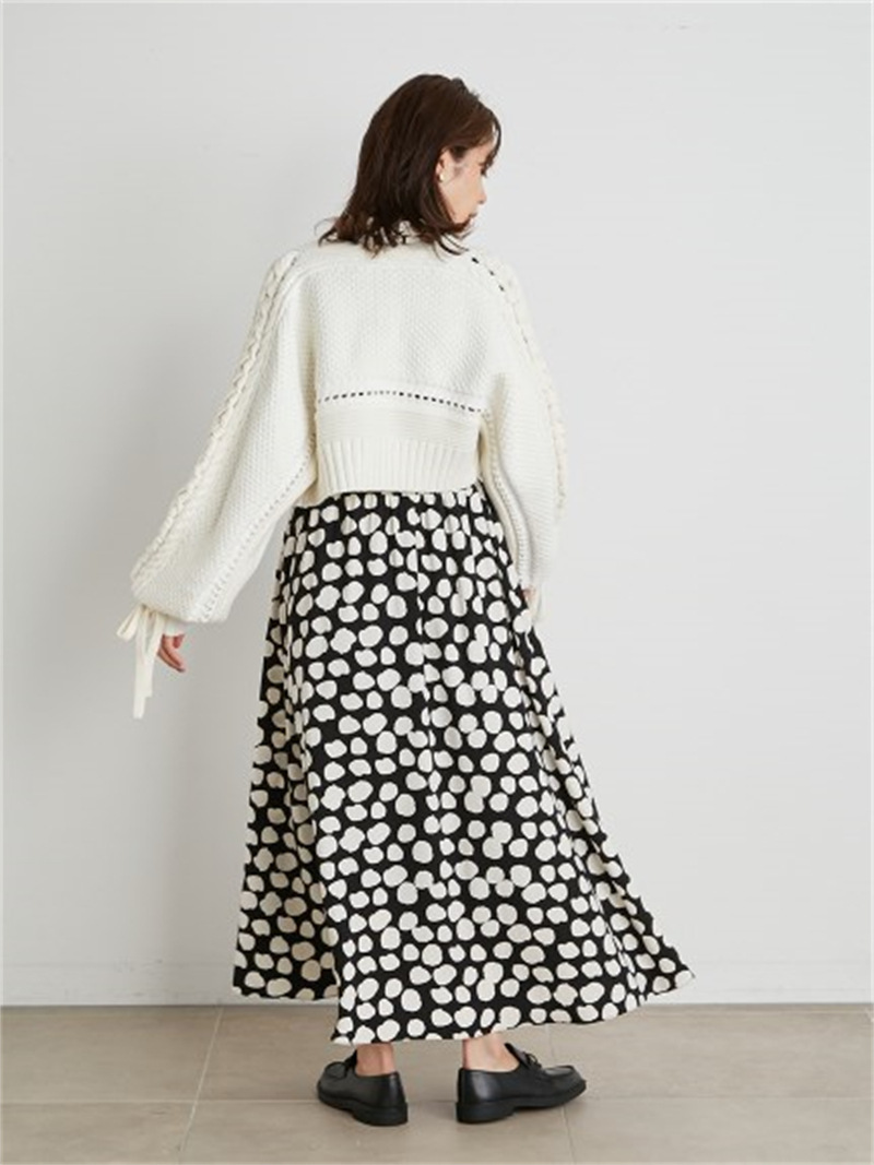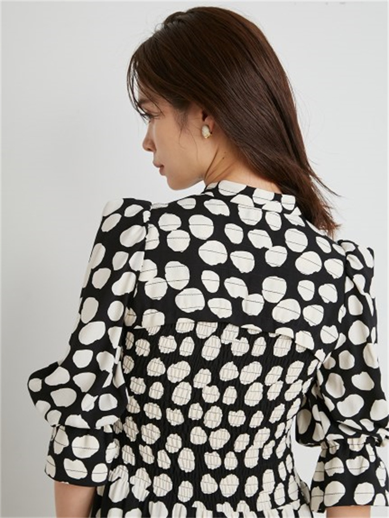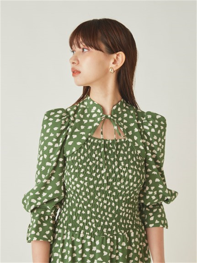 軽やかなジョーゼット生地を使用しました。印象の違いが楽しめるランダムドットはアイボリー、グリーンが同じ柄でサイズ違い、ブラックはアーティーな大きめドットの3色展開です。