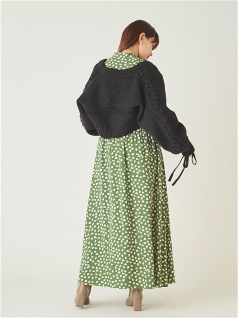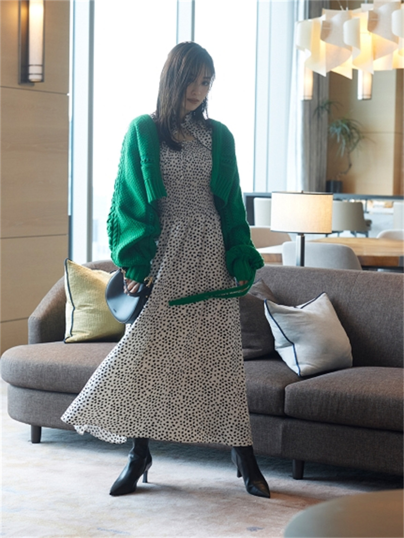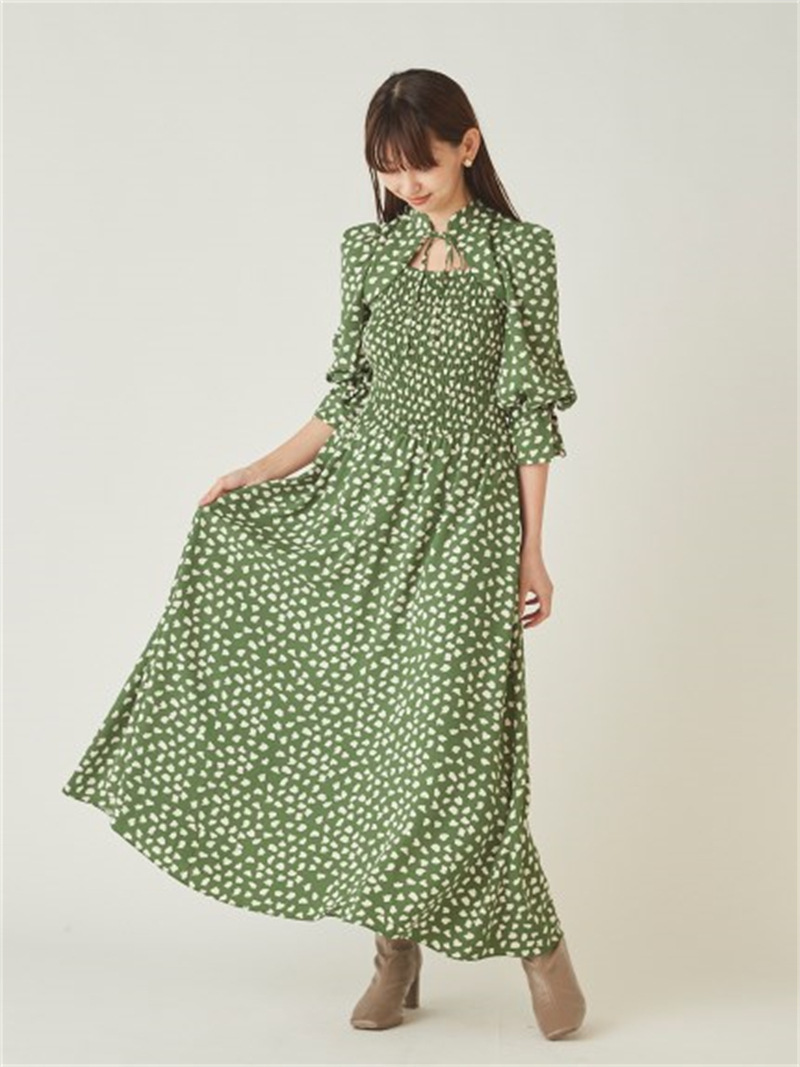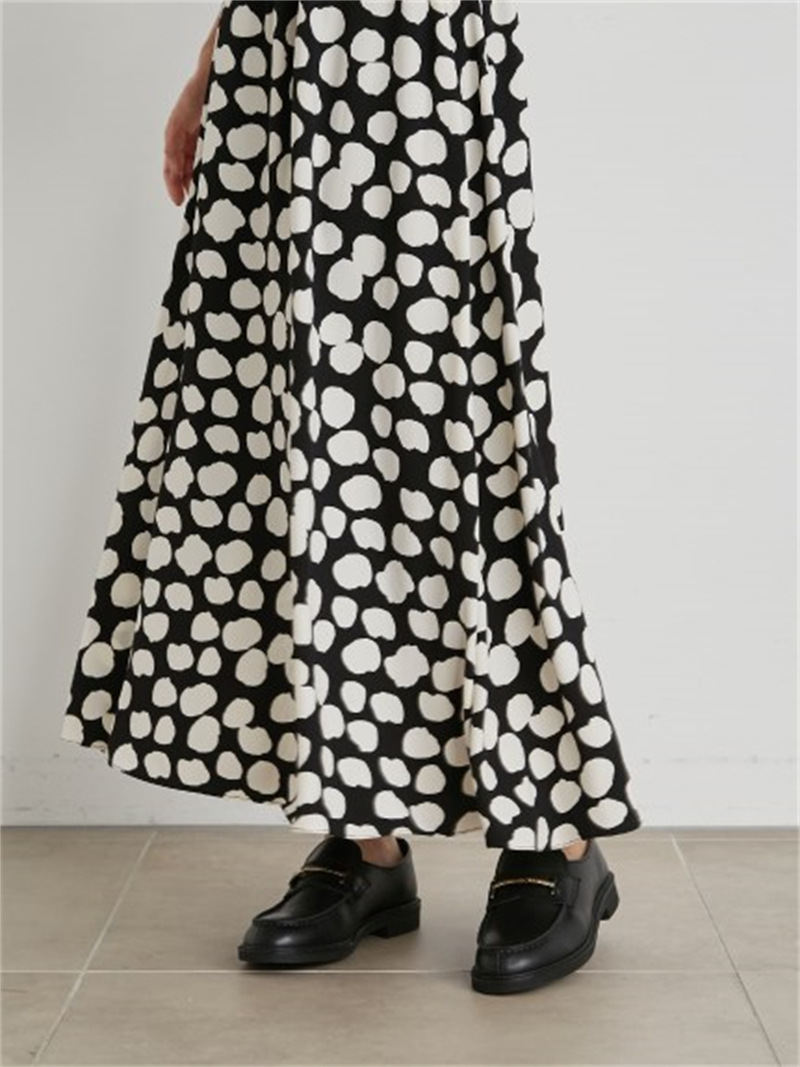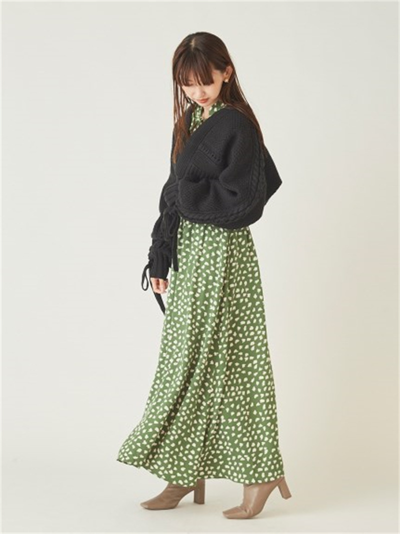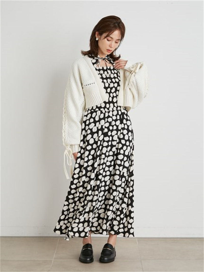 軽やかなジョーゼット生地を使用しました。印象の違いが楽しめるランダムドットはアイボリー、グリーンが同じ柄でサイズ違い、ブラックはアーティーな大きめドットの3色展開です。