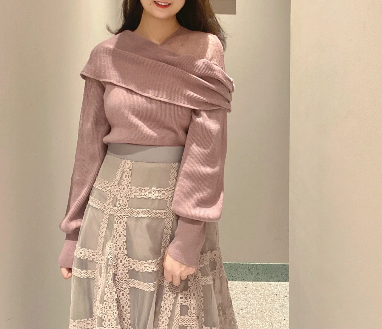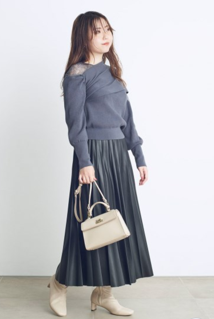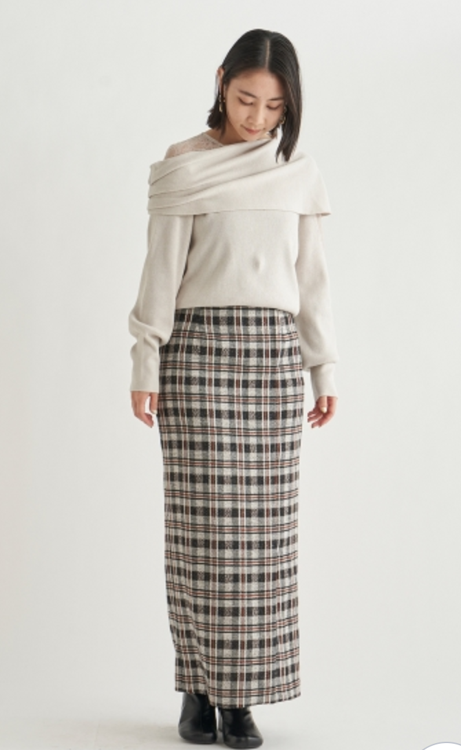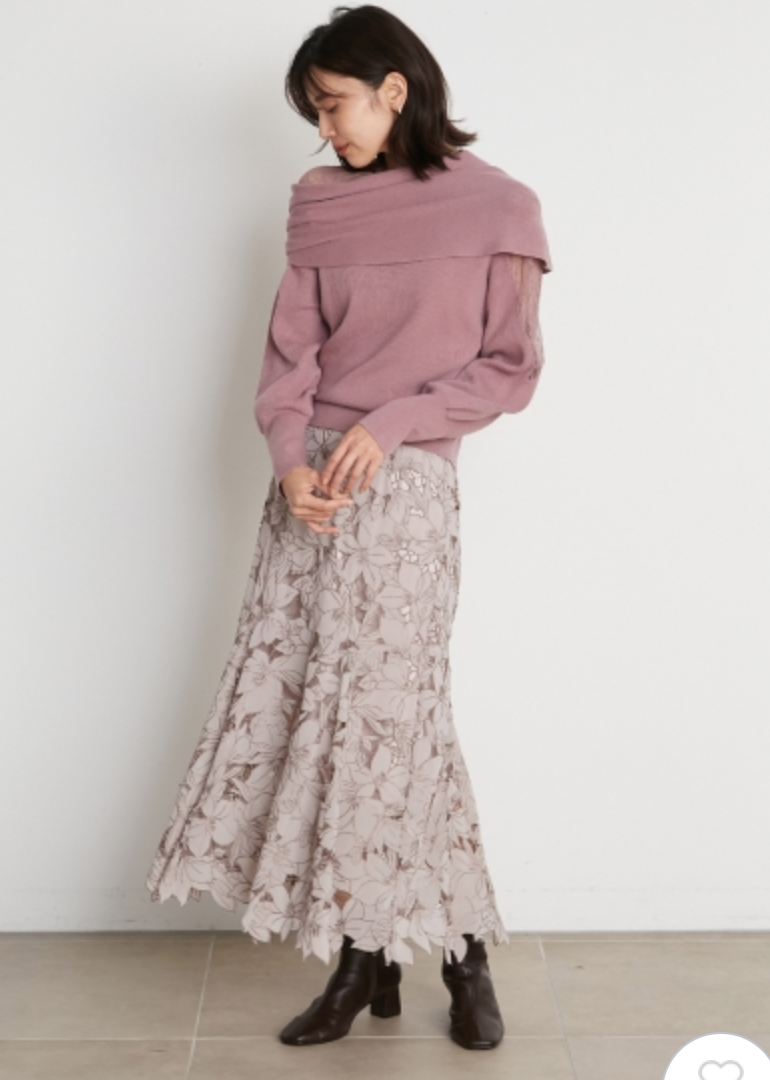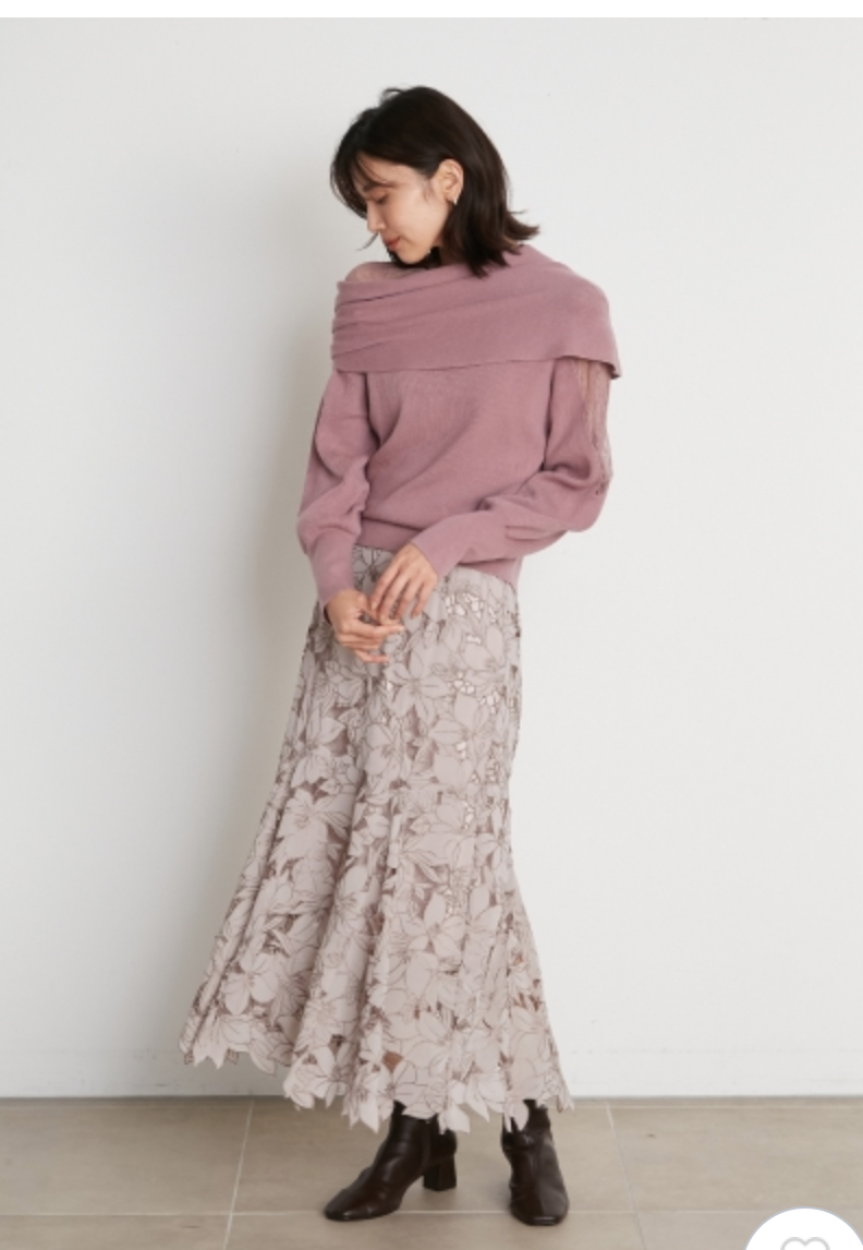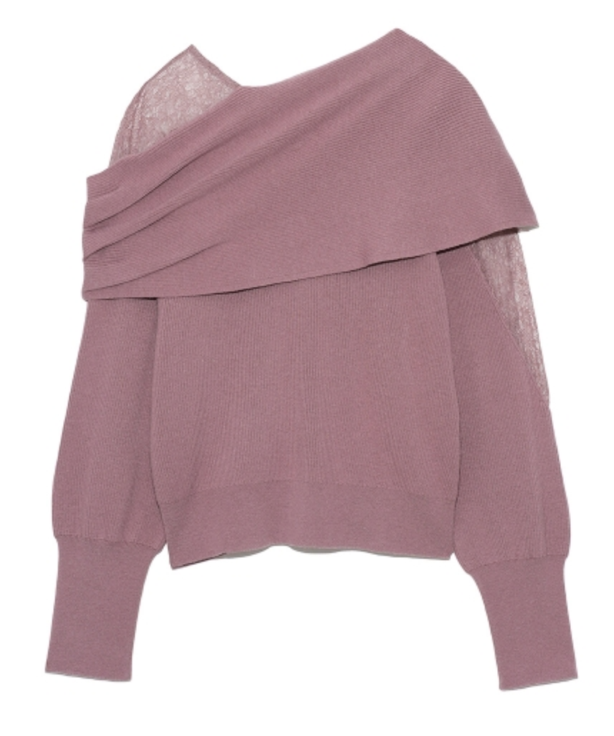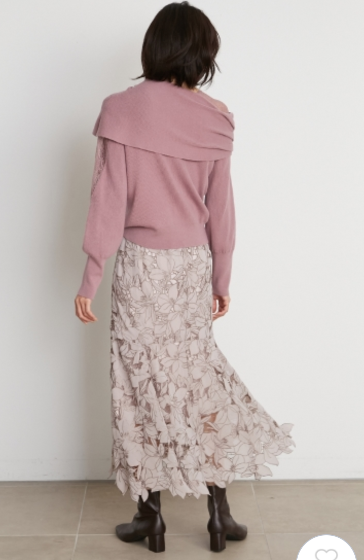 エレガントな装いをベースに、アシンメトリーデザインやマテリアルミックスでモードな印象をプラスしたデザインニット。オープンショルダー部分には繊細なレースを使用し、重さのあるニットとの美しいコントラストを際立たせました。袖は女性らしくややオーバーサイズで仕上げ、丈ボトムスを選ばない合わせやすさを意識。フェミニンな要素満載のニットは、「SNIDEL」ならではの1着です。