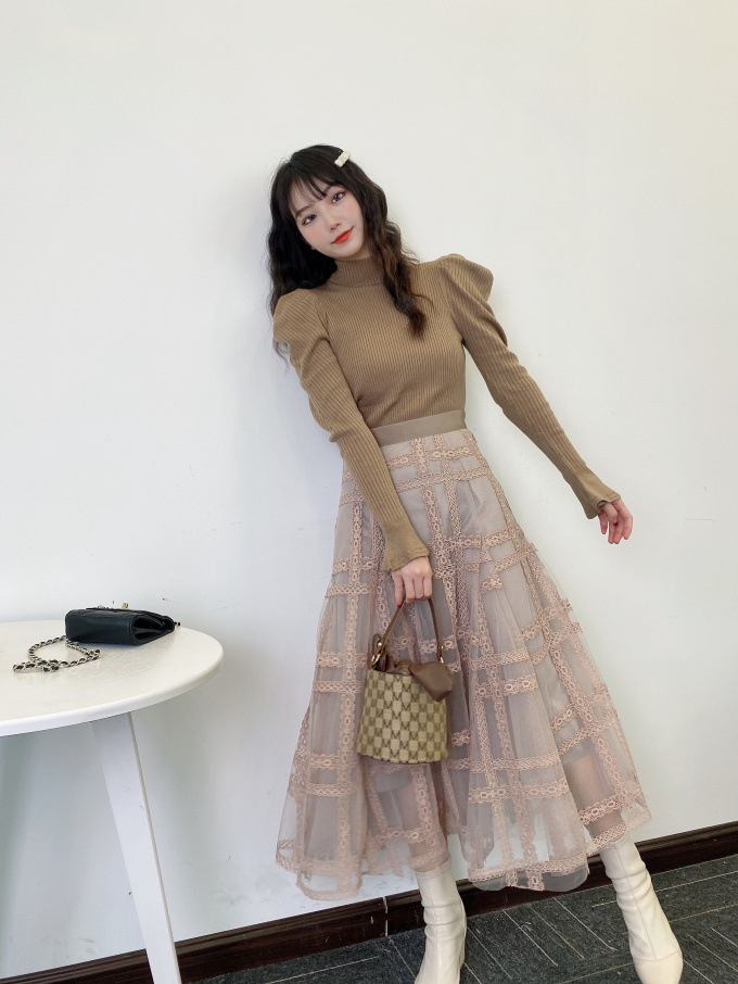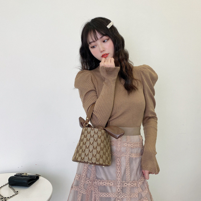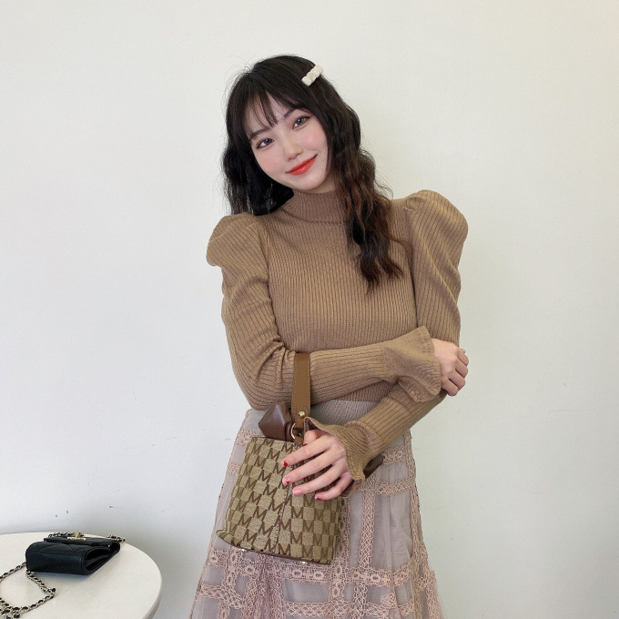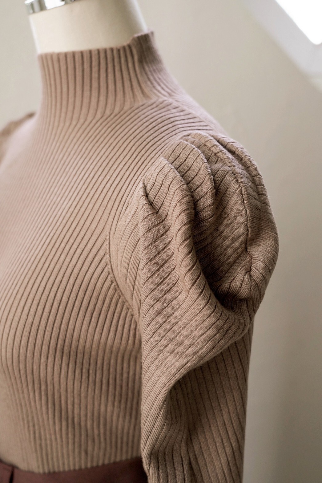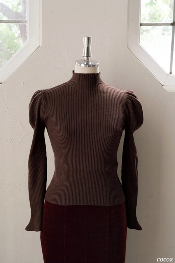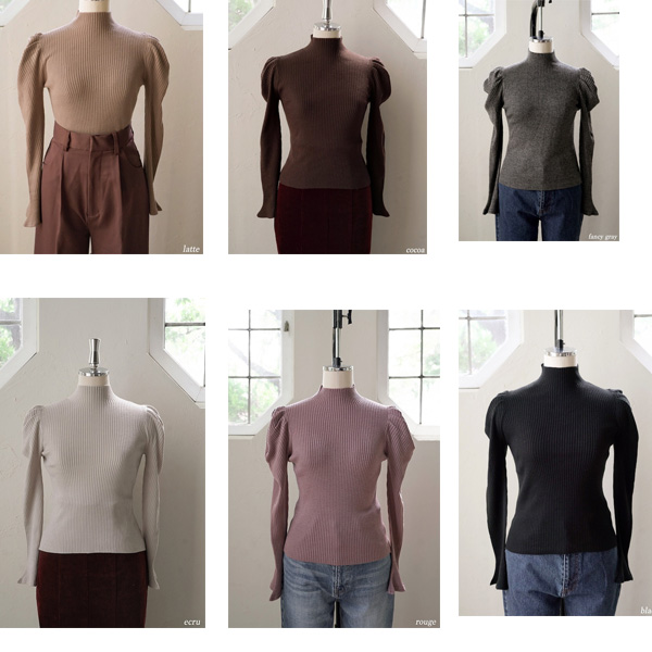 肩から袖に施したパフスリーブには程よいボリュームが出るようタックを施していながら、柔らかなニット素材でアウターに響かずお召しいただけます。
