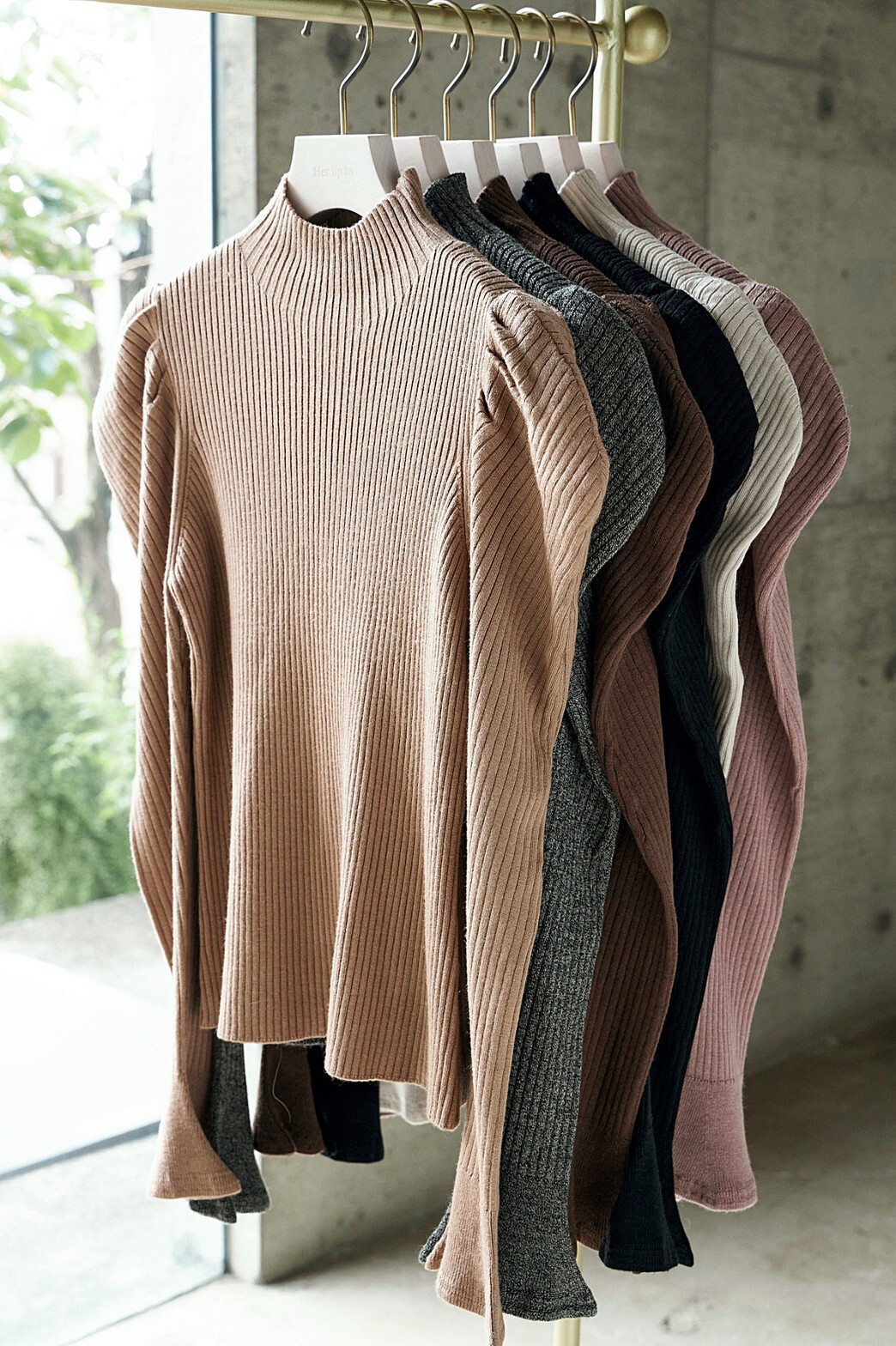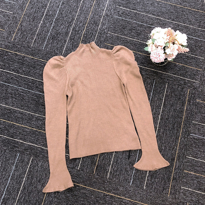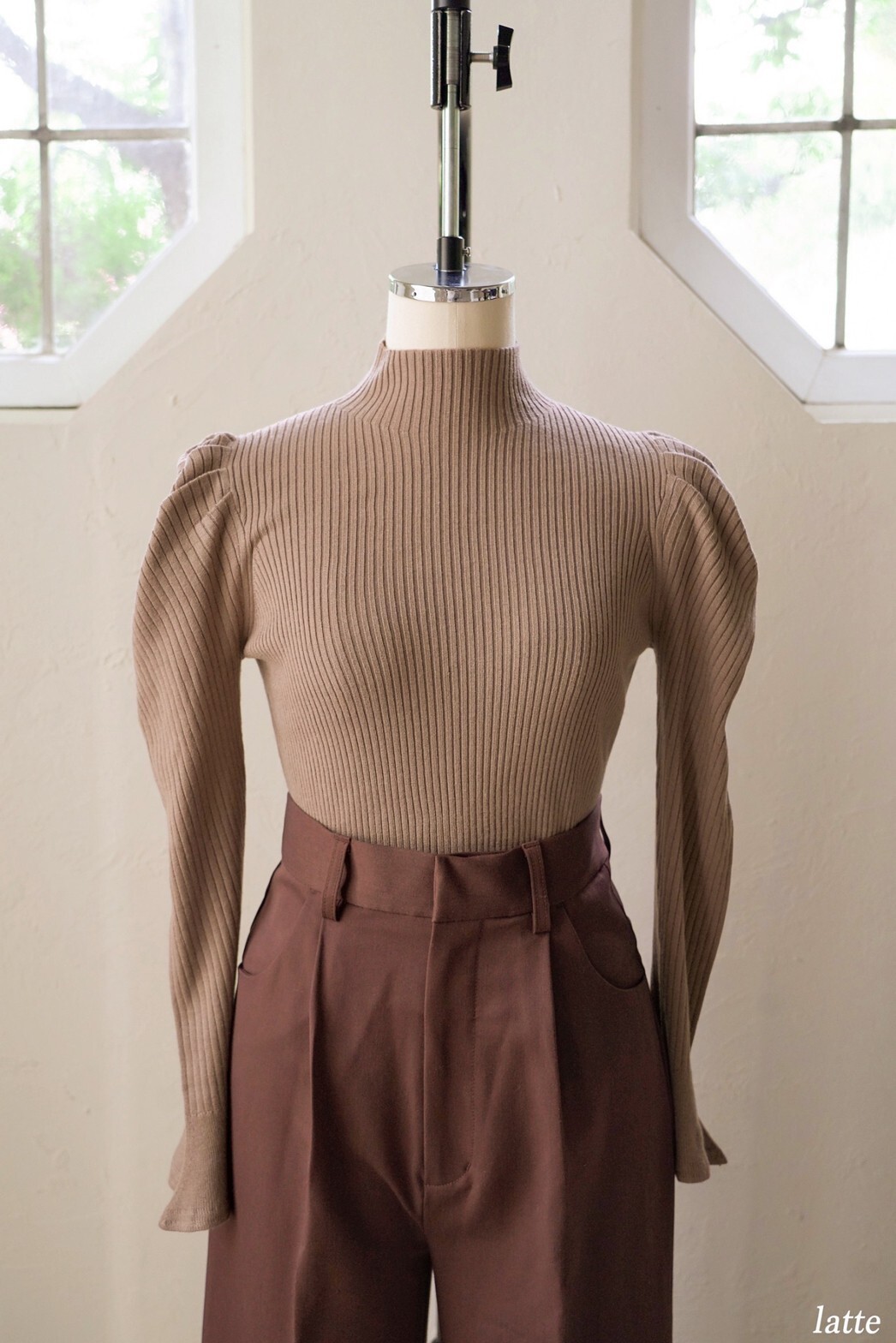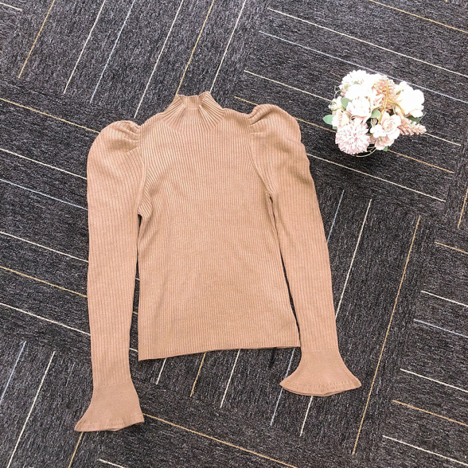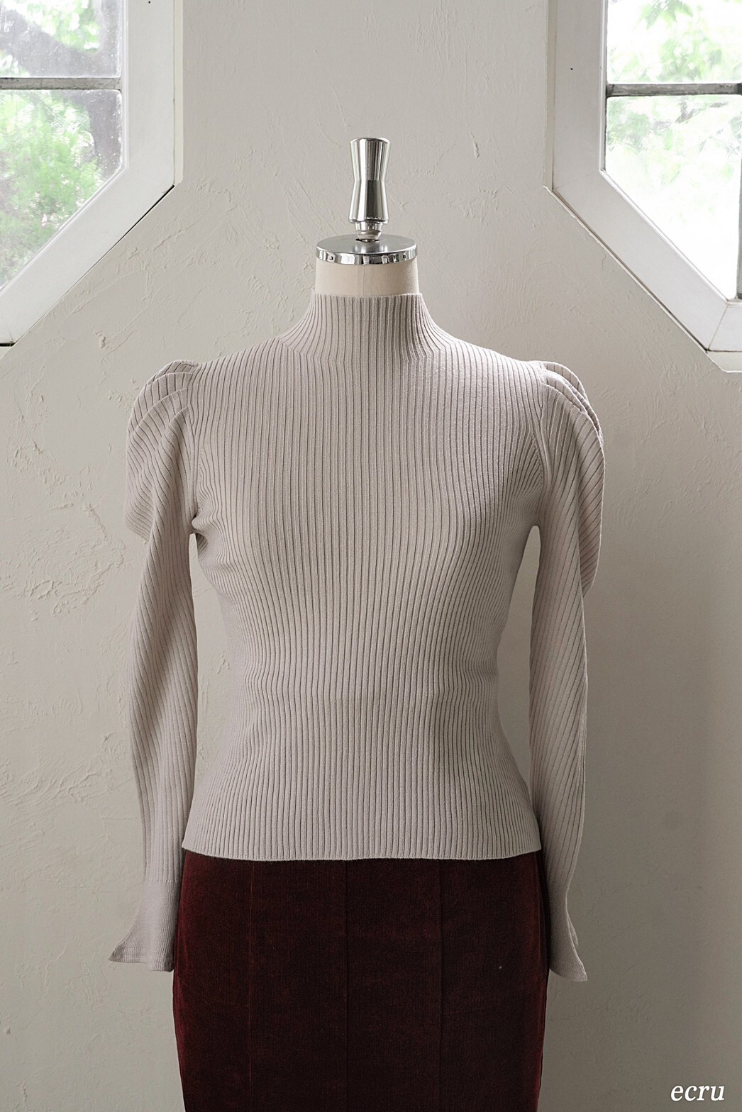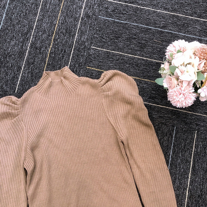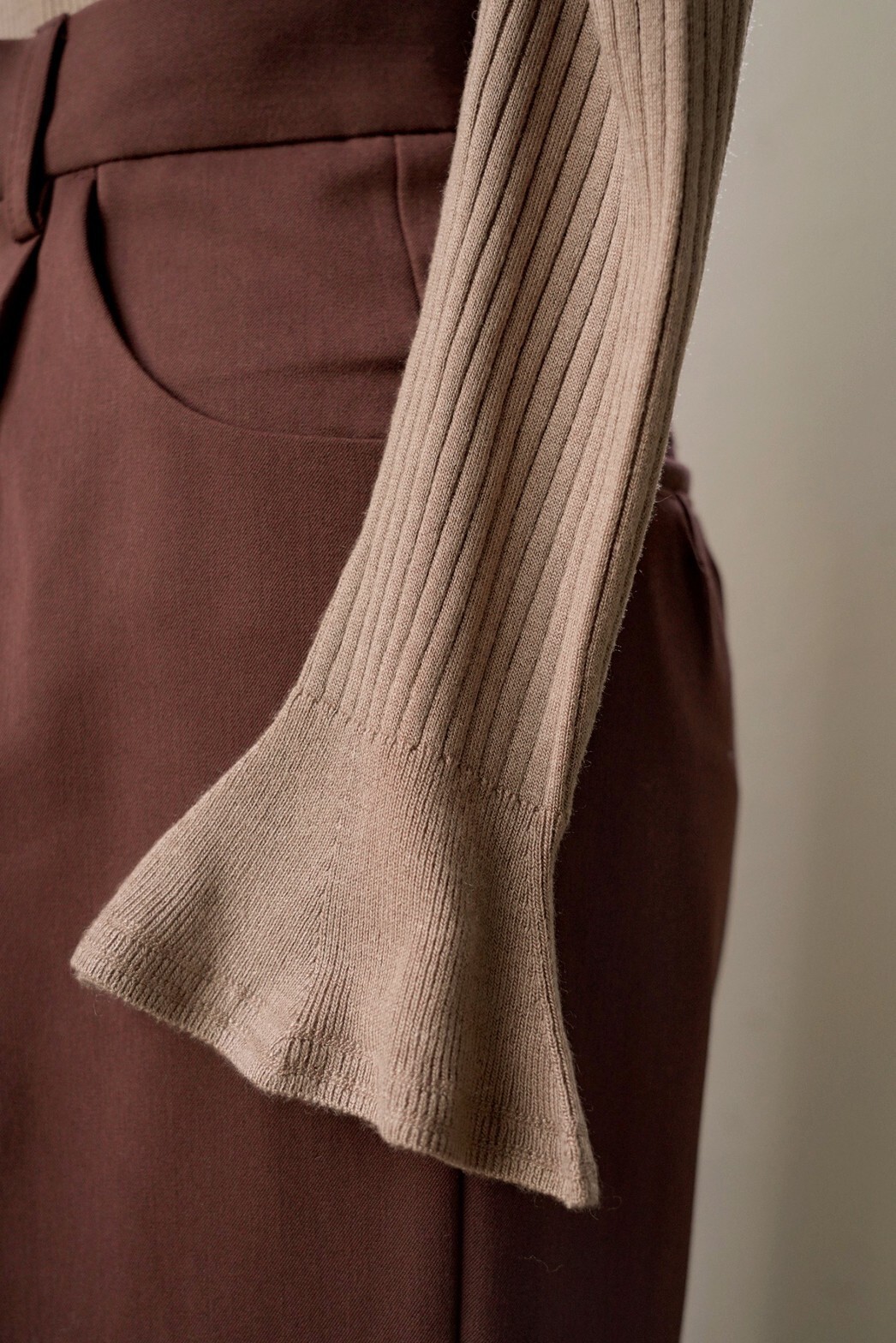 表情豊かなリブと、袖に施されたフレアが女性らしいフェミニンな印象を与えます。