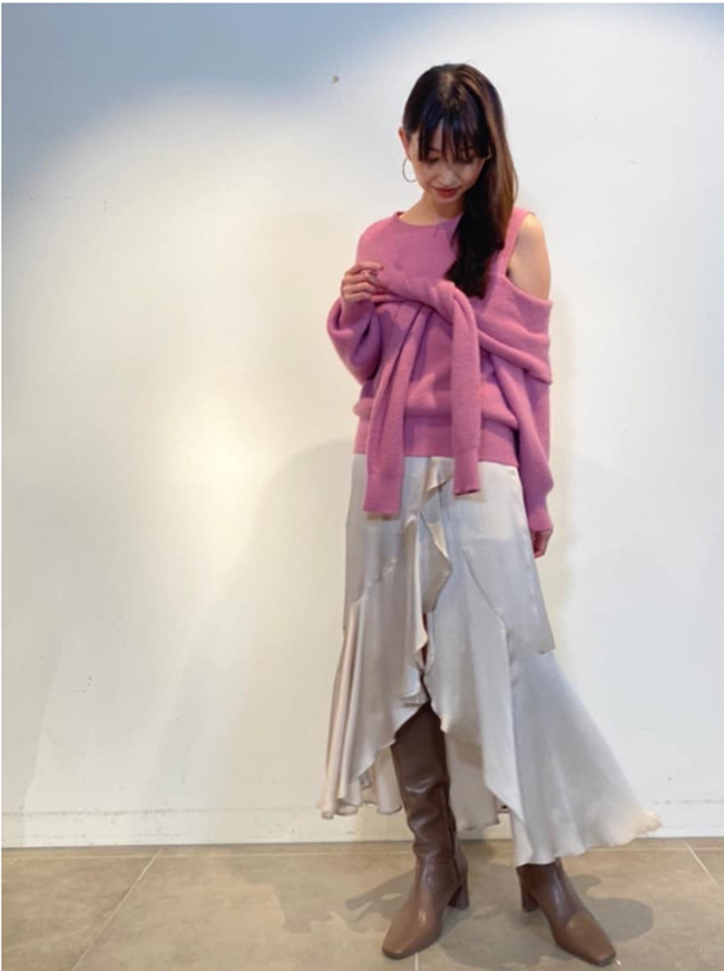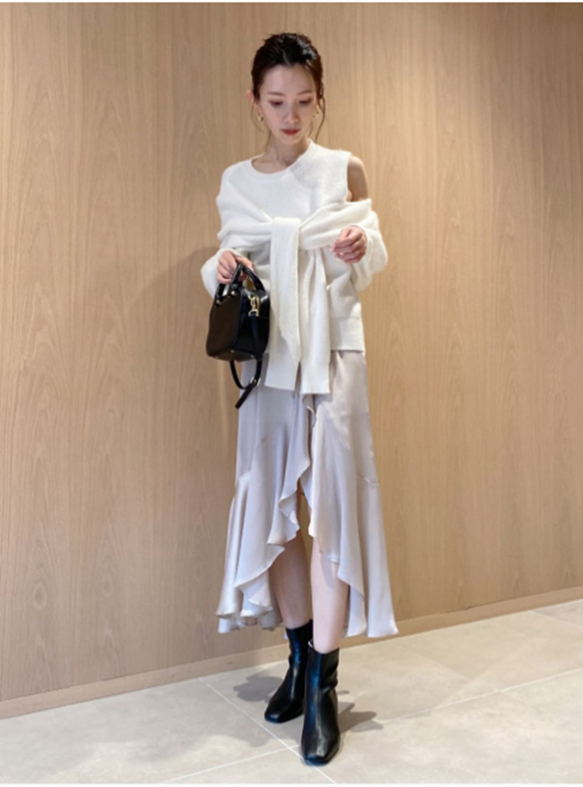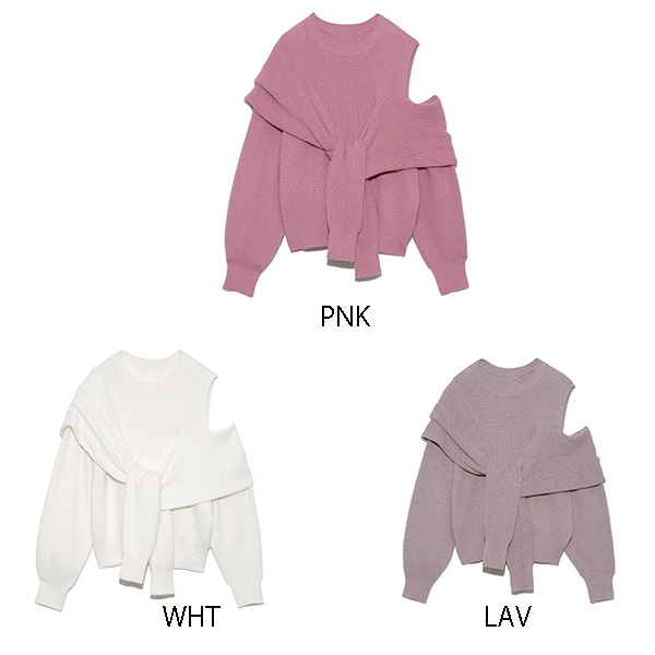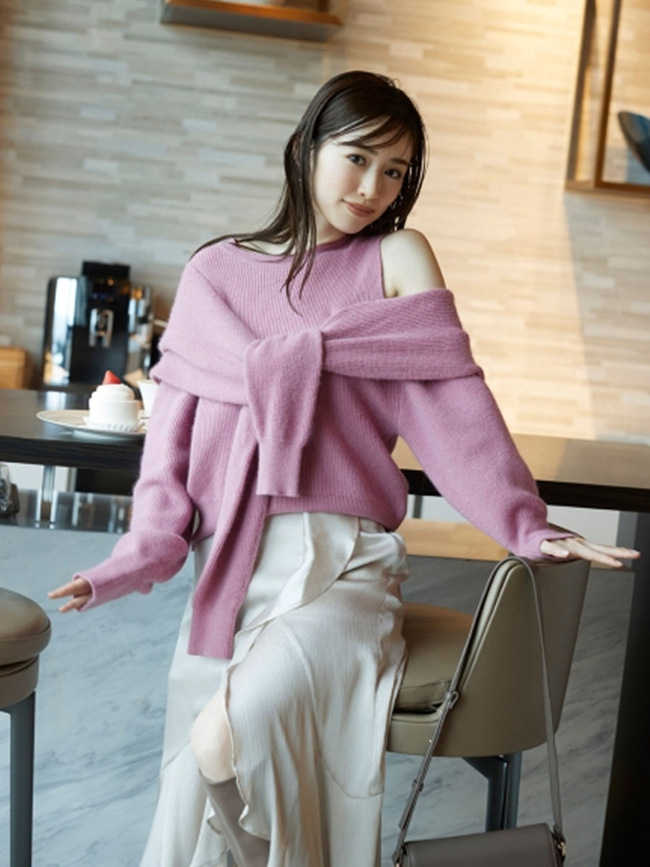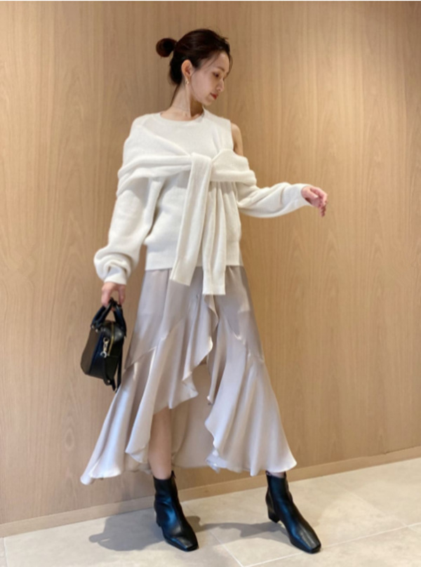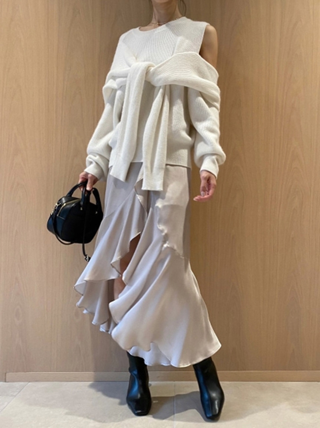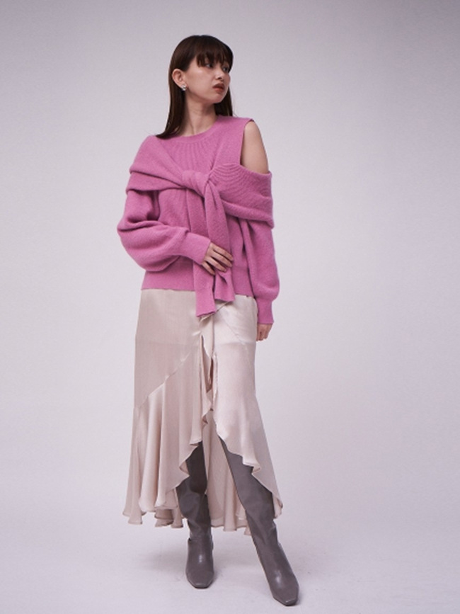 昨年大人気だったディフォーメーションニットがリバイバル。カーディガンを巻いたようなフェイクレイヤードが目を惹き、肩開きの色香とアシンメトリーのモード感で、他にはない洗練された印象を放ちます。カシュクールのようにクロスしたバックスタイルもポイントとなり、女性らしさを強調し、フロントとは違ったギャップで魅了。程良いボリューム感はコーディネートに取り入れやすく、ハンサムなパンツスタイルから甘めなスカートまで、ニットが主役のコーディネートが完成します。