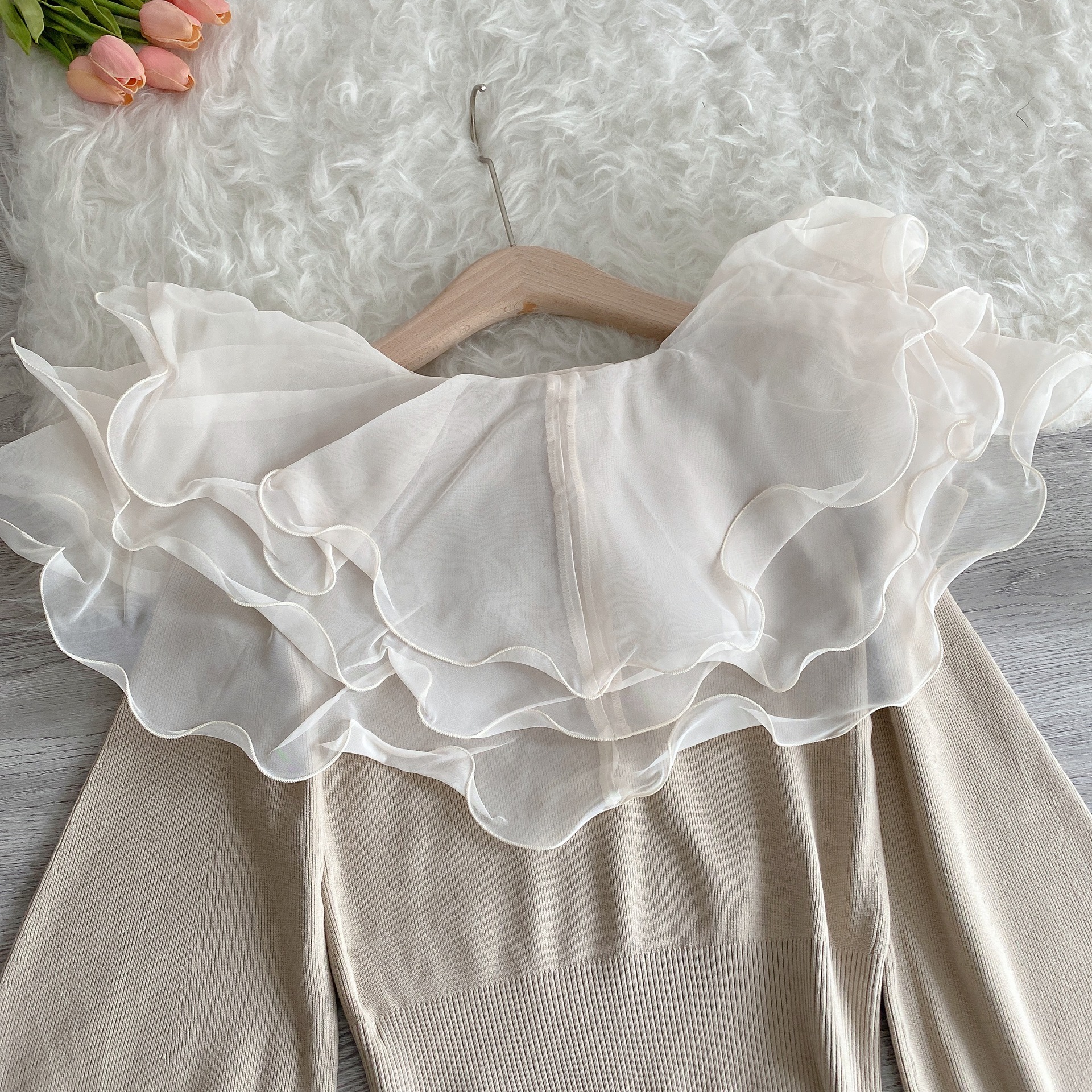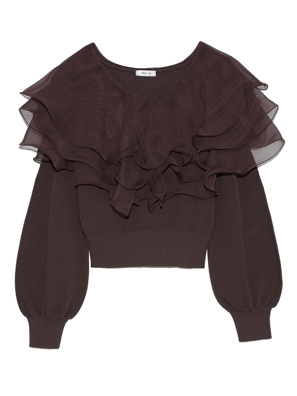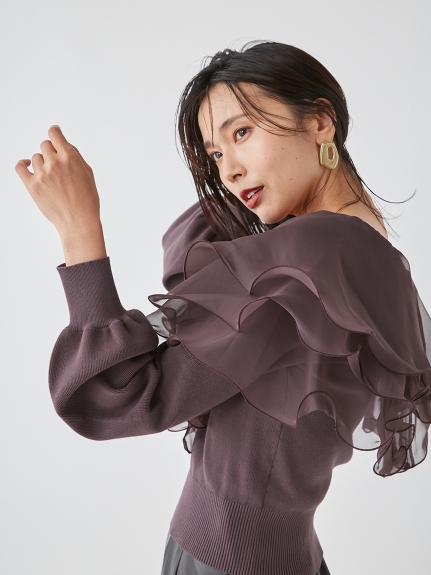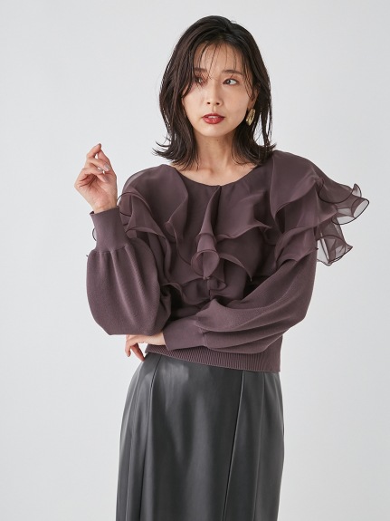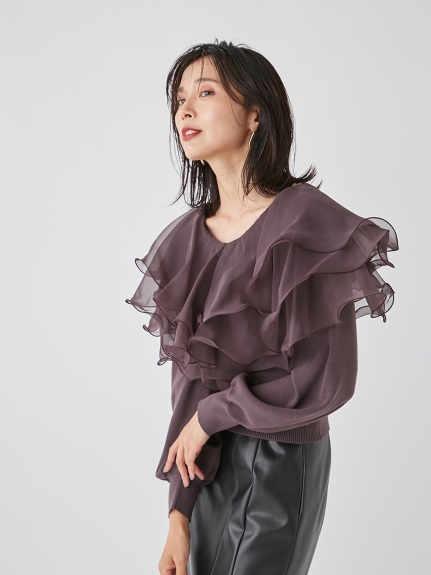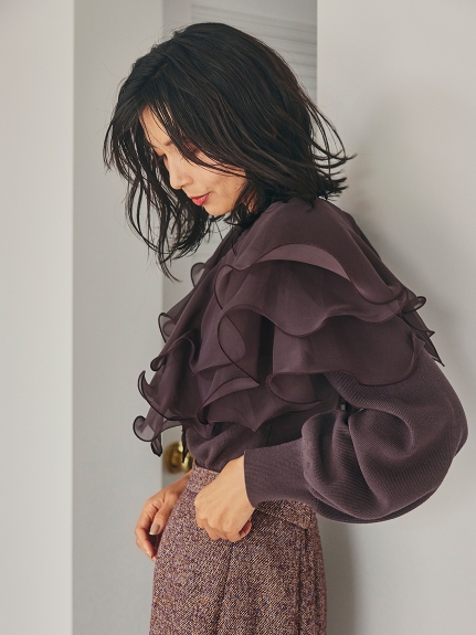 華やかに重なるラッフルフリルが目を惹くニットトップスです。