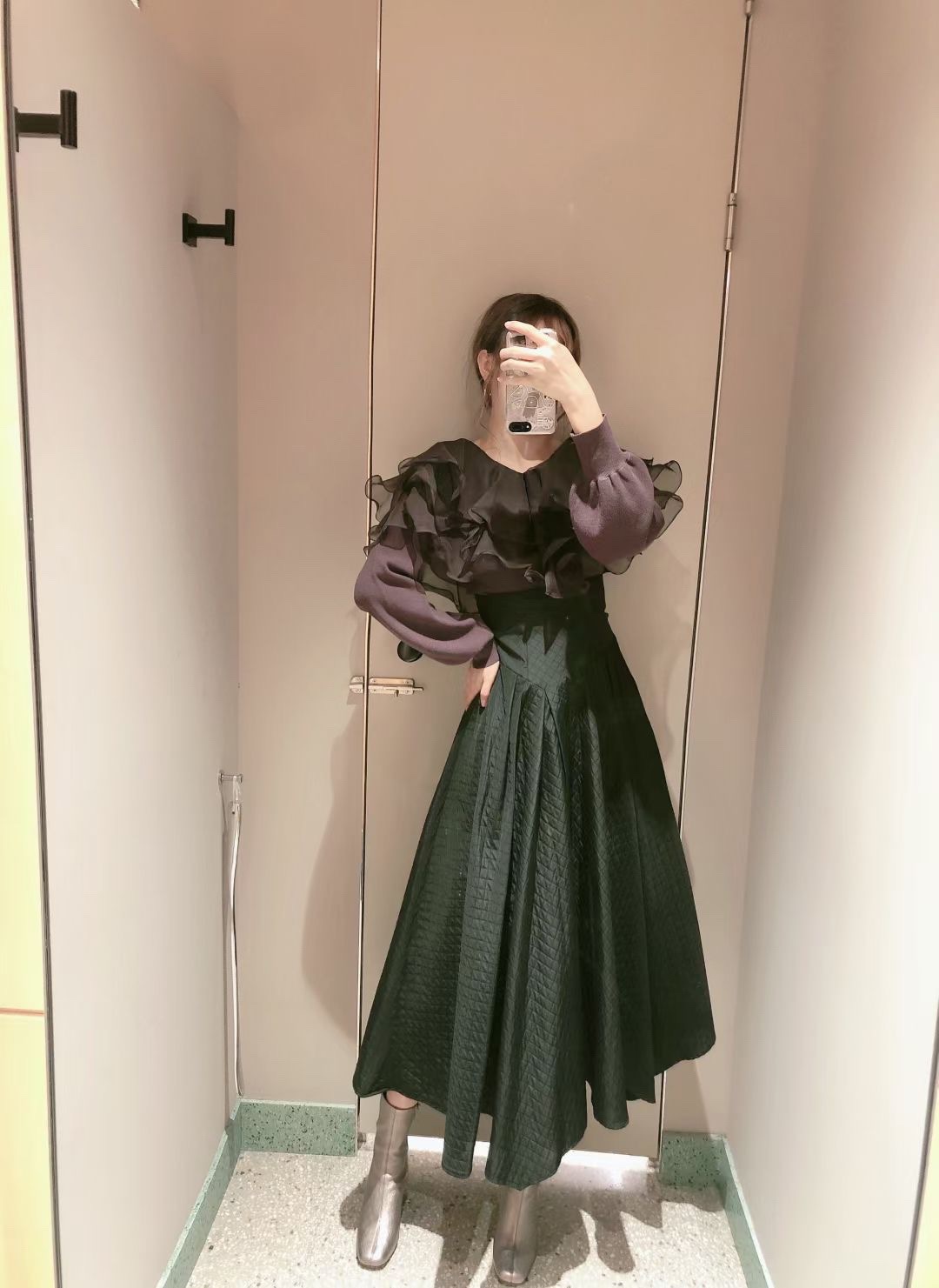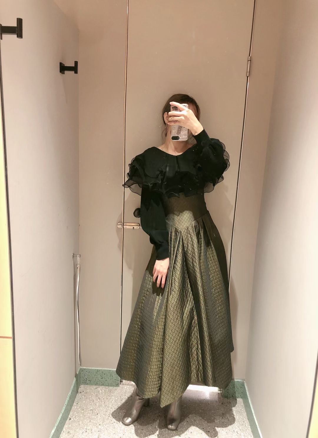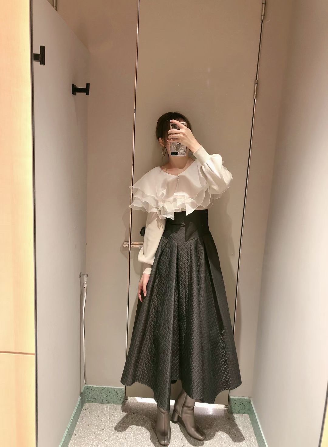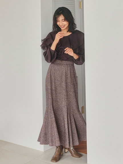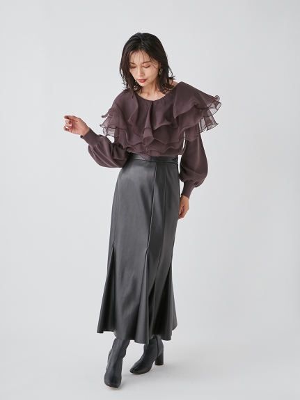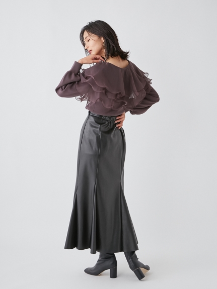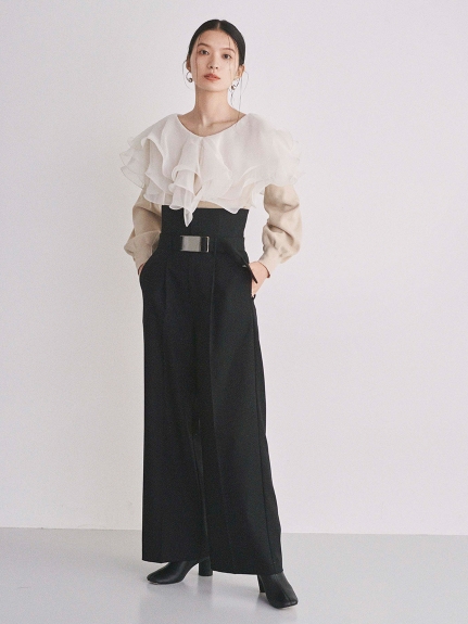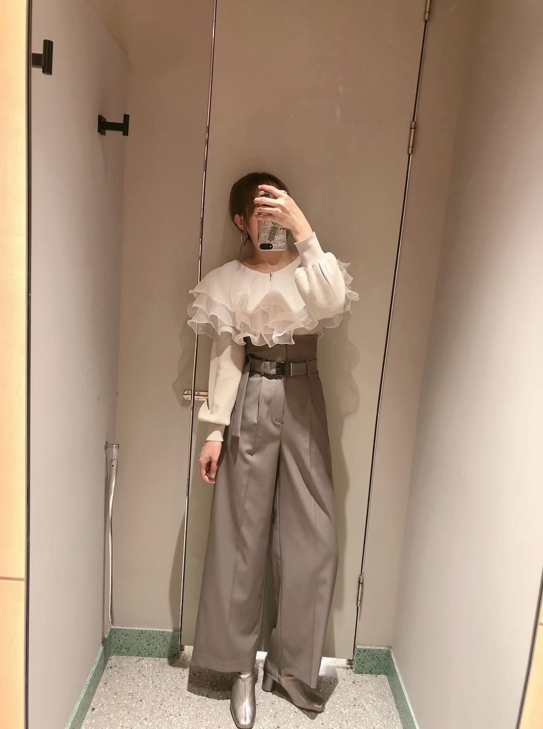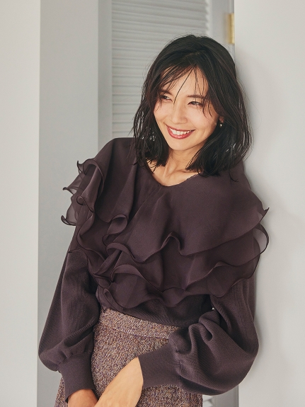 ボトムはナロースカートにもハイウエストパンツにも合わせやすく、動きのある構築的なラッフルラインを活かした装いに。