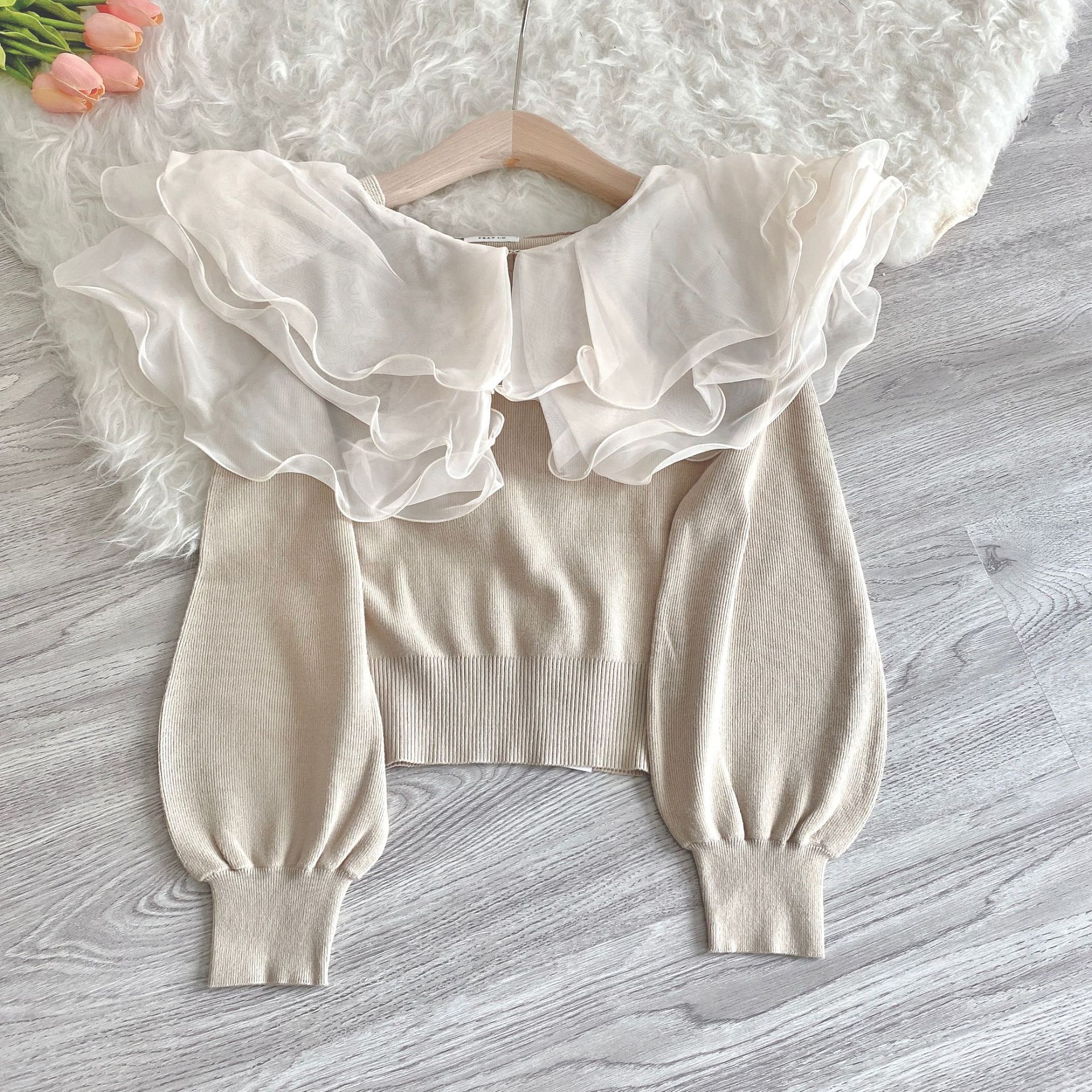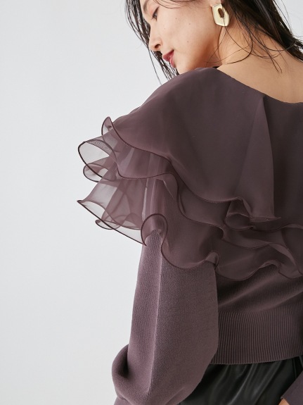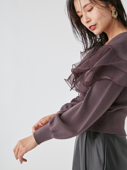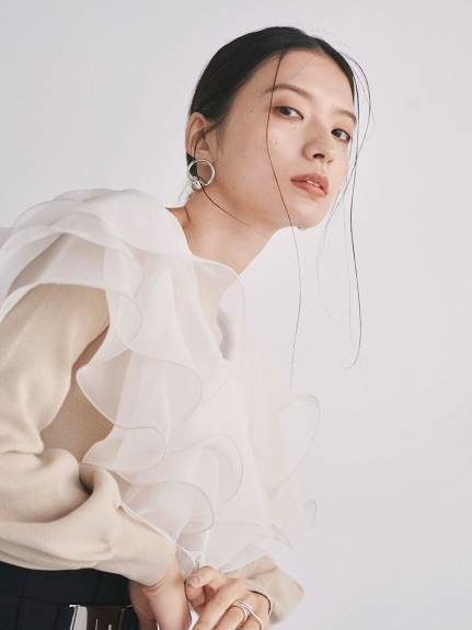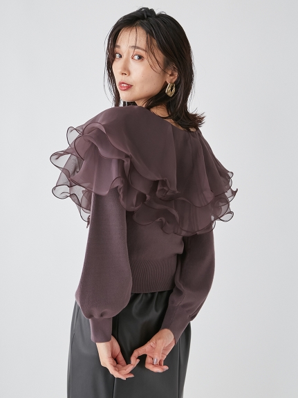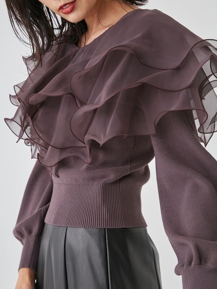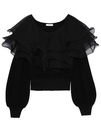 程よいフィット感のある着心地の良いニットと、オーガンジー仕上げのフリルカラーを微配色でドッキングしたコンビデザインで、瞬時にコーディネートが華やぐ一枚です。