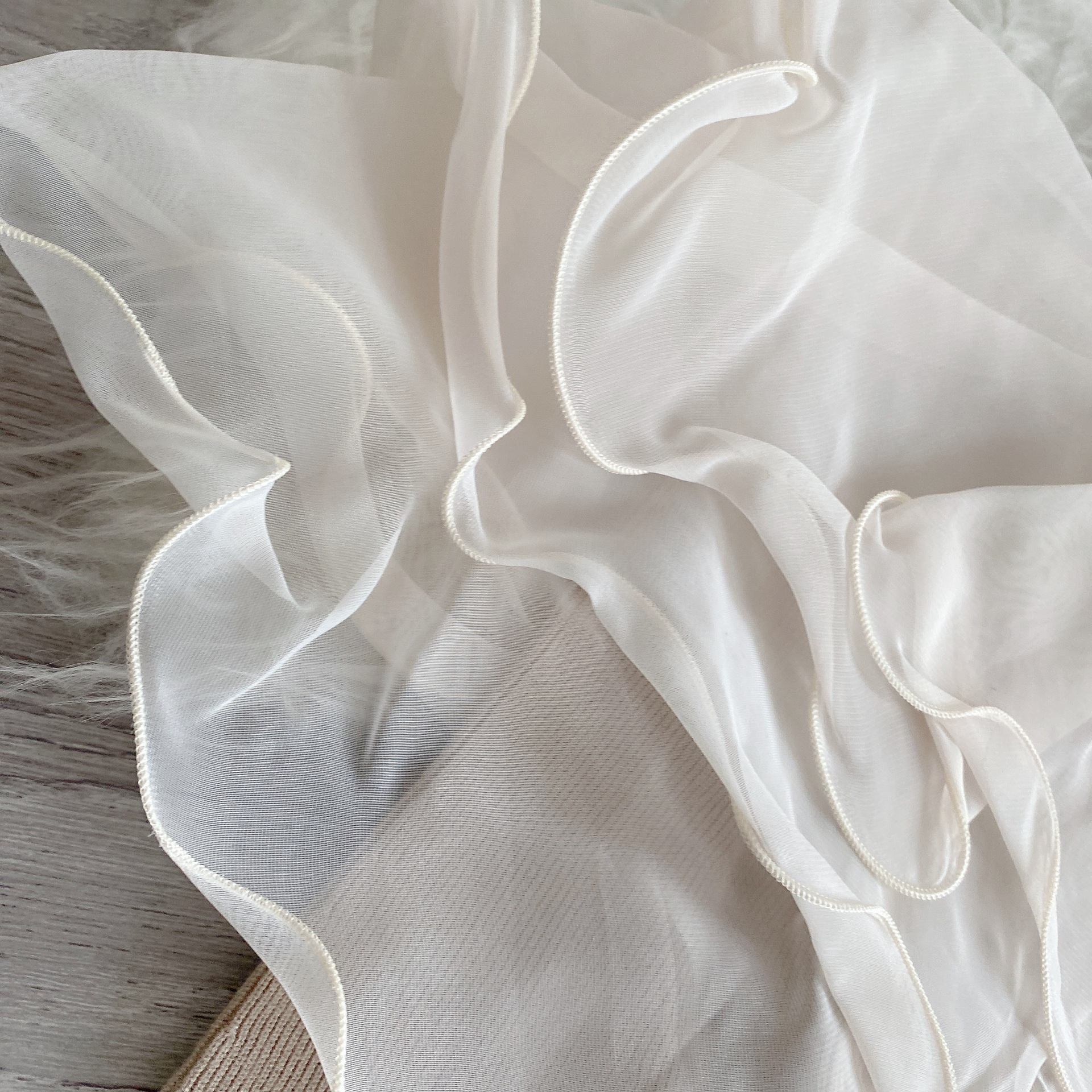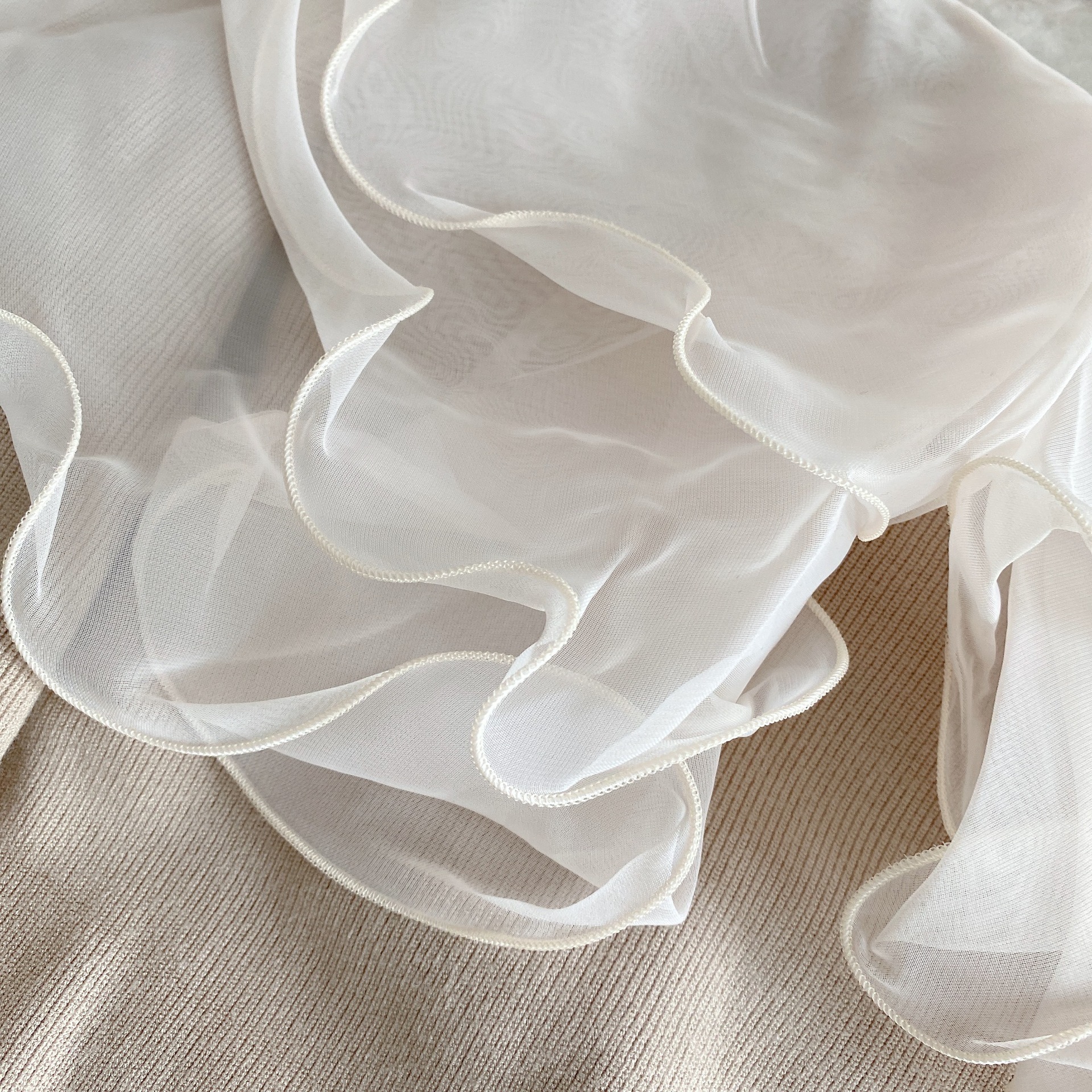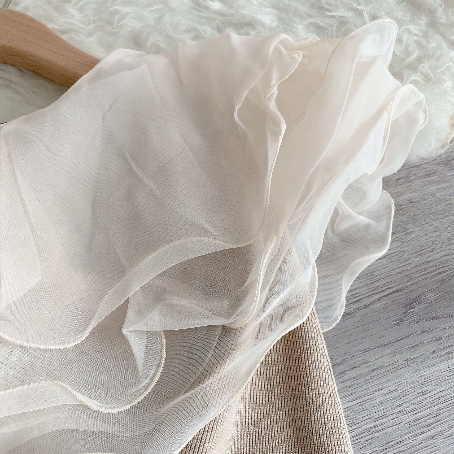程よいフィット感のある着心地の良いニットと、オーガンジー仕上げのフリルカラーを微配色でドッキングしたコンビデザインで、瞬時にコーディネートが華やぐ一枚です。
