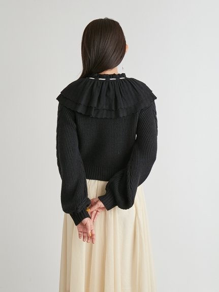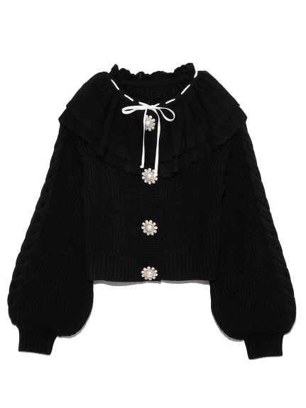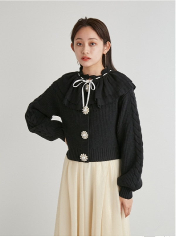 配色のベロアリボンをあしらったダブルカラーがクラシカルなニットカーディガン。ギャザーを寄せてフリルを作り、フェミニンな印象に仕上げました。ジュエリーのようなパールボタンで華やかさをプラスし、ふんわりとしたボリュームスリーブにはケーブル柄を入れ、表情の違いを楽しめるデザインに。デイリーに活躍するアイテムなのでスカートは勿論、あえてデニムに合わせてカジュアルダウンしたスタイリングもおすすめです。