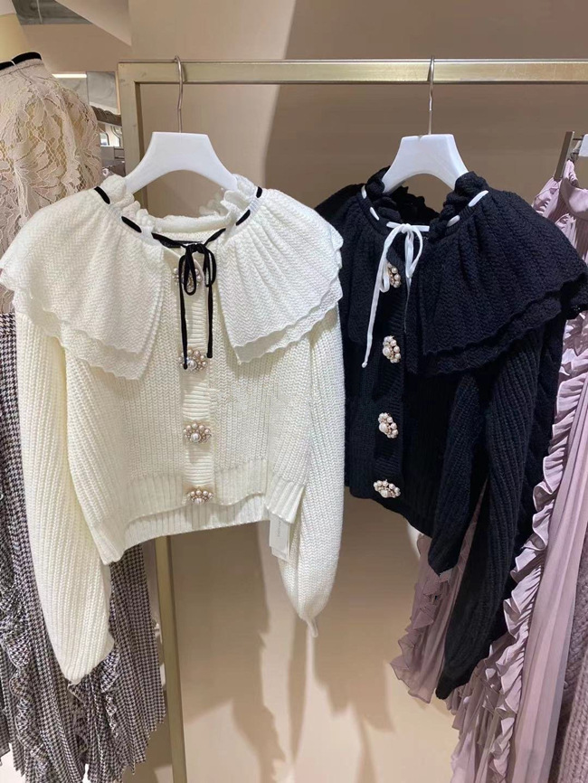 身頃と袖は畦編みのニットでふんわりとしたフォルムに、襟はボリュームを抑えた別糸の柄編みで仕上げました。パールボタンはスナップ式なので美しいシルエットをキープします。フェミニンなオフホワイト、モードなブラックの2色でご用意しました。プルオーバーとしてもお楽しみいただけます。