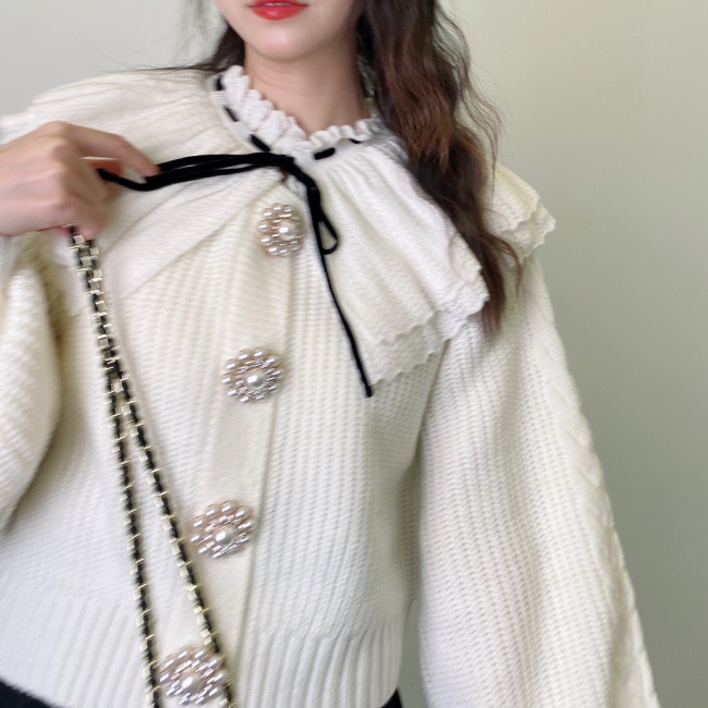 【リュクスなパールボタンに存在感のあるダブルカラーが目を引くニットカーディガン】