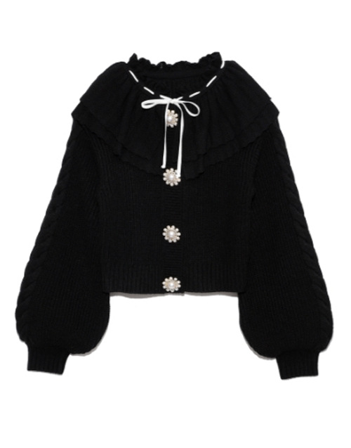 配色のベロアリボンをあしらったダブルカラーがクラシカルなニットカーディガン。ギャザーを寄せてフリルを作り、フェミニンな印象に仕上げました。ジュエリーのようなパールボタンで華やかさをプラスし、ふんわりとしたボリュームスリーブにはケーブル柄を入れ、表情の違いを楽しめるデザインに。デイリーに活躍するアイテムなのでスカートは勿論、あえてデニムに合わせてカジュアルダウンしたスタイリングもおすすめです。