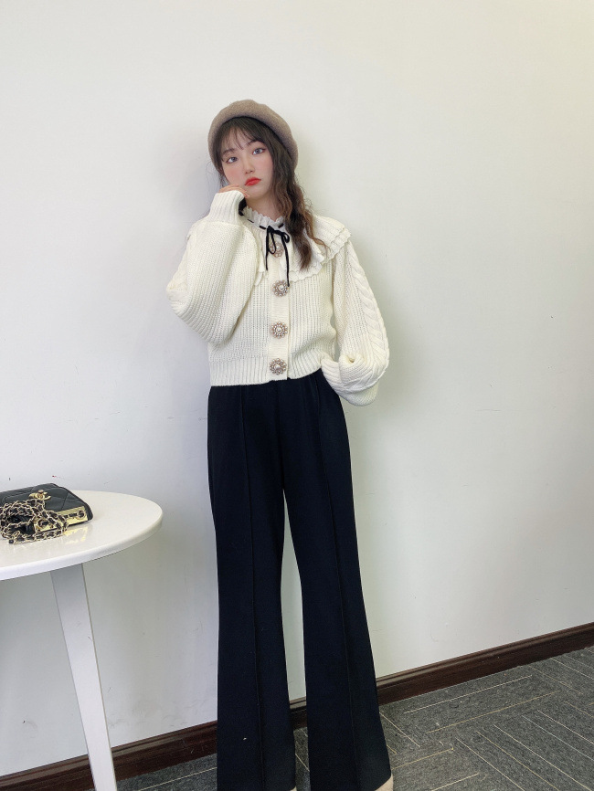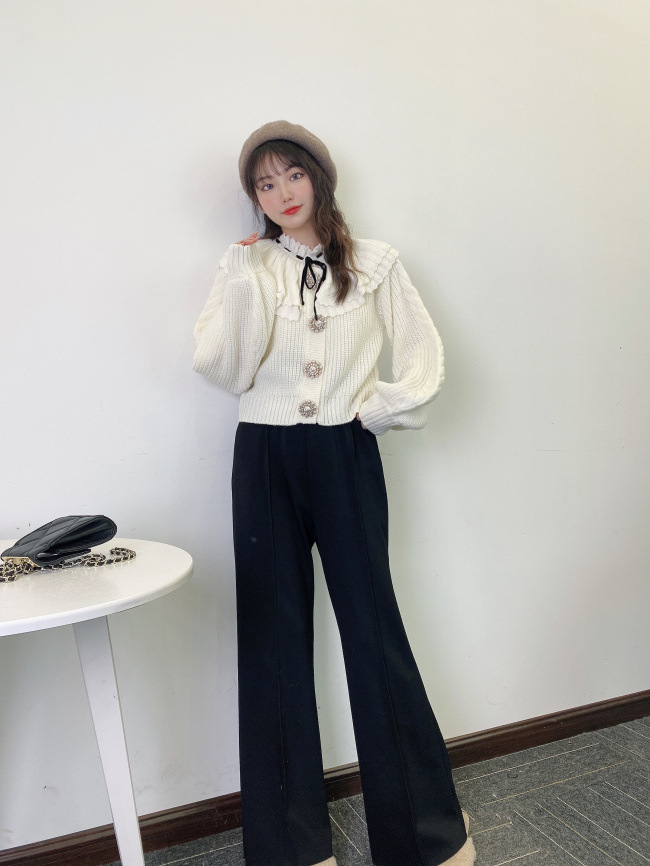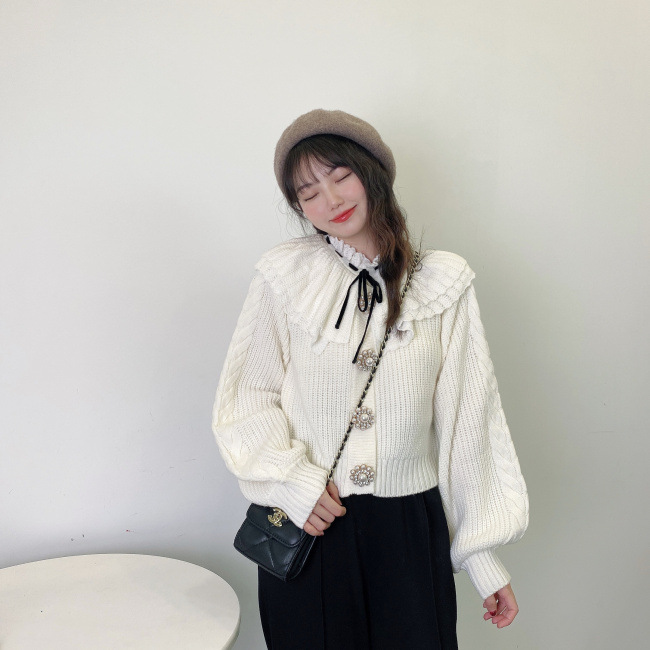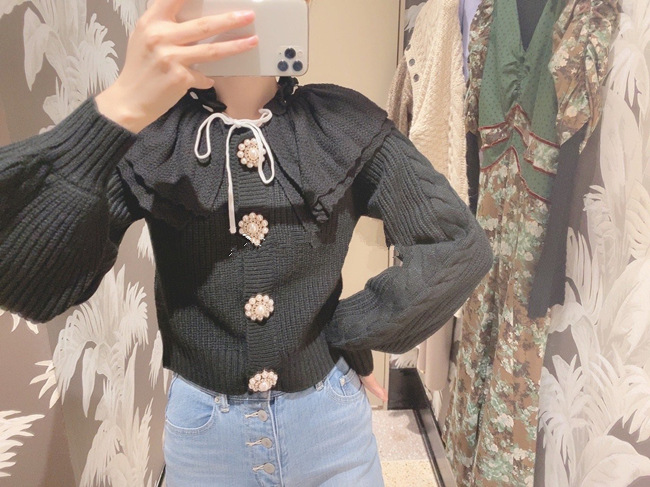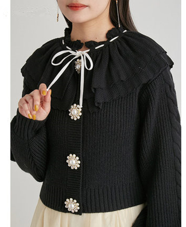 身頃と袖は畦編みのニットでふんわりとしたフォルムに、襟はボリュームを抑えた別糸の柄編みで仕上げました。パールボタンはスナップ式なので美しいシルエットをキープします。フェミニンなオフホワイト、モードなブラックの2色でご用意しました。プルオーバーとしてもお楽しみいただけます。