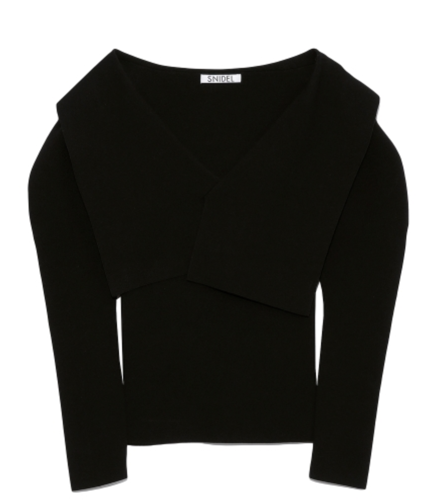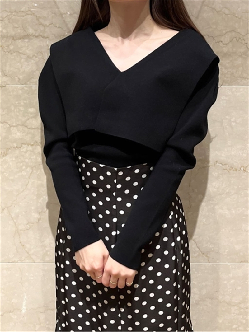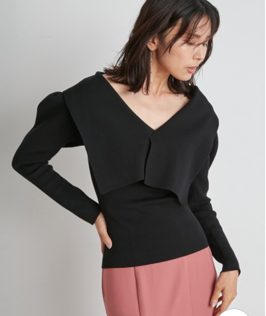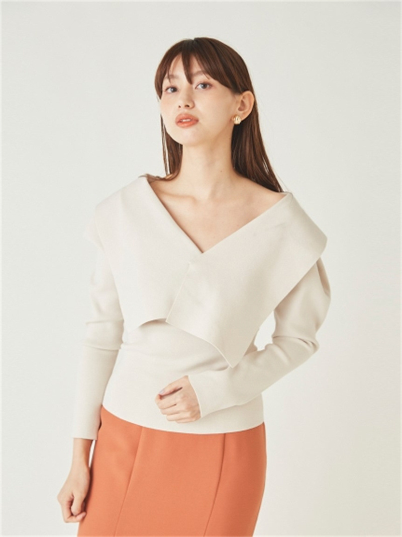 トレンドのビックカラーをモチーフに、アシンメトリーデザインでモードな要素もプラスしたリブニット。ビックカラーは甘く見えないよう工夫を凝らし、シャープな襟先や総針編みできりっとハンサムな印象に仕上げました。深めのVネックがデコルテラインを美しく魅せ、華やかなパフスリーブとの掛け合わせでスタイリングに奥行きを演出。ボディはすっきりと仕上げ、トップスインしやすいシルエットです。