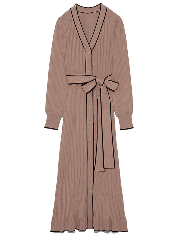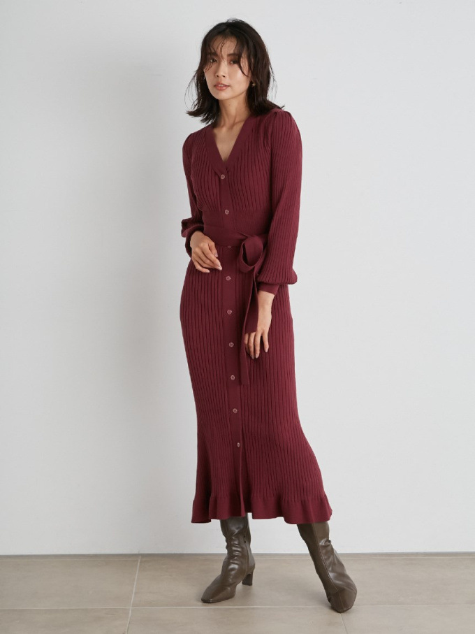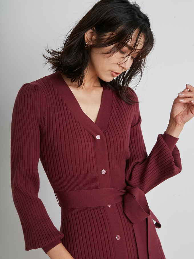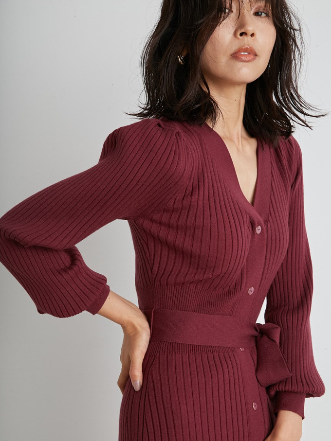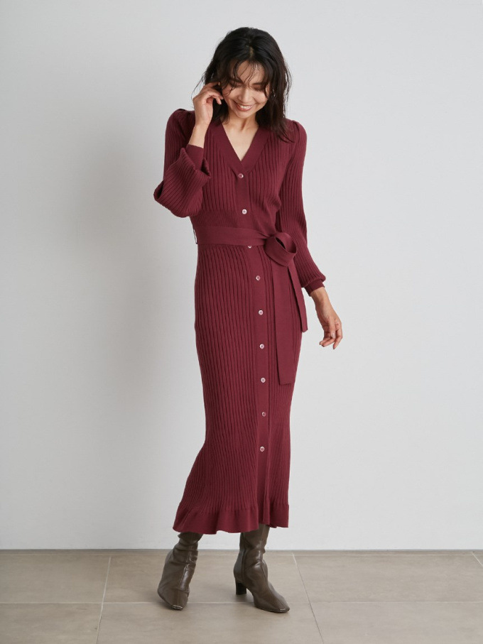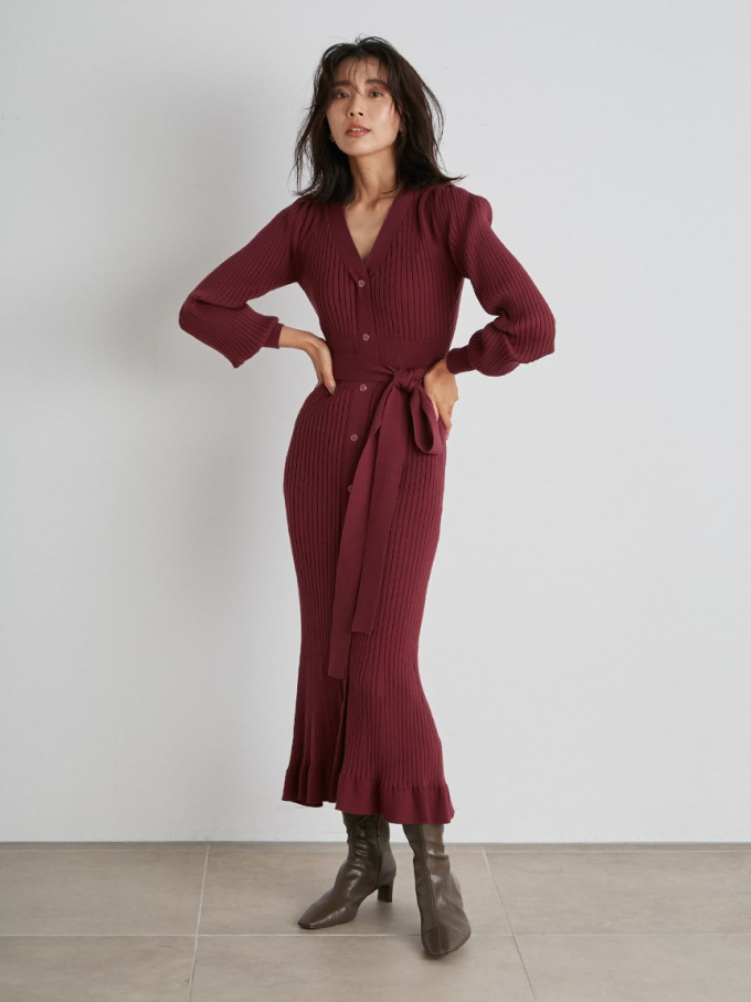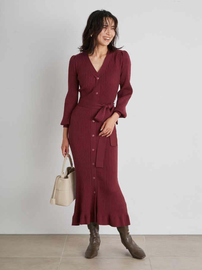 「SNIDEL」で長く愛されているフロントボタンニットワンピースに、パイピングなどのクラシカルなディティールを加え今季らしいデザインに。肩や袖にボリュームを出すことでコンサバ見えを防ぎ、従来より着丈を長くすることでどんな身長の方も着やすいようアップデートしました。深めのVネックがデコルテに色香を与え、ボディラインを美しく魅せるマーメイドとウエストベルトでとことんレディな印象に。程良く厚手のニットを使用しているので、身体を拾いすぎず安心して着ていただけます。