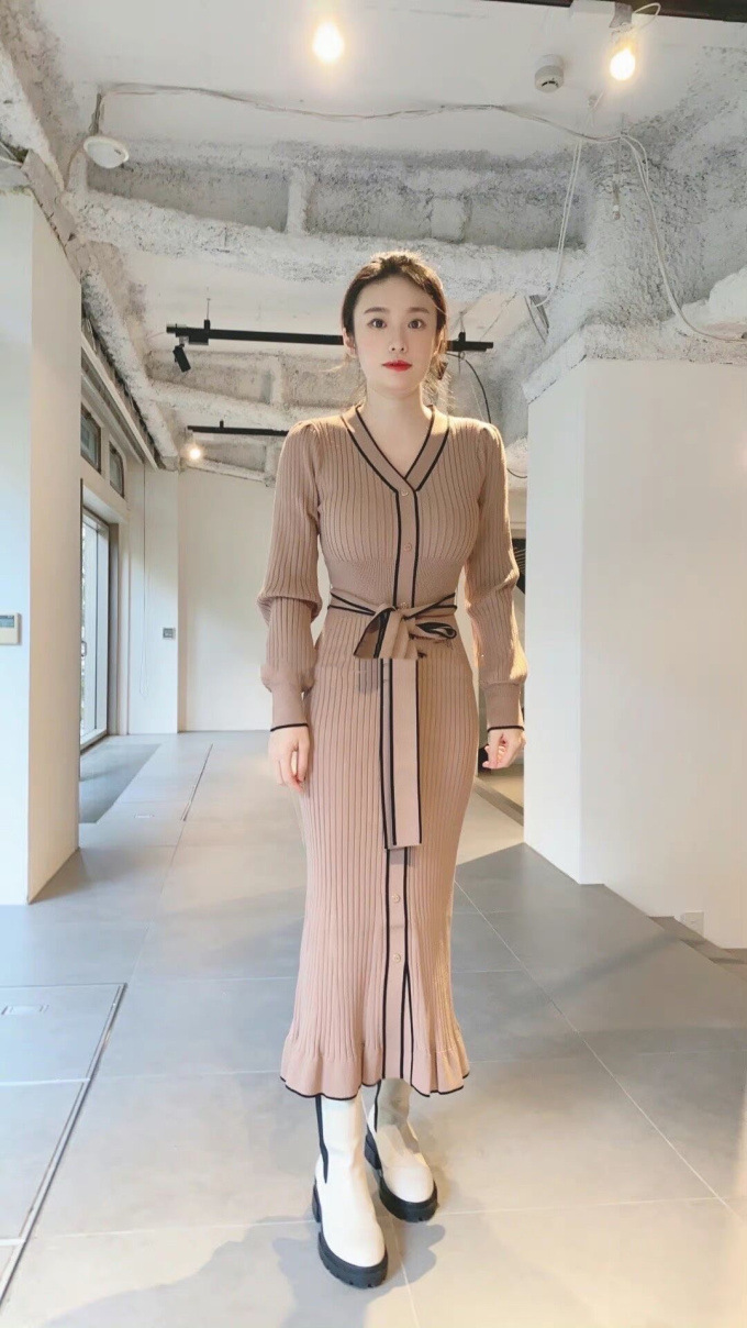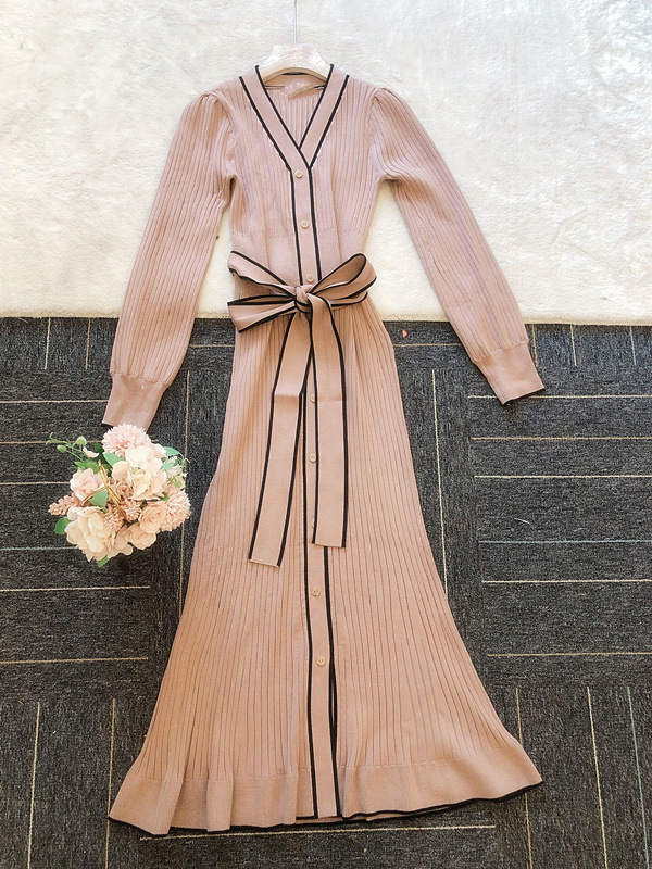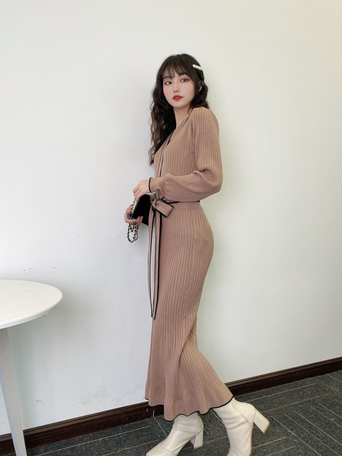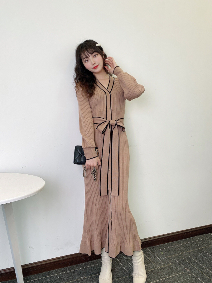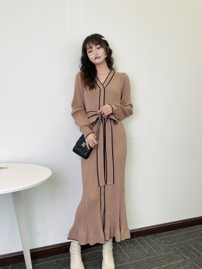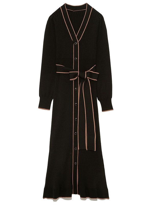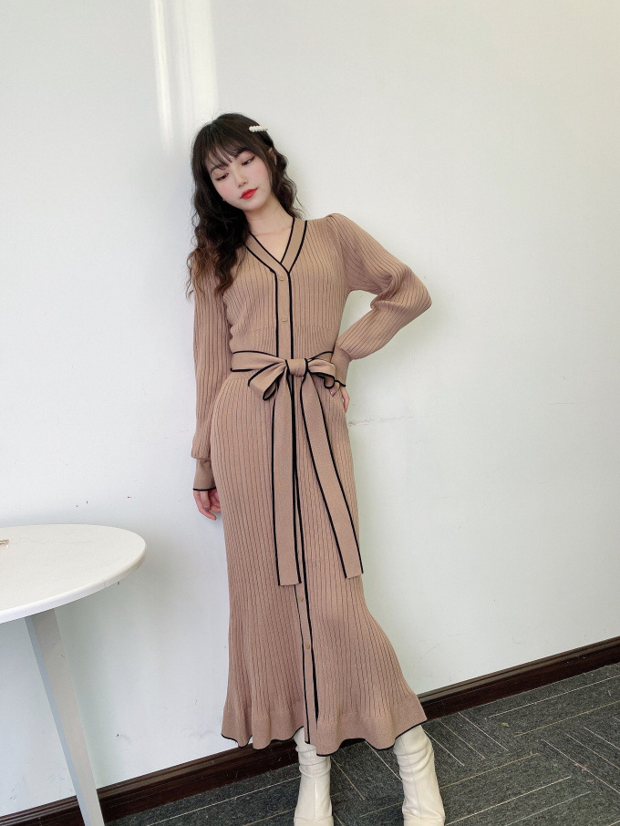 「SNIDEL」で長く愛されているフロントボタンニットワンピースに、パイピングなどのクラシカルなディティールを加え今季らしいデザインに。肩や袖にボリュームを出すことでコンサバ見えを防ぎ、従来より着丈を長くすることでどんな身長の方も着やすいようアップデートしました。深めのVネックがデコルテに色香を与え、ボディラインを美しく魅せるマーメイドとウエストベルトでとことんレディな印象に。程良く厚手のニットを使用しているので、身体を拾いすぎず安心して着ていただけます。