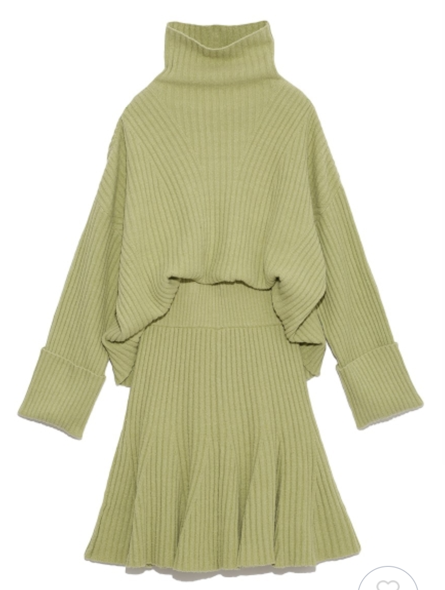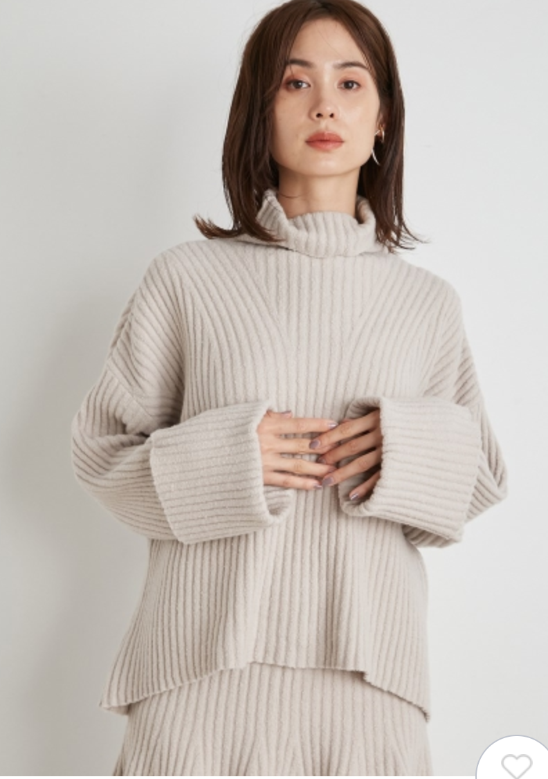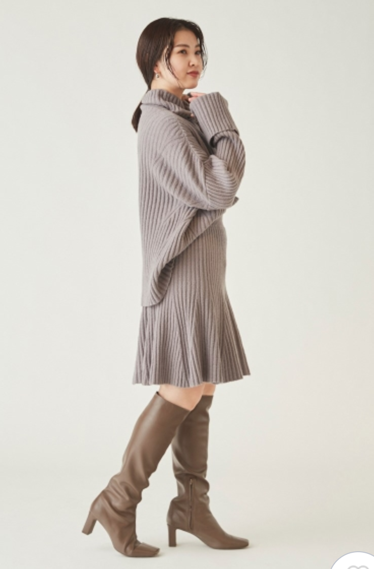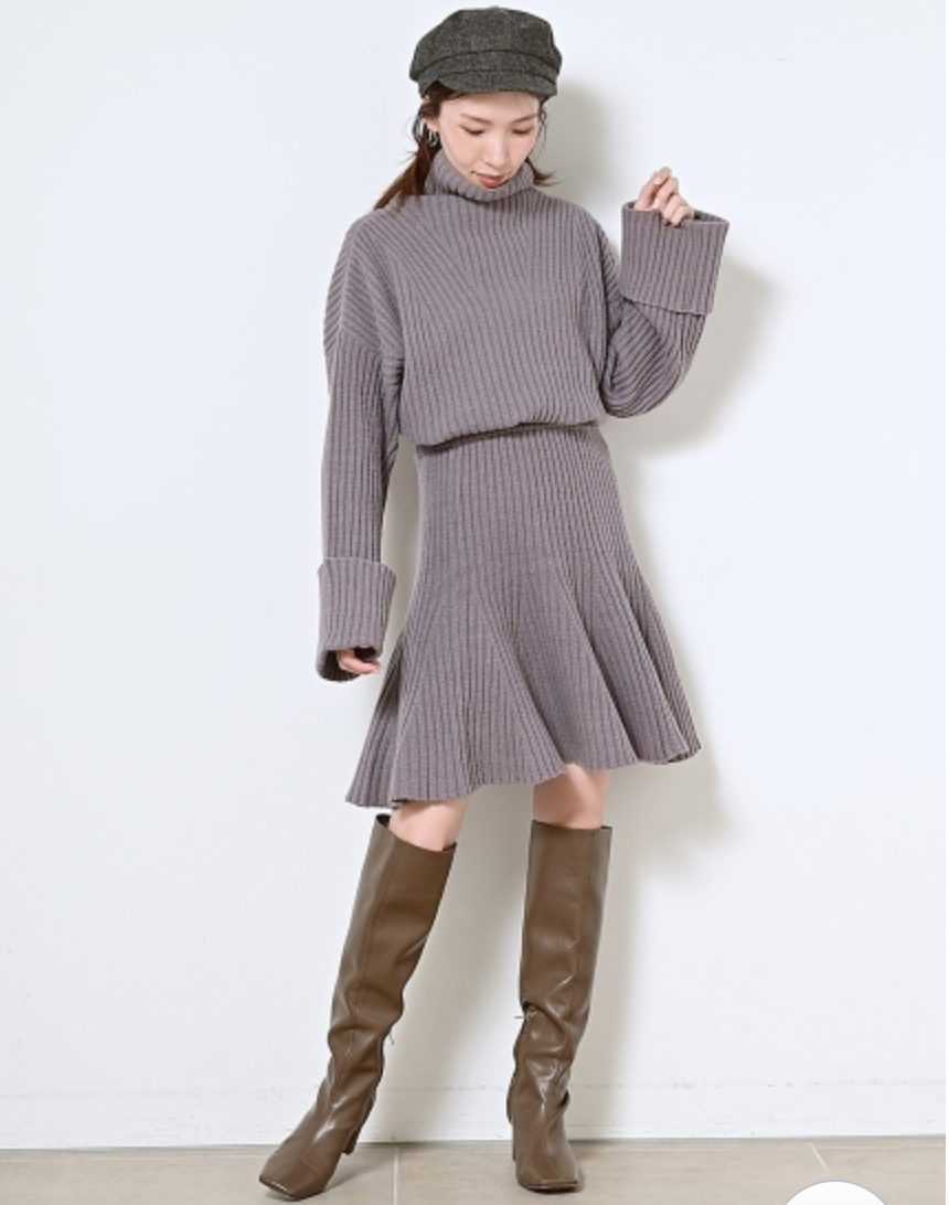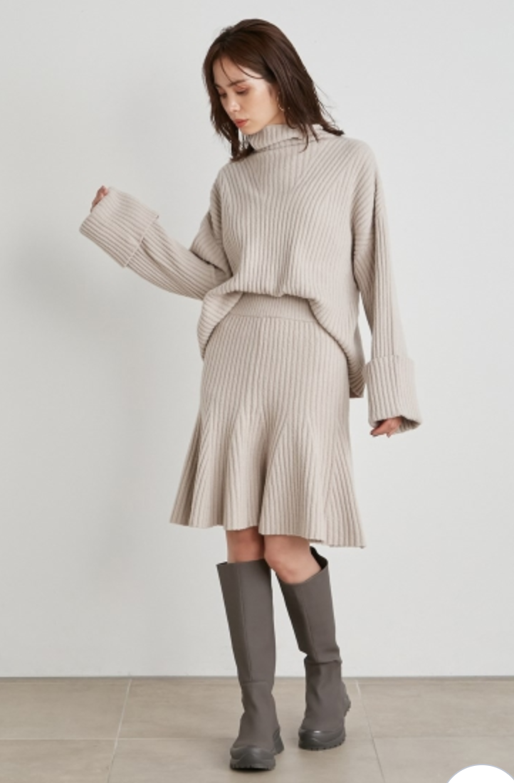 立体感のある太めのリブ編みが印象的なニットセットアップ。トップスは大きなタートルネックと折り返しのワイドスリーブで、ゆるっとラフな雰囲気に仕上げました。ロングブーツと相性の良い膝丈デザインのスカートは、裾にかけて広がるフレアシルエットでフェミニンな印象に。トップスはアウトでも前だけインでも、ミニマルに愛らしく着用いただけます。