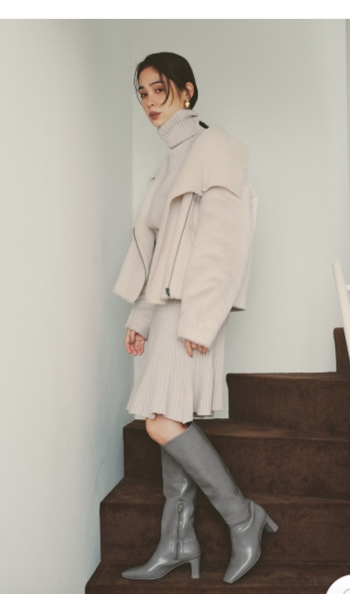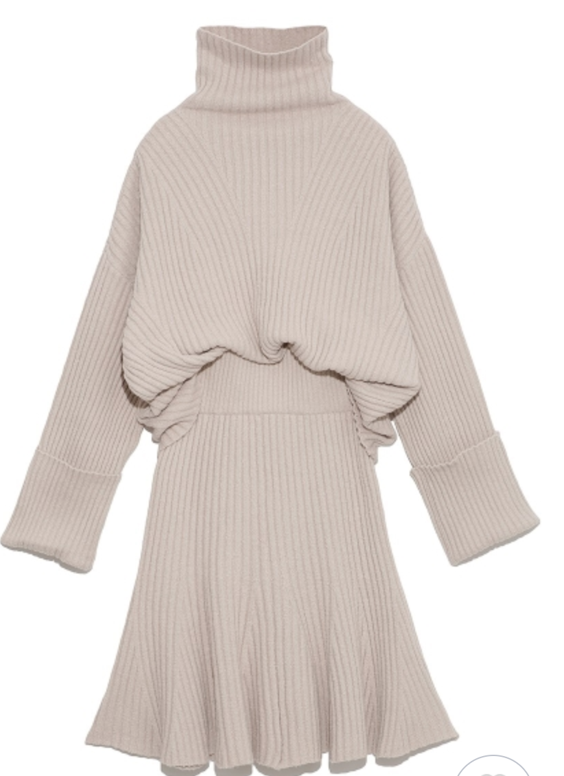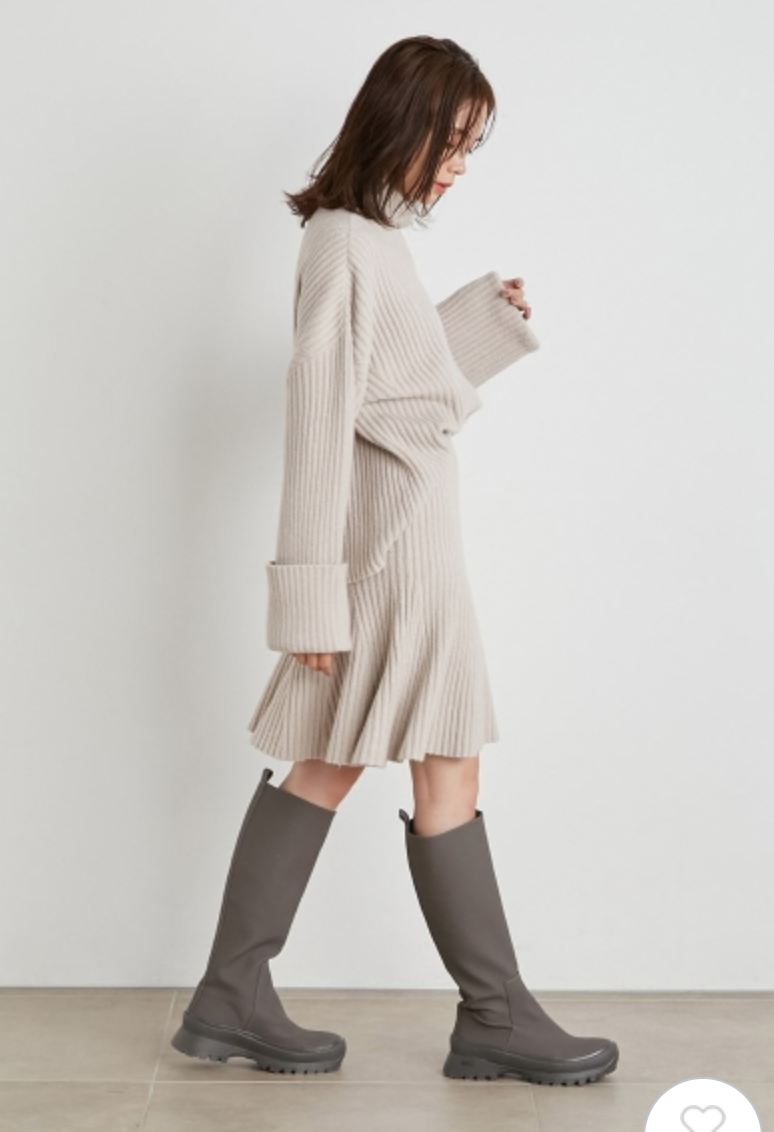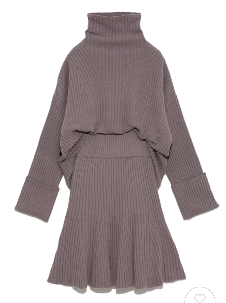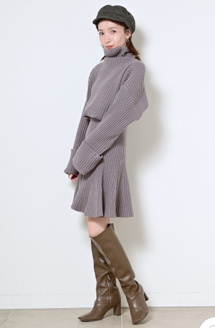 立体感のある太めのリブ編みが印象的なニットセットアップ。トップスは大きなタートルネックと折り返しのワイドスリーブで、ゆるっとラフな雰囲気に仕上げました。ロングブーツと相性の良い膝丈デザインのスカートは、裾にかけて広がるフレアシルエットでフェミニンな印象に。トップスはアウトでも前だけインでも、ミニマルに愛らしく着用いただけます。