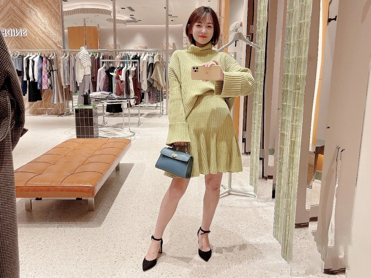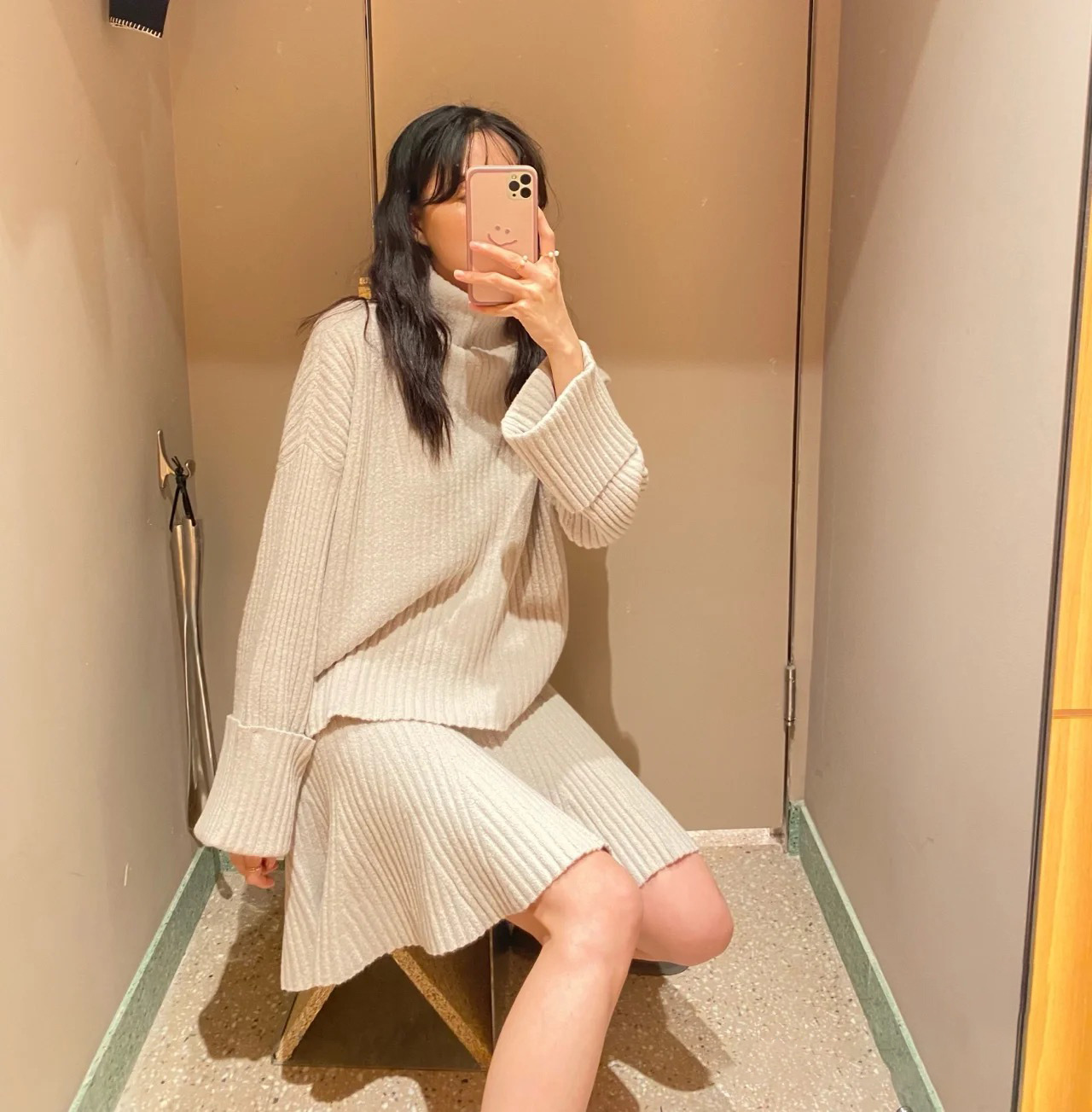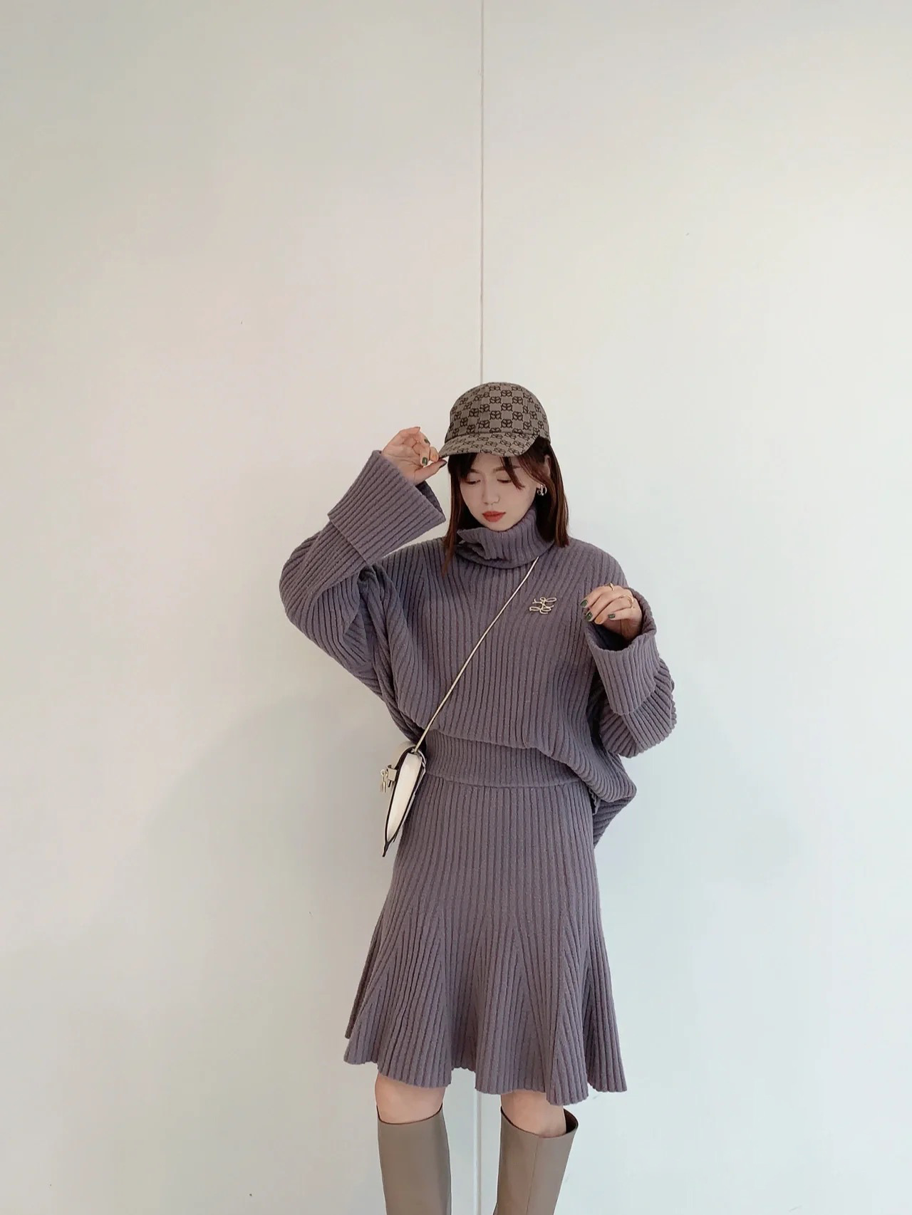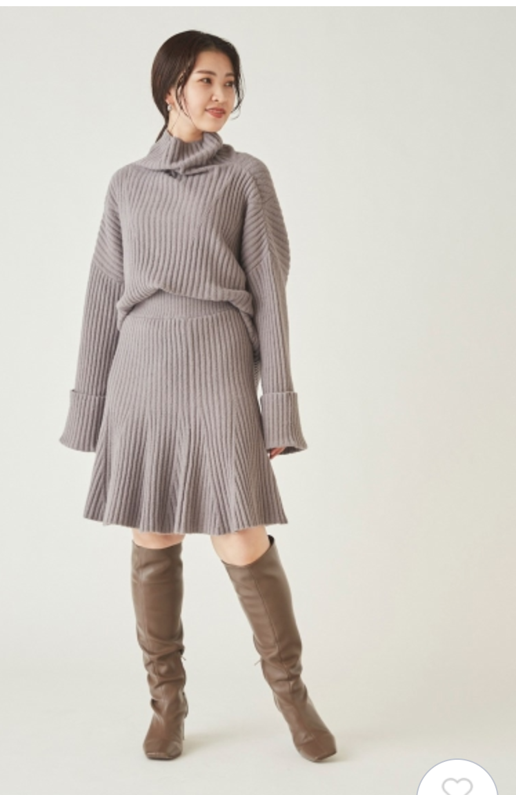 【ミニマルで愛らしいタートル×膝丈スカートのニットセットアップ】