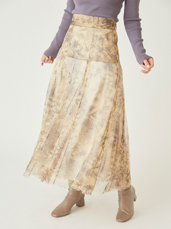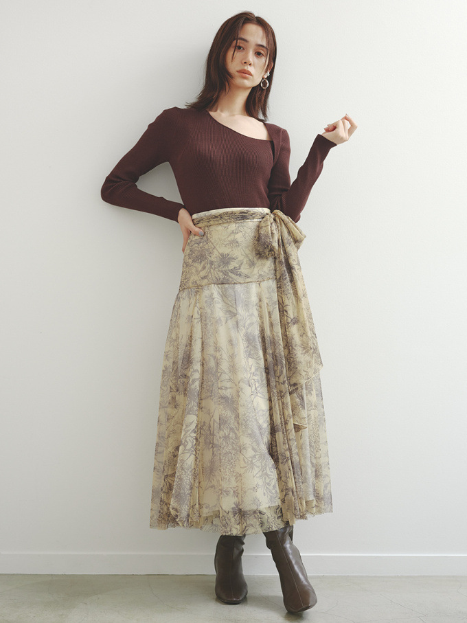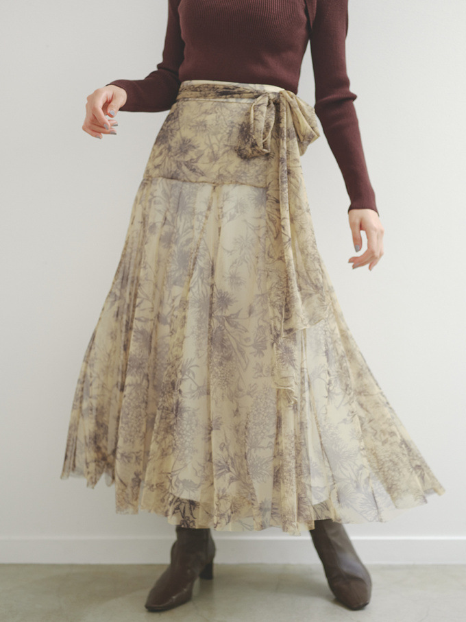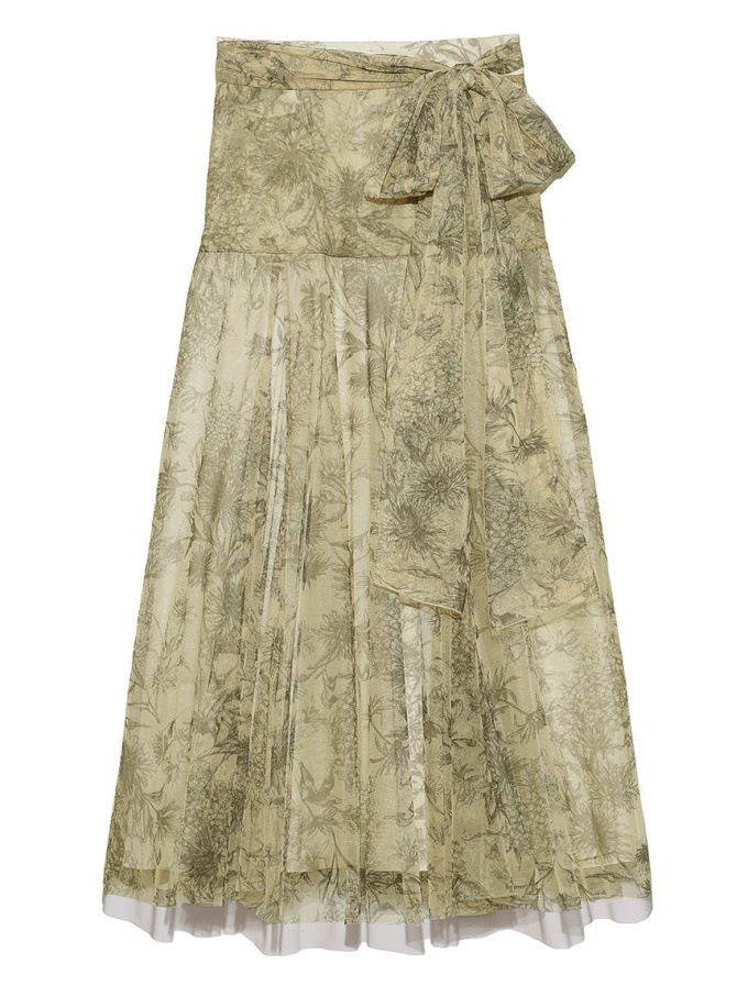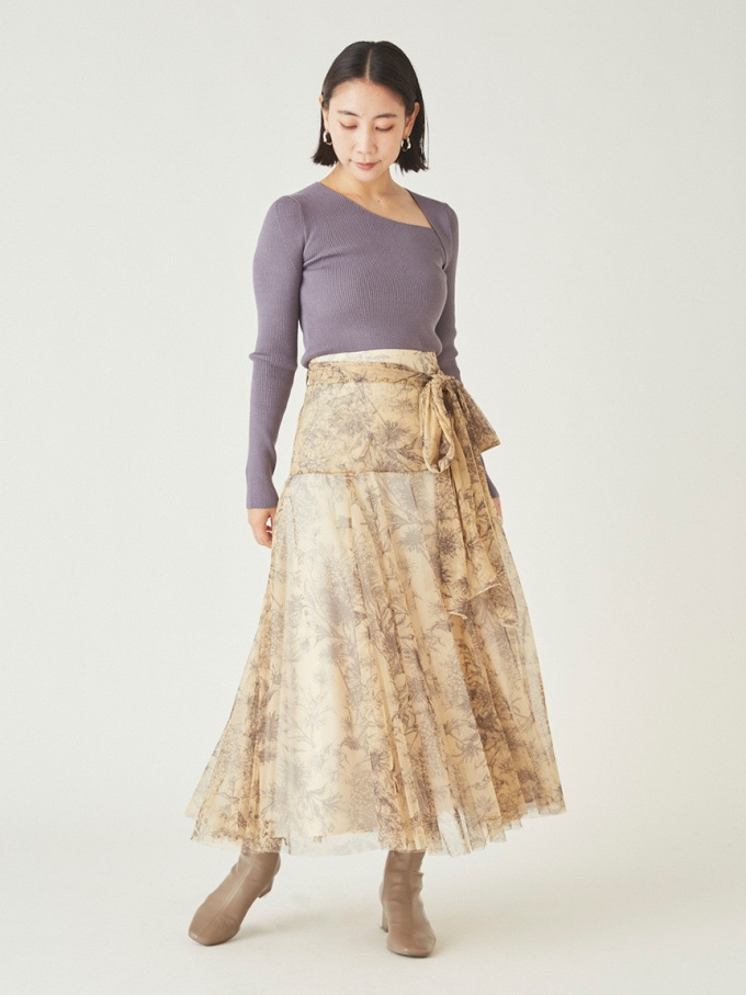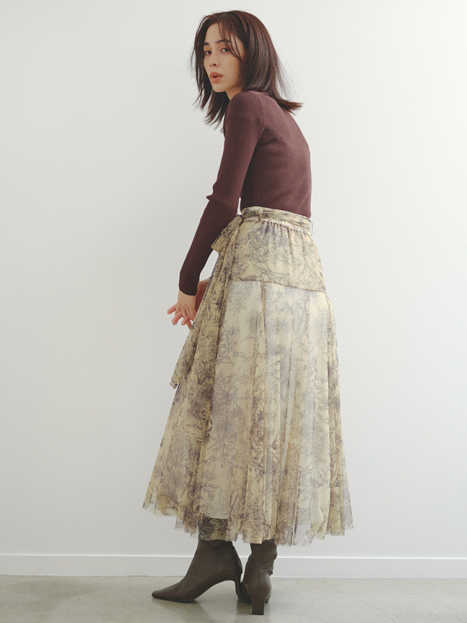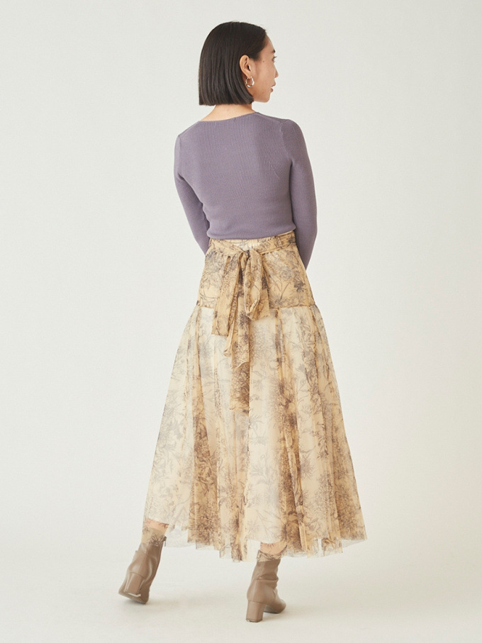 クリスマスのホリデーシーズンから春にかけ、幅広いシーンにお使いいただけるチュールスカート。ウエストからヒップにかけてすっきりと仕上げ、チュールの膨らみを抑えることで着膨れしない美しいシルエットを実現しました。ウエストには表地と同じ生地のリボンをワンポイントであしらい、取り外しが可能なのでシーンに合わせてアレンジいただけます。コーディネートに華をプラスする、ヴィンテージライクな花柄が一押しです。