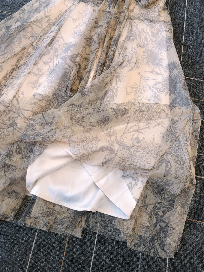 軽やかな布帛生地に、透け感のあるチュールを重ねました。無地のライトグレーとピンク、ヴィンテージな花柄の3色展開です。