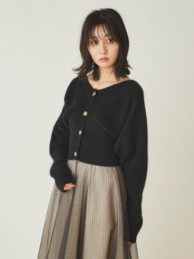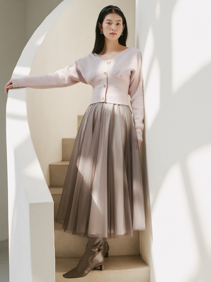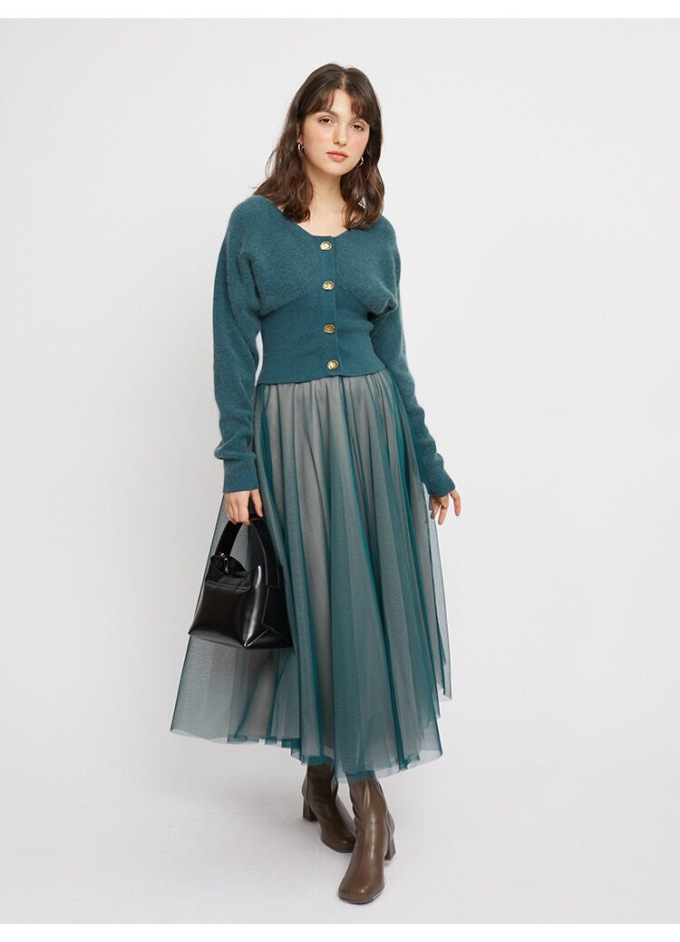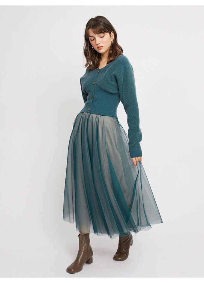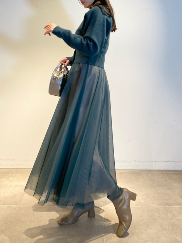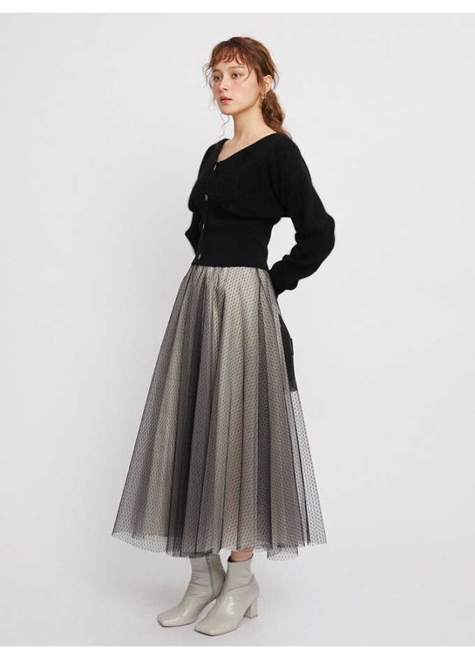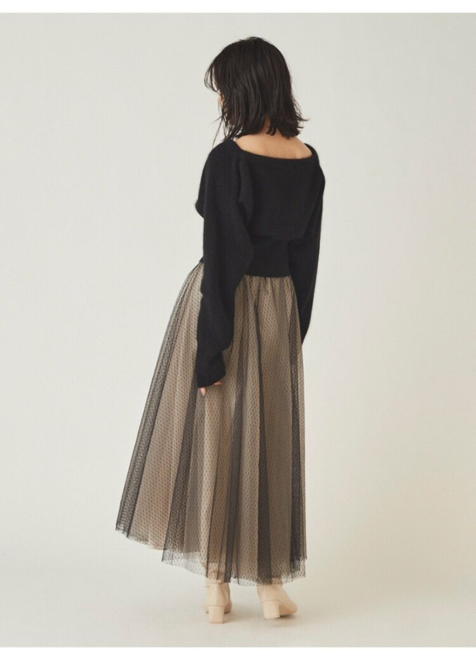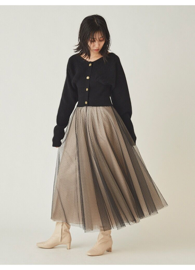 ニットにはやや起毛感のある柔らかな糸を、スカートは繊細なチュールと張りのある布帛生地を2層に重ねました。ライトピンク、グリーン、ブラックの3色展開です。