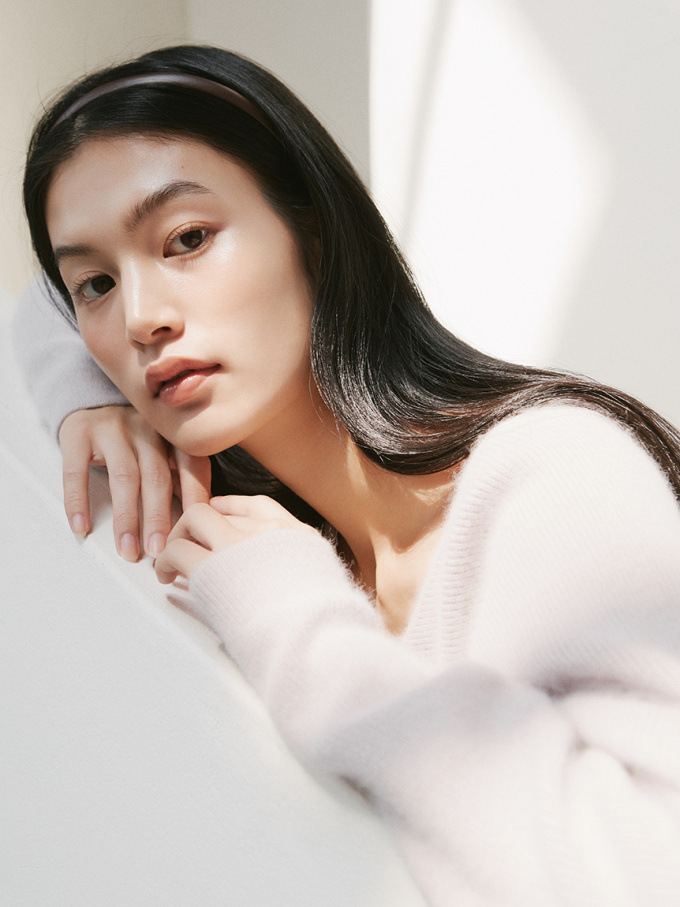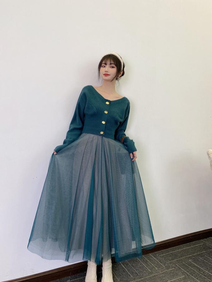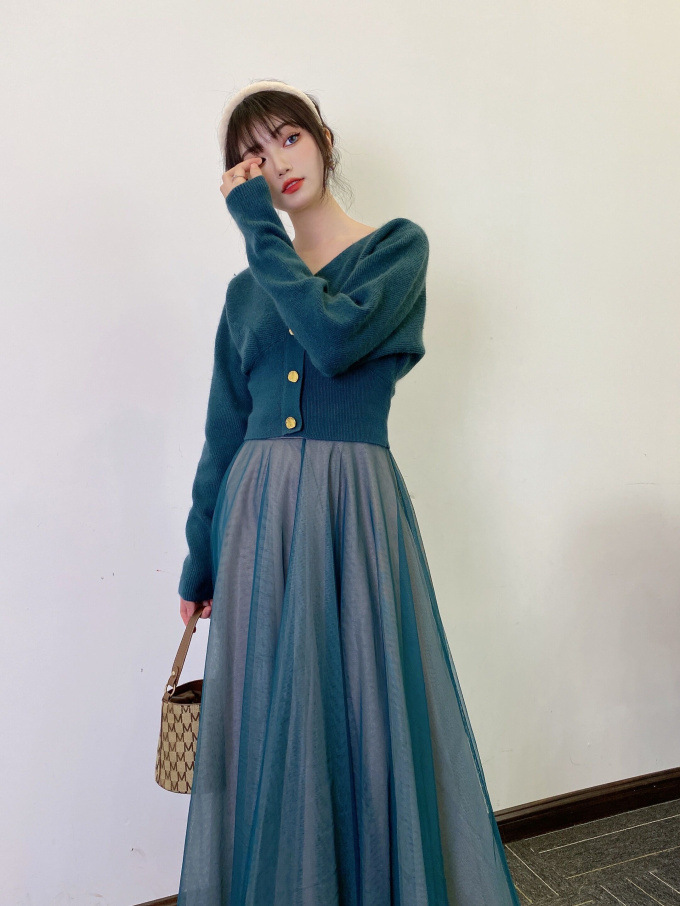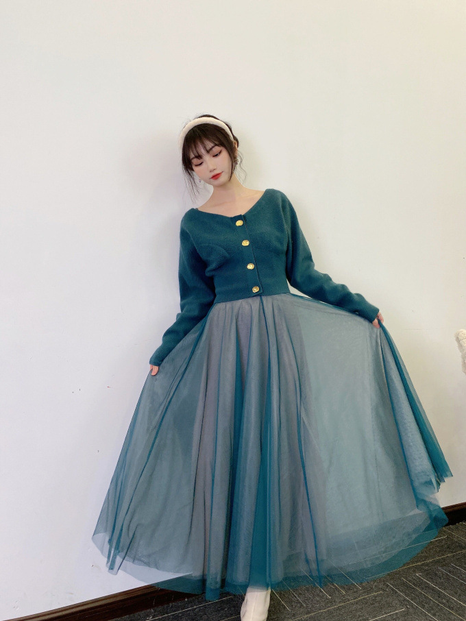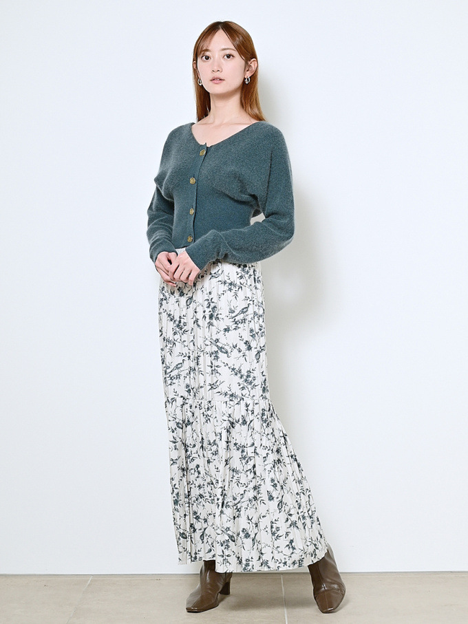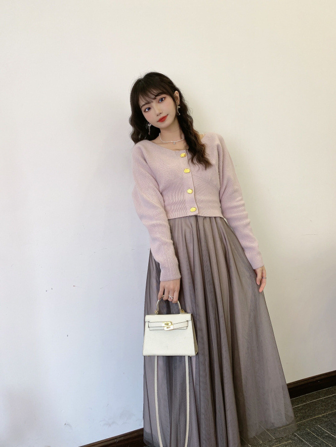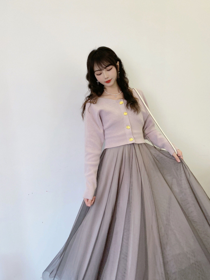 ニットにはやや起毛感のある柔らかな糸を、スカートは繊細なチュールと張りのある布帛生地を2層に重ねました。ライトピンク、グリーン、ブラックの3色展開です。